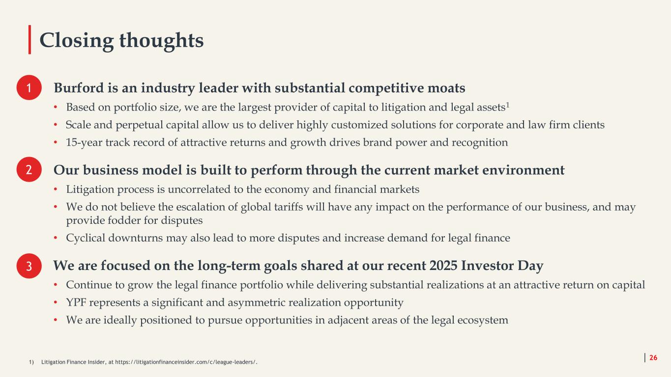 收盘思考26 Burford是一家行业领先企业,拥有强大的竞争护城河•基于投资组合规模,我们是诉讼和法律资产的最大资本提供者1 •规模和永久资本使我们能够为公司和律师事务所客户提供高度定制的解决方案• 15年的业绩记录具有吸引力的回报和增长推动了品牌力和认可度我们的商业模式是为在当前市场环境中发挥作用而构建的•诉讼程序与经济和金融市场不相关•我们认为全球关税的升级不会对我们的业务表现产生任何影响,并可能为纠纷提供素材•周期性低迷也可能导致更多纠纷并增加对法律融资的需求我们专注于在最近的2025年投资者日上分享的长期目标•继续扩大法律融资组合,同时以具有吸引力的资本回报率实现可观的变现• YPF代表着重要且不对称的变现机会•我们处于理想的位置,可以在法律生态系统的相邻领域寻求机会1231)Litigation Finance Insider,网址为https://litigationfinanceinsider.com/c/league-leaders/。