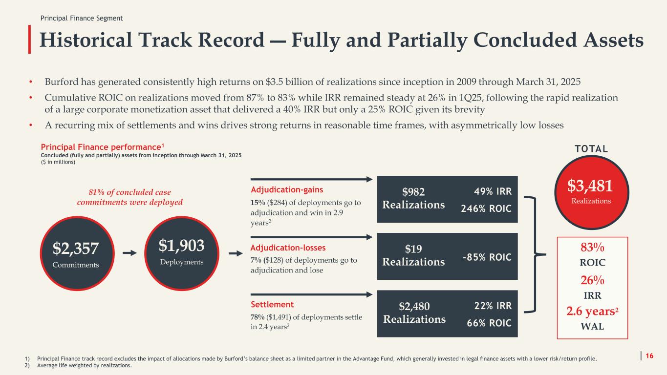 历史业绩记录——全部和部分结束的资产16美元收回889美元收回956美元收回本金财务业绩1从成立到3月31日结束的(全部和部分)资产,2025年(百万美元)81%的已完成案件承诺被部署2357美元承诺裁决-损失78%(1491美元)的部署在2.4年内达成和解2和解7%(128美元)的部署进入裁决,损失15%(284美元)的部署进入裁决并在2.9年内获胜2裁决-收益982美元实现49% IRR 246% ROIC 1,903美元部署3,481美元实现19美元实现-85 % ROIC 2,480美元实现22% IRR 66% ROIC 83% ROIC 26% IRR 2.6年2 WAL Total • Burford自2009年成立以来截至3月31日,已实现了35亿美元的持续高回报,2025 •变现的累计ROIC从87%上升到83%,而IRR在25年第一季度稳定在26%,原因是大型企业货币化资产快速变现,该资产的内部收益率为40%,但鉴于其简洁性仅有25%的ROIC •结算和获胜的经常性组合推动了在合理时间范围内的强劲回报,损失不对称地低1)信安财务业绩记录不包括Burford作为Advantage Fund的有限合伙人的资产负债表进行的分配的影响,该基金一般投资于风险/回报状况较低的法律金融资产。2)变现加权平均寿命。信安财务分部16