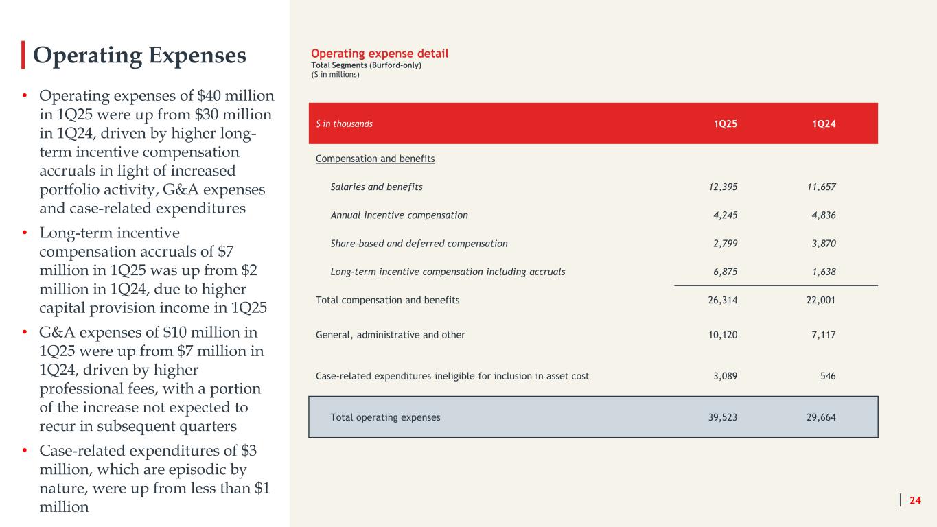 运营费用以千美元计1Q25 1Q24薪酬和福利工资和福利12,39511,657年度激励薪酬4,2454,836股权激励和递延薪酬2,7993,870长期激励薪酬,包括应计费用6,8751,638薪酬和福利总额26,31422,001一般、行政和其他10,1207,117与案件相关的支出不符合纳入资产成本的条件3,089546总运营费用39,52329,66424运营费用详情总分部(仅伯福德)(百万美元)•运营费用为4,000万美元,高于24年1季度的3,000万美元,原因是鉴于投资组合活动增加,长期激励薪酬应计增加,G & A费用和与案件相关的支出• 25年第一季度应计长期激励薪酬为700万美元,高于24年第一季度的200万美元,原因是25年第一季度的资本拨备收入增加• 25年第一季度的G & A费用为1000万美元,高于24年第一季度的700万美元,原因是专业费用增加,预计增加的一部分不会在随后几个季度出现•与案件相关的支出为300万美元,这是偶发性的,高于不到100万美元