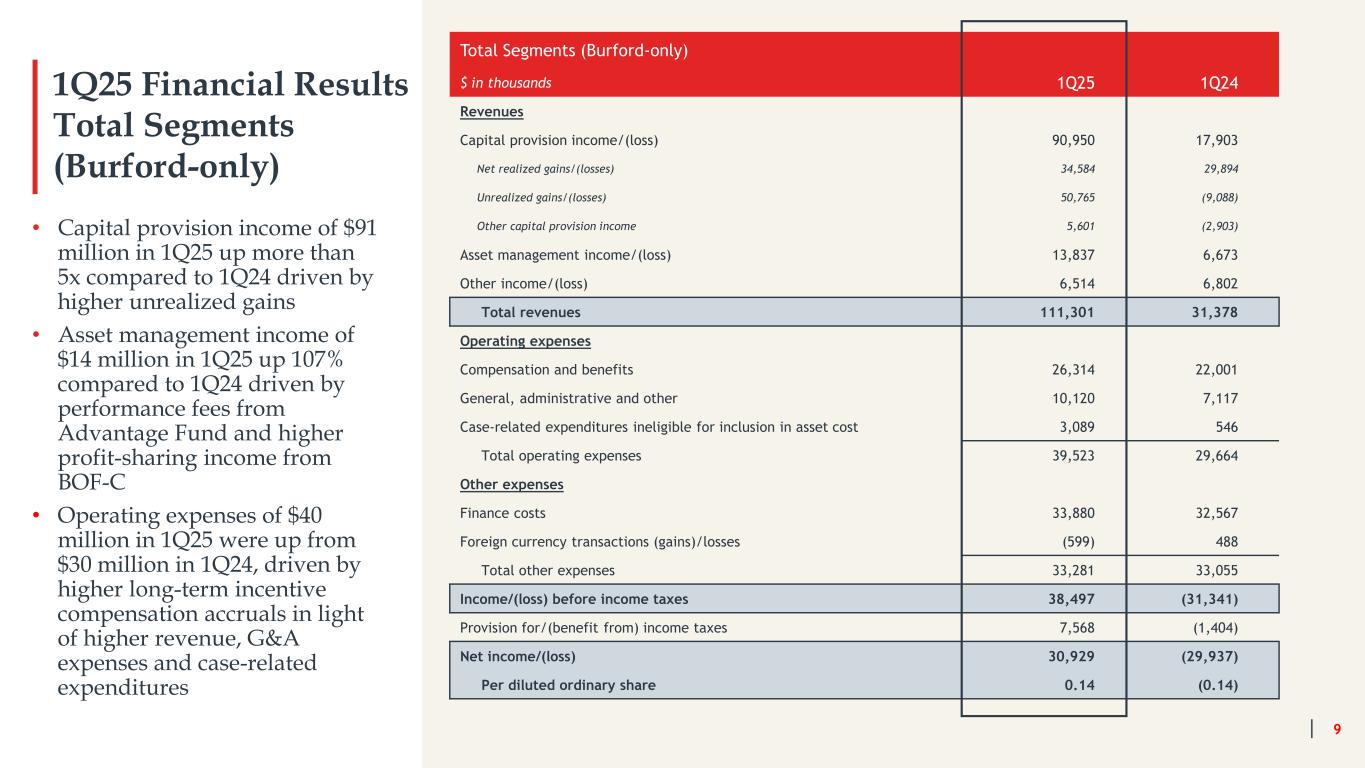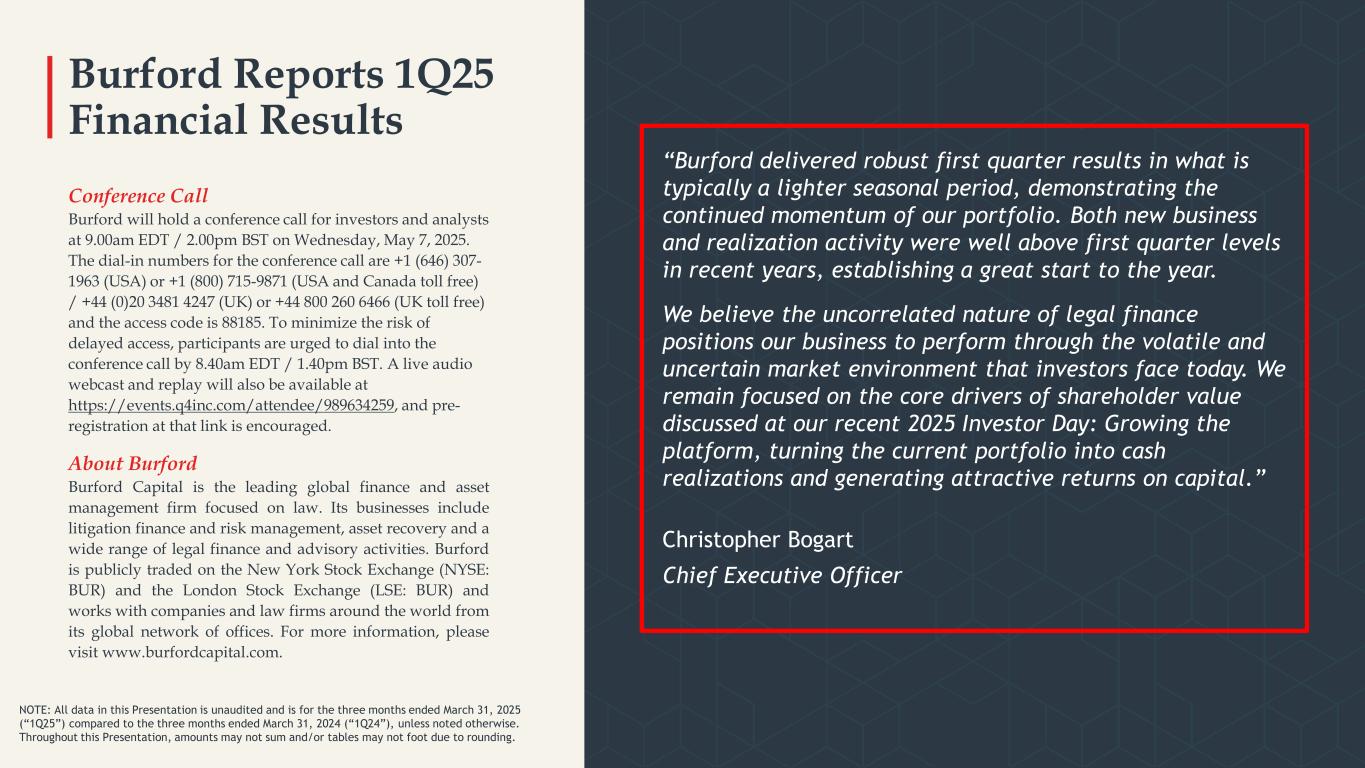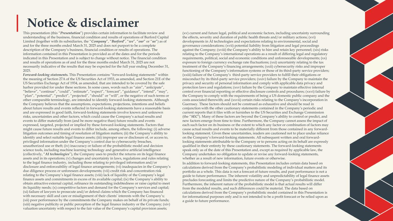 注意&免责声明本演示文稿(本“演示文稿”)提供某些信息,以便于审查和了解Burford Capital Limited(连同其附属公司,“公司”、“Burford”、“我们”、“我们的”或“我们”)截至2025年3月31日止三个月的业务、财务状况和经营业绩,并且并不旨在完整描述公司的业务、财务状况或经营业绩。本演示文稿中包含的信息是截至本演示文稿所示日期和期间提供的,如有更改,恕不另行通知。截至2025年3月31日止三个月的财务状况和经营业绩不一定代表2025年12月31日止全年的预期业绩。前瞻性陈述。本演示文稿包含经修订的1933年美国证券法第27A条和经修订的1934年美国证券交易法第21E条含义内的“前瞻性陈述”,旨在涵盖在这些条款规定的安全港范围内。在某些情况下,“目标”、“预期”、“相信”、“继续”、“可能”、“估计”、“预期”、“预测”、“指导”、“打算”、“可能”、“计划”、“潜在”、“预测”、“预计”、“应该”或“将”等词语,或此类术语或其他类似术语的否定,旨在识别前瞻性陈述。尽管公司认为前瞻性陈述中反映的关于未来结果和事件的假设、预期、预测、意图和信念有合理的基础,并且是善意表达的,但前瞻性陈述涉及已知和未知的风险、不确定性和其他因素,这可能导致公司的实际结果和事件与这些前瞻性陈述所表达、目标、预测或暗示的未来结果和事件存在重大差异(并且比这些结果和事件更负面)。可能导致未来结果和事件不同的因素包括(其中包括)以下因素:(i)不利的诉讼结果和诉讼事项解决的时间;(ii)公司识别和选择合适的合法融资资产的能力;(iii)由于网络安全漏洞、未经授权的使用或盗窃,不当使用或披露或访问公司控制下的特权信息;(iv)概率模型和决策科学工具不准确或失败,包括机器学习技术和生成人工智能(统称“AI技术”),公司用于预测其合法金融资产及其经营中的收益;(v)与合法金融行业相关的法律、法规和规则的变化和不确定性,包括与特权信息和/或法律金融安排的披露和可执行性相关的变化和不确定性;(vi)公司尽职调查过程中的不足或不可预见的发展;(vii)与公司合法金融资产相关的信用风险和集中风险;(viii)公司合法金融资产缺乏流动性和超出其可用资本的承诺;(ix)公司获得有吸引力的外部资本的能力,为其未偿债务再融资或筹集资金以满足其流动性需求;(x)竞争因素和对公司服务和资本的需求;(xi)律师未能起诉和/或为公司以必要的技能和谨慎提供资金的索赔进行辩护或其客户的利益与公司利益不一致;(xii)公司代表其私人资金作出的承诺表现不佳;(xiii)法律金融行业或公司的负面宣传或公众看法;(xiv)公司资本拨备资产公允价值的估值不确定性;(xv)当前以及未来的法律、政治和经济因素,包括围绕公共卫生威胁和/或军事行动的影响、严重性和持续时间的不确定性;(xvi)人工智能技术的发展以及与环境、社会和治理考虑相关的预期;(xvii)针对公司的诉讼和法律诉讼的潜在责任;(xviii)公司雇用和留住关键人员的能力;(xix)由于不同的法律和监管要求、政治、 社会经济状况和不可预见的事态发展;(xx)外币汇率波动风险;(xxi)与公司融资安排的税务处理有关的不确定性;(xxii)公司或其第三方服务提供商的信息系统的网络安全风险和不当运作;(xxiii)公司的第三方服务提供商未能履行其义务或其第三方服务提供商的不当行为;(xxiv)公司未能维护个人信息的隐私和安全并遵守适用的数据隐私和保护法律和法规;(xxv)公司未能保持对财务报告的有效内部控制或有效的披露控制和程序;(xxvi)公司未能遵守作为美国国内上市公司的要求及其相关成本;(xxvii)与公司在根西岛注册成立有关的某些风险。这些因素不应被解释为详尽无遗,应与公司向美国证券交易委员会(“SEC”)提交或提供的定期报告和当前报告中包含的其他警示性声明一起阅读。其中许多因素超出了公司的控制或预测能力,新的因素不时出现。此外,公司无法评估每个此类因素对其业务的影响,或任何因素或因素组合可能导致实际结果和事件与任何前瞻性陈述中包含的结果和事件存在重大差异的程度。鉴于这些不确定性,请读者注意不要过分依赖公司的前瞻性陈述。所有随后可归因于公司或代表公司行事的人的书面和口头前瞻性陈述均完全受到这些警示性陈述的明确限定。前瞻性陈述仅在本演示文稿发布之日发表,除适用法律要求外,公司不承担更新或修改任何前瞻性陈述的义务,无论是由于新信息、未来事件或其他原因。除前瞻性陈述外,本演示文稿还包括基于公司对个别事项及其整体投资组合的概率建模得出的计算得出的某些数据。这个数据不是对未来业绩的预测,过去的业绩也不是未来业绩的指引。法律金融资产固有的波动性和不可预测性排除了预测并限制了公司概率模型的预测性质。此外,概率模型的固有性质是,实际结果将与建模结果不同,这种差异可能是实质性的。本演示文稿中包含的基于公司概率模型的计算得出的数据仅供参考,并非旨在作为盈利预测或作为未来业绩的指南。