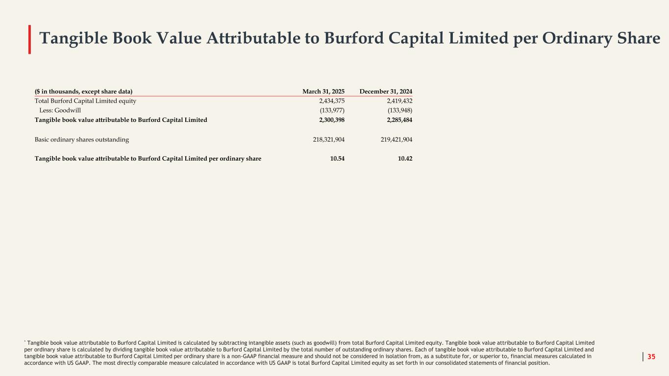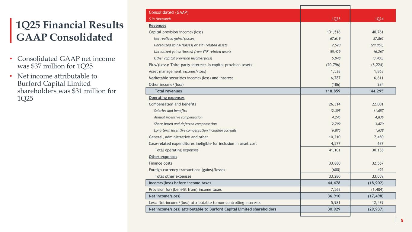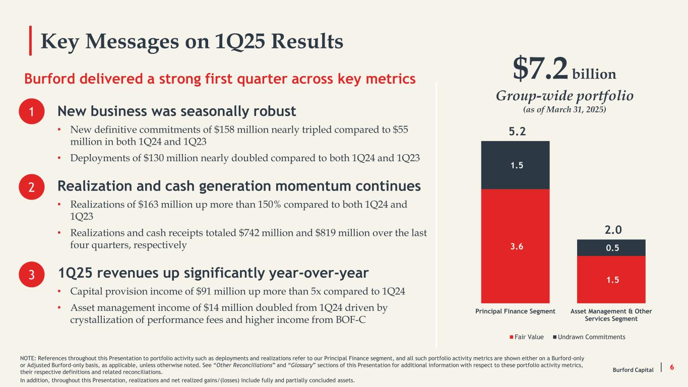注意&免责声明本演示文稿(本“演示文稿”)提供某些信息,以便于审查和了解Burford Capital Limited(连同其附属公司,“公司”、“Burford”、“我们”、“我们的”或“我们”)截至2025年3月31日止三个月的业务、财务状况和经营业绩,并且并不旨在完整描述公司的业务、财务状况或经营业绩。本演示文稿中包含的信息是截至本演示文稿所示日期和期间提供的,如有更改,恕不另行通知。截至2025年3月31日止三个月的财务状况和经营业绩不一定代表2025年12月31日止全年的预期业绩。前瞻性陈述。本演示文稿包含经修订的1933年美国证券法第27A条和经修订的1934年美国证券交易法第21E条含义内的“前瞻性陈述”,旨在涵盖在这些条款规定的安全港范围内。在某些情况下,“目标”、“预期”、“相信”、“继续”、“可能”、“估计”、“预期”、“预测”、“指导”、“打算”、“可能”、“计划”、“潜在”、“预测”、“预计”、“应该”或“将”等词语,或此类术语或其他类似术语的否定,旨在识别前瞻性陈述。尽管公司认为前瞻性陈述中反映的关于未来结果和事件的假设、预期、预测、意图和信念有合理的基础,并且是善意表达的,但前瞻性陈述涉及已知和未知的风险、不确定性和其他因素,这可能导致公司的实际结果和事件与这些前瞻性陈述所表达、目标、预测或暗示的未来结果和事件存在重大差异(并且比这些结果和事件更负面)。可能导致未来结果和事件不同的因素包括(其中包括)以下因素:(i)不利的诉讼结果和诉讼事项解决的时间;(ii)公司识别和选择合适的合法融资资产的能力;(iii)由于网络安全漏洞、未经授权的使用或盗窃,不当使用或披露或访问公司控制下的特权信息;(iv)概率模型和决策科学工具不准确或失败,包括机器学习技术和生成人工智能(统称“AI技术”),公司用于预测其合法金融资产及其经营中的收益;(v)与合法金融行业相关的法律、法规和规则的变化和不确定性,包括与特权信息和/或法律金融安排的披露和可执行性相关的变化和不确定性;(vi)公司尽职调查过程中的不足或不可预见的发展;(vii)与公司合法金融资产相关的信用风险和集中风险;(viii)公司合法金融资产缺乏流动性和超出其可用资本的承诺;(ix)公司获得有吸引力的外部资本的能力,为其未偿债务再融资或筹集资金以满足其流动性需求;(x)竞争因素和对公司服务和资本的需求;(xi)律师未能起诉和/或为公司以必要的技能和谨慎提供资金的索赔进行辩护或其客户的利益与公司利益不一致;(xii)公司代表其私人资金作出的承诺表现不佳;(xiii)法律金融行业或公司的负面宣传或公众看法;(xiv)公司资本拨备资产公允价值的估值不确定性;(xv)当前以及未来的法律、政治和经济因素,包括围绕公共卫生威胁和/或军事行动的影响、严重性和持续时间的不确定性;(xvi)人工智能技术的发展以及与环境、社会和治理考虑相关的预期;(xvii)针对公司的诉讼和法律诉讼的潜在责任;(xviii)公司雇用和留住关键人员的能力;(xix)由于不同的法律和监管要求、政治、 社会经济状况和不可预见的事态发展;(xx)外币汇率波动风险;(xxi)与公司融资安排的税务处理有关的不确定性;(xxii)公司或其第三方服务提供商的信息系统的网络安全风险和不当运作;(xxiii)公司的第三方服务提供商未能履行其义务或其第三方服务提供商的不当行为;(xxiv)公司未能维护个人信息的隐私和安全并遵守适用的数据隐私和保护法律和法规;(xxv)公司未能保持对财务报告的有效内部控制或有效的披露控制和程序;(xxvi)公司未能遵守作为美国国内上市公司的要求及其相关成本;(xxvii)与公司在根西岛注册成立有关的某些风险。这些因素不应被解释为详尽无遗,应与公司向美国证券交易委员会(“SEC”)提交或提供的定期报告和当前报告中包含的其他警示性声明一起阅读。其中许多因素超出了公司的控制或预测能力,新的因素不时出现。此外,公司无法评估每个此类因素对其业务的影响,或任何因素或因素组合可能导致实际结果和事件与任何前瞻性陈述中包含的结果和事件存在重大差异的程度。鉴于这些不确定性,请读者注意不要过分依赖公司的前瞻性陈述。所有随后可归因于公司或代表公司行事的人的书面和口头前瞻性陈述均完全受到这些警示性陈述的明确限定。前瞻性陈述仅在本演示文稿发布之日发表,除适用法律要求外,公司不承担更新或修改任何前瞻性陈述的义务,无论是由于新信息、未来事件或其他原因。除前瞻性陈述外,本演示文稿还包括基于公司对个别事项及其整体投资组合的概率建模得出的计算得出的某些数据。这个数据不是对未来业绩的预测,过去的业绩也不是未来业绩的指引。法律金融资产固有的波动性和不可预测性排除了预测并限制了公司概率模型的预测性质。此外,概率模型的固有性质是,实际结果将与建模结果不同,这种差异可能是实质性的。本演示文稿中包含的基于公司概率模型的计算得出的数据仅供参考,并非旨在作为盈利预测或作为未来业绩的指南。