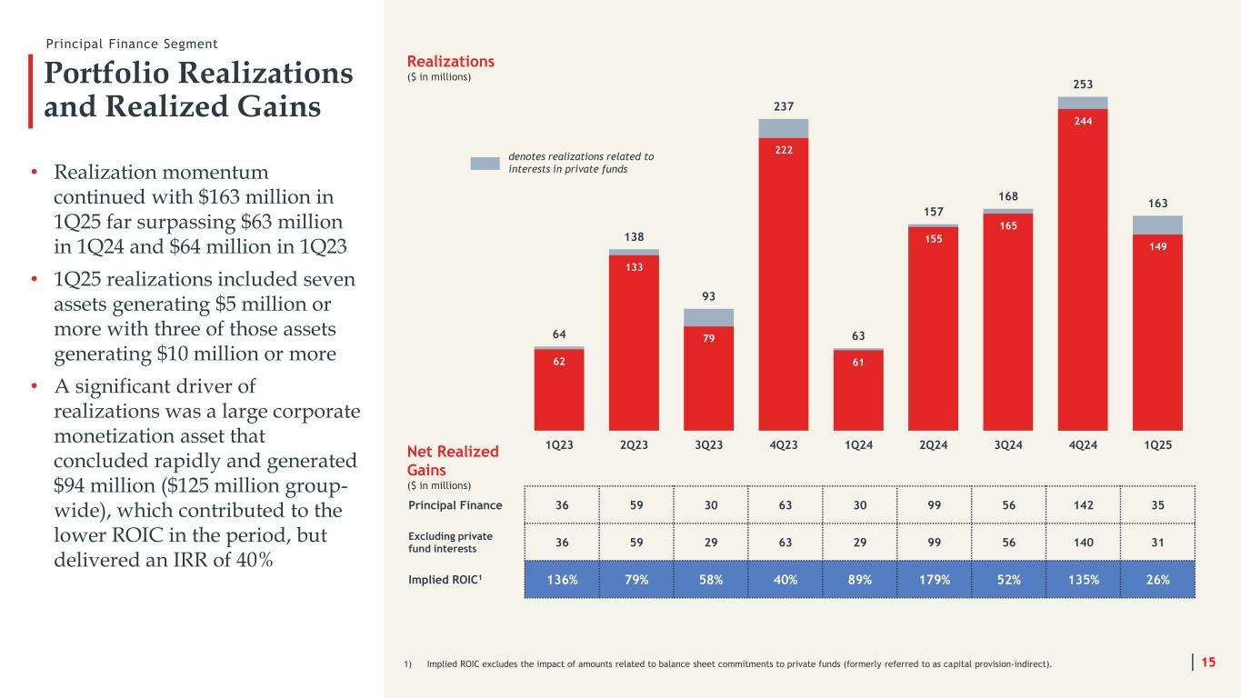 投资组合变现和已实现收益•变现势头继续保持,2015年第一季度为1.63亿美元,远超24年第一季度的6300万美元和23年第一季度的6400万美元• 2015年第一季度变现包括七项产生500万美元或以上的资产,其中三项资产产生1000万美元或以上•变现的一个重要驱动因素是一项大型企业货币化资产迅速结束并产生了9400万美元(整个集团为1.25亿美元),这导致了该期间较低的ROIC,但交付的内部收益率为40%变现(百万美元)本金融资部门本金融资3659306330995614235不包括私人基金权益3659296329995614031隐含ROIC1 136% 79% 58% 40% 89% 179% 52% 135% 26% 1)隐含ROIC不包括与私人基金的资产负债表承诺相关的金额(以前称为资本拨备-间接)的影响。6213379222611555165244149641389323763157168253163 1Q23 2Q23 3Q23 4Q23 1Q24 2Q24 3Q24 4Q24 1Q25表示与私人基金权益相关的变现净已实现收益(百万美元)15