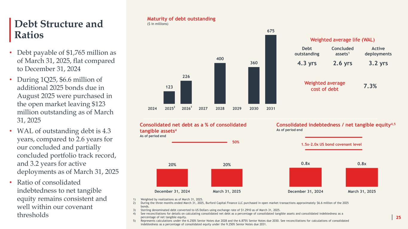 0.8x 0.8x 2024年12月31日2025年3月31日1.5x-2.0x美国债券契约级别20% 20% 50% 2024年12月31日2025年3月31日Structure和比率•截至2025年3月31日,应付债务为17.65亿美元,与2024年12月31日相比持平•在2025年第一季度期间,在公开市场上购买了660万美元于2025年8月到期的额外2025年债券,截至2025年3月31日,未偿还的未偿还债务为1.23亿美元•截至2025年3月31日,未偿还债务的WAL为4.3年,而我们已结束和部分结束的投资组合往绩记录为2.6年,截至2025年3月31日,积极部署的期限为3.2年•综合债务与净有形权益的比率保持一致,并远低于我们的契约阈值251)按截至2025年3月31日的变现加权。2)在截至2025年3月31日的三个月内,伯福德资本金融有限责任公司在公开市场交易中购买了约660万美元的2025年债券。3)英镑计价债务使用截至2025年3月31日的1.29 10美元汇率转换为美元。4)有关计算合并净债务占合并有形资产的百分比和合并债务占净有形权益的百分比的详细信息,请参见对账。5)代表2028年到期的6.250%优先票据和2030年到期的6.875%优先票据下的计算。关于2031年到期的9.250%优先票据下合并债务占合并权益百分比的计算,请参见对账。合并净债务占合并有形资产的百分比4截至期末合并债务/有形权益净值4,5截至期末未偿债务到期日(百万美元)123226400360675202420252026202720282029203020332加权平均寿命(WAL)未偿债务期末资产1积极部署4.3年2.6年3.2年加权平均债务成本7.3%