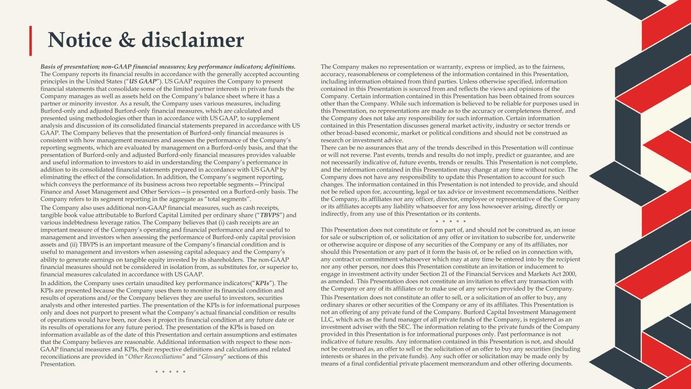 注意&免责声明列报依据;非公认会计原则财务计量;关键绩效指标;定义。公司根据美国公认会计原则(“US GAAP”)报告财务业绩。美国通用会计准则要求公司提交的财务报表合并了公司管理的私人基金中的部分有限合伙人权益以及公司资产负债表中拥有合伙人或少数投资者的资产。因此,该公司使用了各种衡量标准,包括仅伯福德和调整后的仅伯福德财务衡量标准,这些衡量标准是使用不按照美国公认会计原则的方法计算和列报的,以补充对其根据美国公认会计原则编制的合并财务报表的分析和讨论。公司认为,仅Burford财务指标的列报方式与管理层衡量和评估公司报告分部业绩的方式一致,管理层在仅Burford的基础上对其进行评估,并且仅Burford和调整后的仅Burford财务指标的列报方式通过消除合并的影响,为投资者提供了有价值和有用的信息,以帮助了解公司除了根据美国公认会计原则编制的合并财务报表之外的业绩。此外,该公司的分部报告传达了其在两个可报告分部——信安财务和资产管理及其他服务——的业务表现,仅在伯福德的基础上呈现。该公司将其分部报告汇总称为“总分部”。该公司还使用额外的非公认会计准则财务指标,例如现金收入、归属于Burford Capital Limited的每股普通股有形账面价值(“TBVPS”)以及各种债务杠杆比率。公司认为,(i)现金收入是衡量公司经营和财务业绩的重要指标,在评估仅伯福德资本拨备资产的表现时对管理层和投资者有用;(ii)TBVPS是衡量公司财务状况的重要指标,在评估资本充足性和公司对其股东投资的有形股权产生收益的能力时对管理层和投资者有用。非美国通用会计准则财务指标不应与根据美国通用会计准则计算的财务指标隔离、替代或优于其。此外,公司使用某些未经审计的关键绩效指标(“KPI”)。之所以提出这些KPI,是因为公司使用它们来监测其财务状况和经营业绩和/或公司认为它们对投资者、证券分析师和其他相关方有用。关键绩效指标的列报仅供参考,并不旨在列报公司的实际财务状况或经营业绩,也不预测其在任何未来日期的财务状况或其在任何未来期间的经营业绩。关键绩效指标的列报是基于截至本列报日期可获得的信息以及公司认为合理的某些假设和估计。有关这些非GAAP财务指标和KPI、其各自的定义和计算以及相关对账的更多信息,在本演示文稿的“其他对账”和“术语表”部分中提供。*****本公司对本演示文稿所载信息(包括从第三方获得的信息)的公平性、准确性、合理性或完整性不作任何明示或暗示的陈述或保证。除非另有说明,本演示文稿中包含的信息均来自并反映了公司的观点和意见。本演示文稿中包含的某些信息是从公司以外的来源获得的。尽管就本演示文稿所使用的目的而言,此类信息被认为是可靠的,但对于这些信息的准确性或完整性不作任何陈述,公司也不对此类信息承担任何责任。本演示文稿中包含的某些信息讨论了一般市场活动、行业或行业趋势或其他基础广泛的经济、市场或政治条件,不应被解释为研究或投资建议。无法保证本演示文稿中描述的任何趋势将继续或不会逆转。过去的事件、趋势和结果并不暗示、预测或保证,也不一定指示未来的事件、趋势或结果。这个演示文稿不完整, 本演示文稿中包含的信息可能随时发生变化,恕不另行通知。公司没有任何责任更新本演示文稿以说明此类变化。本演示文稿中包含的信息无意提供,也不应被依赖于会计、法律或税务建议或投资建议。公司、其关联公司或公司或其关联公司的任何高级职员、董事、雇员或代表均不对因使用本演示文稿或其内容而直接或间接产生的任何损失承担任何责任。*****本演示文稿不构成或构成、也不应被解释为发行或认购、或招揽任何要约或邀请以认购、包销或以其他方式收购或处置公司或其任何关联公司的任何证券,本演示文稿或其任何部分也不应构成接收方或任何其他人在任何时间可能订立的任何合同或承诺的基础或与之相关的依赖,本演示文稿也不构成根据经修订的《2000年金融服务和市场法》第21条参与投资活动的邀请或诱导。本演示文稿不构成与公司或其任何关联公司进行任何交易或使用公司提供的任何服务的邀请。本演示文稿不构成出售公司或其任何关联公司的任何普通股或其他证券的要约或购买要约的邀请。本演示文稿不是公司任何私募基金的发售。担任公司所有私人基金的基金管理人的伯福德资本 Investment Management LLC已在SEC注册为投资顾问。本演示文稿中提供的与公司私人基金有关的信息仅供参考。过去的表现并不代表未来的结果。本演示文稿中包含的任何信息不是,也不应被解释为出售要约或购买任何证券(包括私人基金的权益或股份)的要约邀请。任何此类要约或招揽只能通过最终保密的私募备忘录和其他发售文件的方式进行。