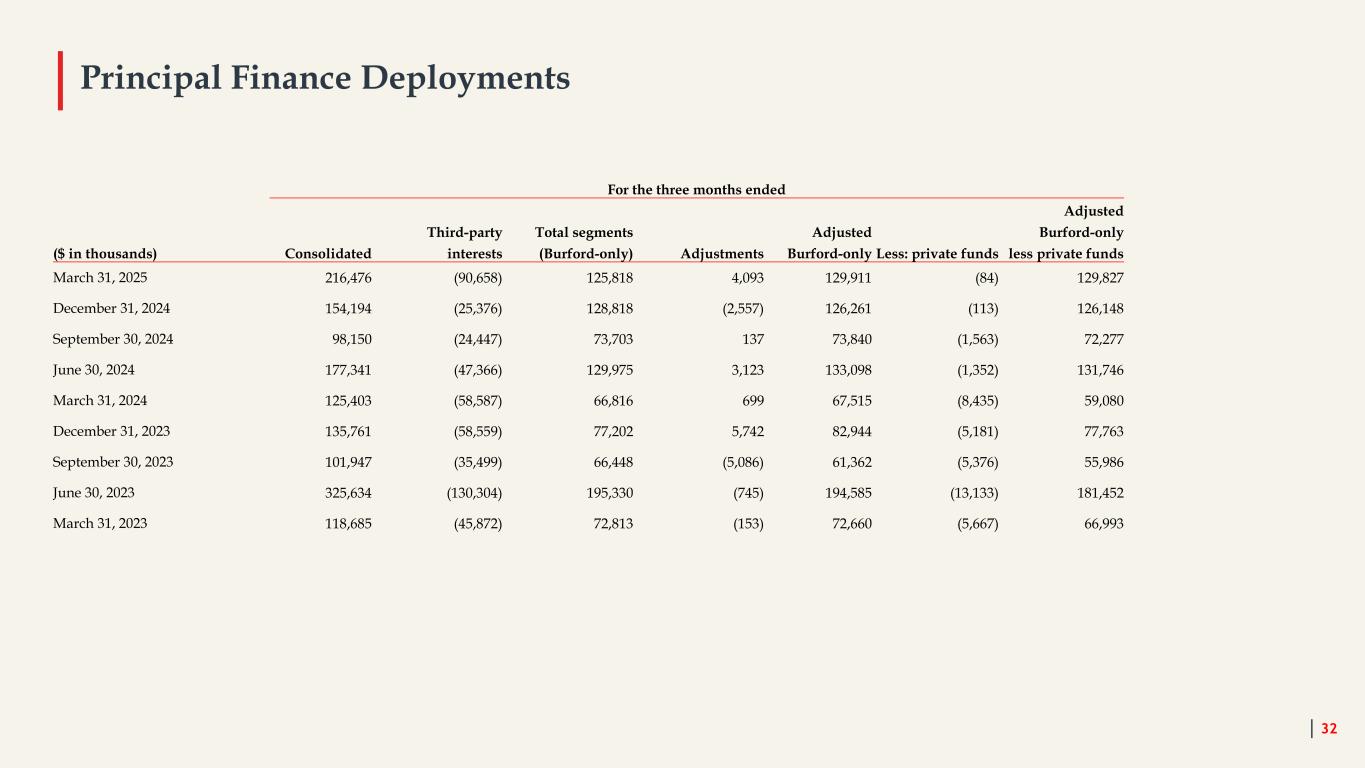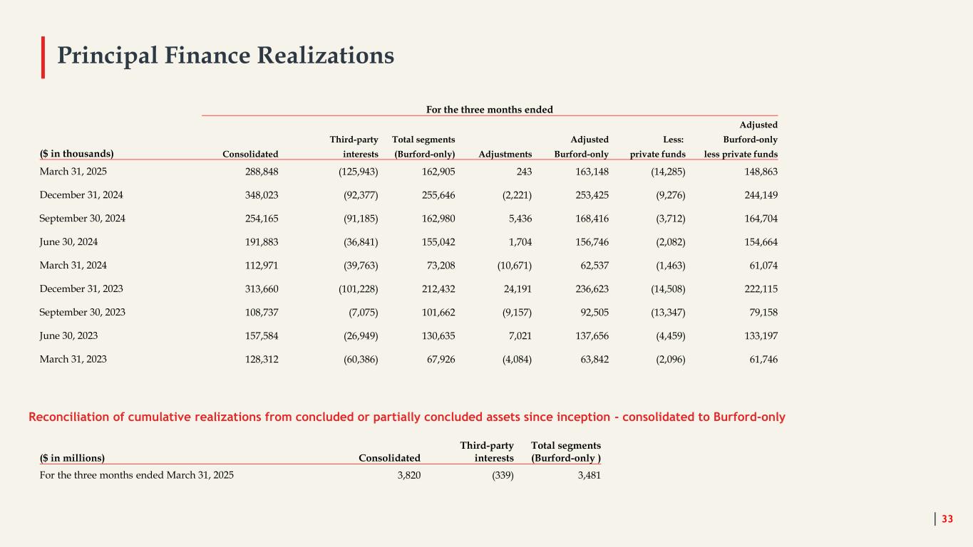 截至三个月的主要财务部署32调整后的第三方总分部调整后的仅Burford(单位:千美元)合并权益(仅Burford)调整仅Burford减:私人资金减去私人资金2025年3月31日216,476(90,658)125,8184,093129,911(84)129,8272024年12月31日154,194(25,376)128,818(2,557)126,261(113)126,1482024年9月30日98,150(24,447)73,70313773,840(1,563)72,2772024年6月30日177,341(47,366)129,9753,123133,098(1,352)131,7462024年3月31日125,403(58,587)66,816,69967,5152023101,947(35,499)66,448(5,086)61,362(5,376)55,9862023年6月30日325,634(130,304)195,330(745)194,585(13,133)181,4522023年3月31日118,685(45,872)72,813(153)72,660(5,667)66,993