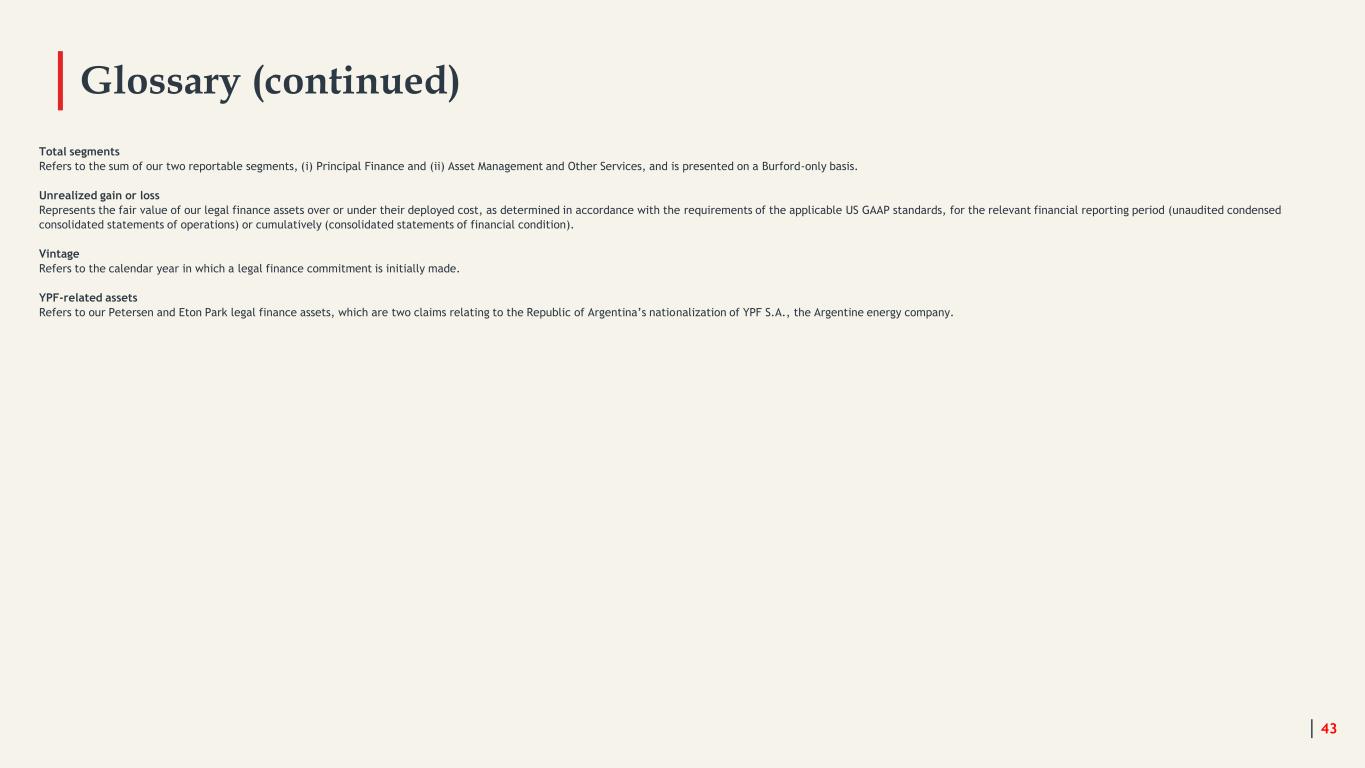 词汇表(续)43总分部是指我们两个可报告分部的总和,(i)本金财务和(ii)资产管理和其他服务,仅在伯福德基础上列报。未实现损益是指根据适用的美国公认会计准则的要求,在相关财务报告期间(未经审计的简明综合经营报表)或累计(综合财务状况报表),我们的合法金融资产超过或低于其部署成本的公允价值。Vintage是指最初作出法定财务承诺的日历年。YPF相关资产是指我们的Petersen和Eton Park法律金融资产,这是两项与阿根廷共和国对阿根廷能源公司YPF S.A.国有化有关的债权。
