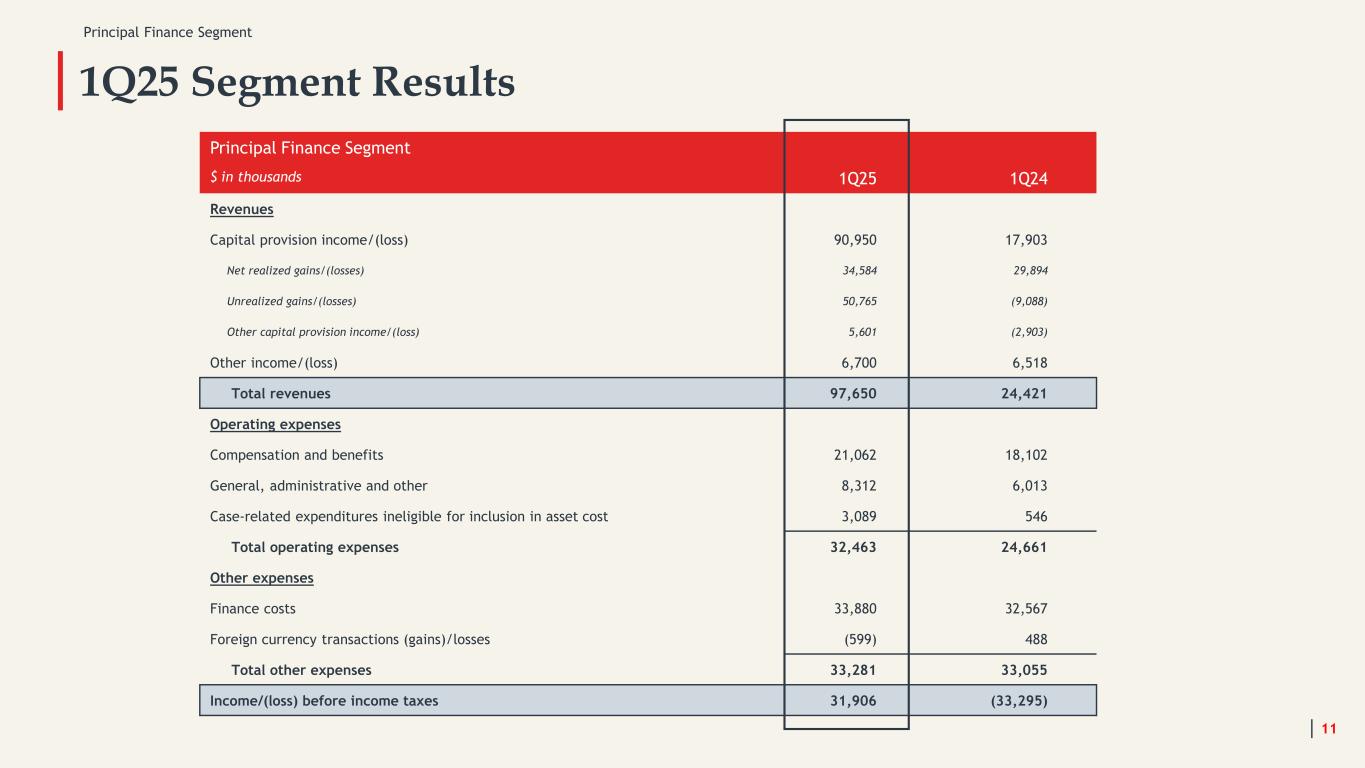 1Q25分部业绩11主要财务分部以千美元计1Q25 1Q24收入资本拨备收入/(亏损)90,95017,903净实现收益/(亏损)34,58429,894未实现收益/(亏损)50,765(9,088)其他资本拨备收入/(亏损)5,601(2,903)其他收入/(亏损)6,756,518总收入97,65024,421营业费用薪酬和福利21,06218,102一般、行政和其他8,3126,013与案件相关的支出不符合纳入资产成本3,089546总营业费用32,46324,661其他费用财务费用33,88032,567外币交易(收益)/亏损(599)488其他费用总额33,28133,055所得税前收入/(亏损)31,