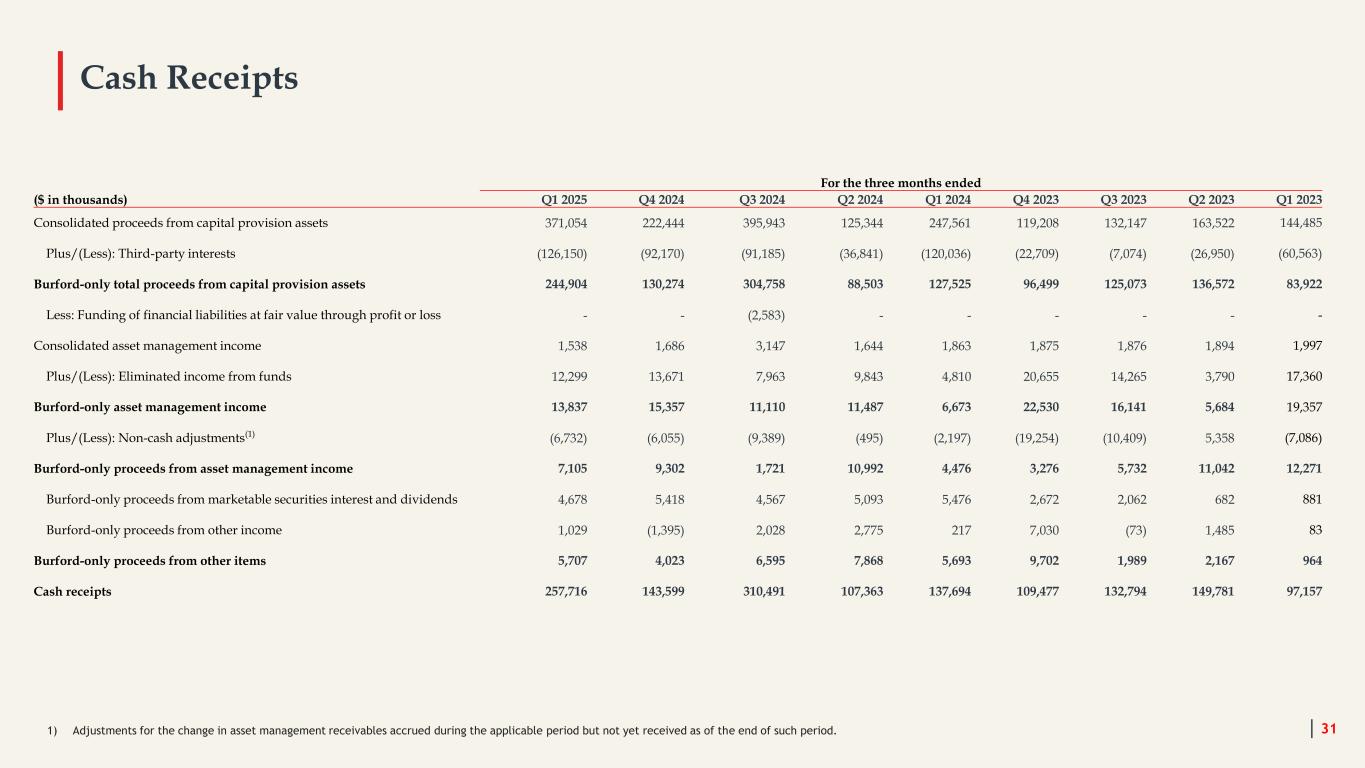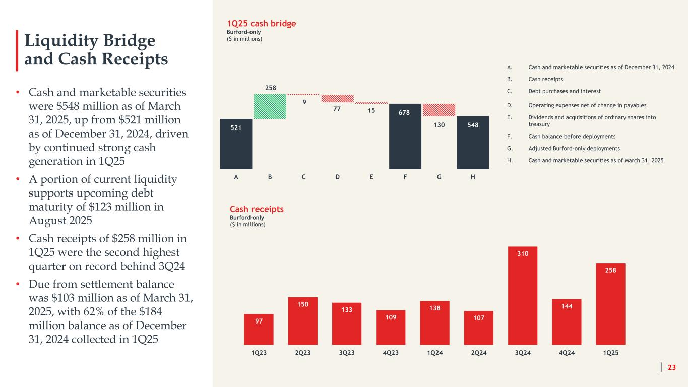 流动性桥梁和现金收入A.截至2024年12月31日的现金和有价证券B.现金收入C.债务购买和利息D.扣除应付款项变动后的运营费用E.股息和收购普通股入库F.部署前的现金余额G.调整后的仅伯福德部署H.截至3月31日的现金和有价证券,20252325897715130521678548 A B C D E F GH 1Q25现金过桥仅Burford(百万美元)现金收入仅Burford(百万美元)•截至2025年3月31日,现金和有价证券为5.48亿美元,高于截至2024年12月31日的5.21亿美元,受第一季度持续强劲的现金生成推动•当前流动性的一部分支持2025年8月即将到期的1.23亿美元债务•第一季度的现金收入为2.58亿美元,是有记录以来仅次于第三季度的第二高季度•截至2025年3月31日,应收结算余额为1.03亿美元,截至2024年12月31日的1.84亿美元余额中的62%于第一季度收取97150133109138107310144258第一季度23第二季度23第三季度23第四季度23第一季度24第二季度24第四季度24第四季度25