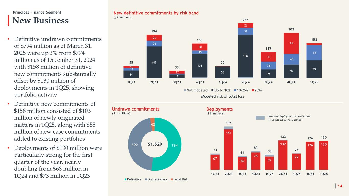 新业务•截至2025年3月31日的最终未提取承诺为7.94亿美元,与截至2024年12月31日的7.74亿美元相比增长3%,其中1.58亿美元的最终新承诺被第一季度的1.3亿美元部署大幅抵消,显示投资组合活动• 1.58亿美元的最终新承诺包括第一季度1.03亿美元的新发起事项,以及在现有投资组合中增加的5500万美元的新案例承诺•今年第一季度的部署为1.3亿美元,尤其强劲,与24年第一季度的6800万美元相比几乎翻了一番和7300万美元的1Q23按风险等级划分的新的最终承诺(百万美元)14本金融资部分3414217106531883960801226153236486810261230224394551943315555247117203158 1Q23 2Q23 3Q23 4Q23 1Q24 2Q24 3Q24 4Q24 1Q25未建模高达10% 10-25 % 25% +未提取承诺(百万美元)79469243最终自由裁量法律风险1,529美元部署(百万美元)671815677859132721261307319561836813374126130 1Q232Q23 3Q23 4Q23 1Q24 2Q24 3Q24 4Q24 1Q25表示与私人基金权益相关的部署模拟总损失风险