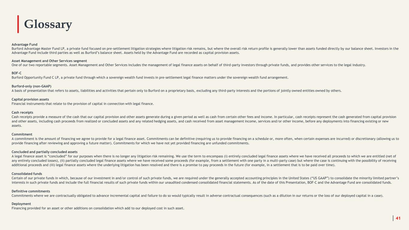 Advantage Fund Burford Advantage Master Fund LP,一家专注于诉讼风险仍然存在的和解前诉讼策略的私募基金,但其整体风险回报状况通常低于我们的资产负债表直接资助的资产。优势基金的投资者包括第三方以及伯福德的资产负债表。优势基金持有的资产作为资本拨备资产入账。资产管理和其他服务分部我们的两个可报告分部之一。资产管理及其他服务包括通过私募基金代表第三方投资者管理法律金融资产,并向法律行业提供其他服务。BOF-C Burford Opportunity Fund C LP,一家私人基金,主权财富基金通过该基金投资于主权财富基金安排下的预结算法律融资事项。仅Burford(非公认会计原则)一种列报基础,指在专有基础上仅与Burford相关的资产、负债和活动,不包括任何第三方权益和他人拥有的共同拥有实体的部分。资本提供资产与法定金融相关的资本提供相关的金融工具。现金收入现金收入衡量我们的资本拨备和其他资产在特定时期内产生的现金以及来自某些其他费用和收入的现金。特别是,现金收入是指资本拨备和其他资产产生的现金,包括已变现或已交割资产和任何相关对冲资产的现金收益,以及资产管理收入、服务和/或其他收入收到的现金,在任何部署用于为现有或新资产融资之前。承诺A承诺是我们同意为合法金融资产提供的融资金额。承诺可以是确定性的(要求我们按时间表提供融资,或者更经常地,在发生某些费用时),也可以是酌情性的(允许我们在审查和批准未来事项后提供融资)。我们尚未提供融资的承诺属于无资金承诺。已结束和部分结束的资产法律金融资产是在不再存在任何剩余诉讼风险时为我们的目的而“结束”的。我们使用该术语包括(i)完全结束的合法金融资产,其中我们已收到我们有权获得的所有收益(扣除任何完全结束的损失),(ii)部分结束的合法金融资产,其中我们已收到一些收益(例如,从多方案件中与一方当事人的和解中),但案件仍在继续,有可能收到额外收益,以及(iii)法律金融资产,其中基础诉讼已解决,并承诺在未来支付收益(例如,在一项将随着时间的推移而支付的结算中)。合并基金我们的某些私人基金,由于我们对这类私人基金的投资和/或控制,根据美国公认会计原则(“美国公认会计原则”),我们被要求合并少数有限合伙人在这类私人基金中的权益,并将这类私人基金的全部财务业绩纳入我们未经审计的简明综合财务报表。截至本说明之日,BOF-C和优势基金为合并基金。确定的承诺我们在合同上有义务垫付增量资本但未能这样做的承诺通常会导致不利的合同后果(例如稀释我们的回报或在案件中损失我们部署的资本)。部署融资为一项资产或合并时增加我们在此类资产中的部署成本的其他增加提供。名词解释41