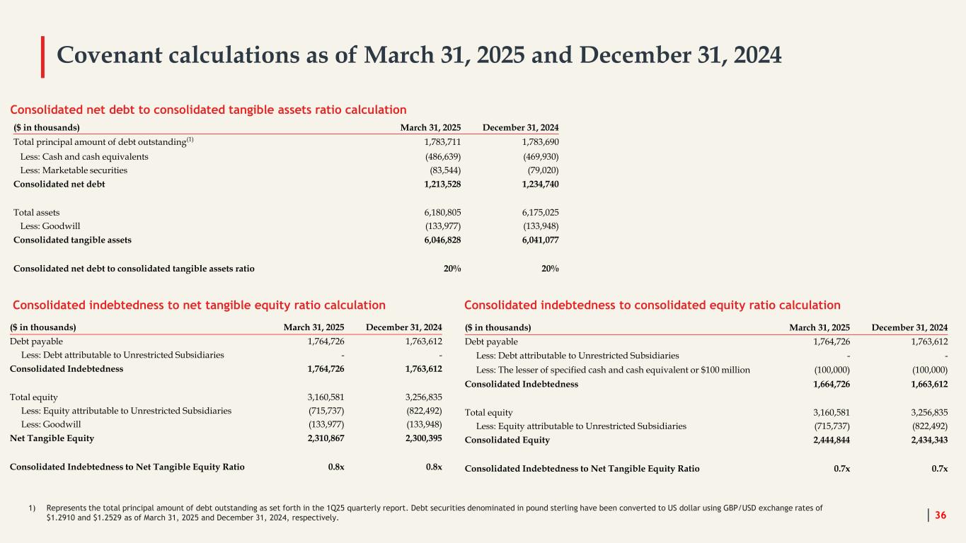 截至2025年3月31日和2024年12月31日的契约计算36合并净债务与合并有形资产比率计算合并负债与净有形权益比率计算1)表示第一季度25季度报告中所述的未偿债务本金总额。以英镑计价的债务证券已分别使用截至2025年3月31日和2024年12月31日的1.29 10美元和1.2529美元的英镑兑美元汇率转换为美元。合并债务与合并权益比率计算(千美元)2025年3月31日2024年12月31日未偿债务本金总额(1)1,783,7111,783,690减:现金及现金等价物(486,639)(469,930)减:有价证券(83,544)(79,020)合并净债务1,213,5281,234,740总资产6,180,8056,175,025减:商誉(133,977)(133,948)合并有形资产6,046,8286,041,077合并净债务与合并有形资产比率20% 20%(千美元)2025年3月31日12月31日,2024年应付债务1,764,7261,763,612减:归属于非受限子公司的债务--合并负债1,764,7261,763,612总权益3,160,5813,256,835减:归属于非受限子公司的权益(715,737)(822,492)减:商誉(133,977)(133,948)净有形权益2,310,8672,300,395合并负债与净有形权益比率0.8x 0.8x(千美元)2025年3月31日12月31日,2024年应付债务1,764,7261,763,612减:归属于非受限子公司的债务---减:指定现金和现金等价物中的较小者或1亿美元(100,000)(100,000)合并债务1,664,7261,663,612总权益3,160,5813,256,835减:归属于非受限子公司的权益(715,737)(822,492)合并权益2,444,8442,434,343合并债务与有形净资产比率0.7x 0.7x