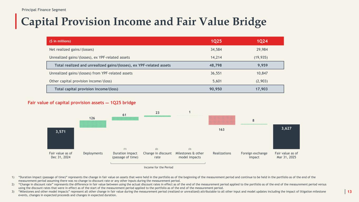 资本拨备收益和公允价值桥梁131)“久期影响(时间流逝)”指在计量期间开始时在组合中持有并在计量期间结束时在组合中继续持有的资产的公允价值变动,假设在计量期间贴现率或任何其他输入没有变化。2)“折现率变动”是指使用截至计量期末对组合适用的计量期末实际有效的折现率与使用截至计量期末对组合适用的计量期初有效的折现率之间的公允价值差额。3)“里程碑和其他模型影响”指计量期间公允价值的所有其他变动(已实现或未实现)归因于所有其他输入和模型更新,包括诉讼里程碑事件的影响、预期收益的变动和预期存续期的变动。(百万美元)1Q25 1Q24净实现收益/(损失)34,58429,984未实现收益/(损失),ex YPF相关资产14,214(19,935)已实现和未实现收益/(损失)总额,ex YPF相关资产48,7989,959未实现收益/(损失)来自YPF相关资产36,55110,847其他资本拨备收入/(损失)5,601(2,903)资本拨备收入/(损失)总额90,95017,9033,5713,62712661231163 8截至2024年12月31日的公允价值部署持续时间影响(时间流逝)贴现率变化里程碑和其他模型影响实现外汇影响截至3月31日的公允价值,2025年资本拨备资产公允价值― 1Q25期内过桥收益(1)(2)信安财务分部(3)