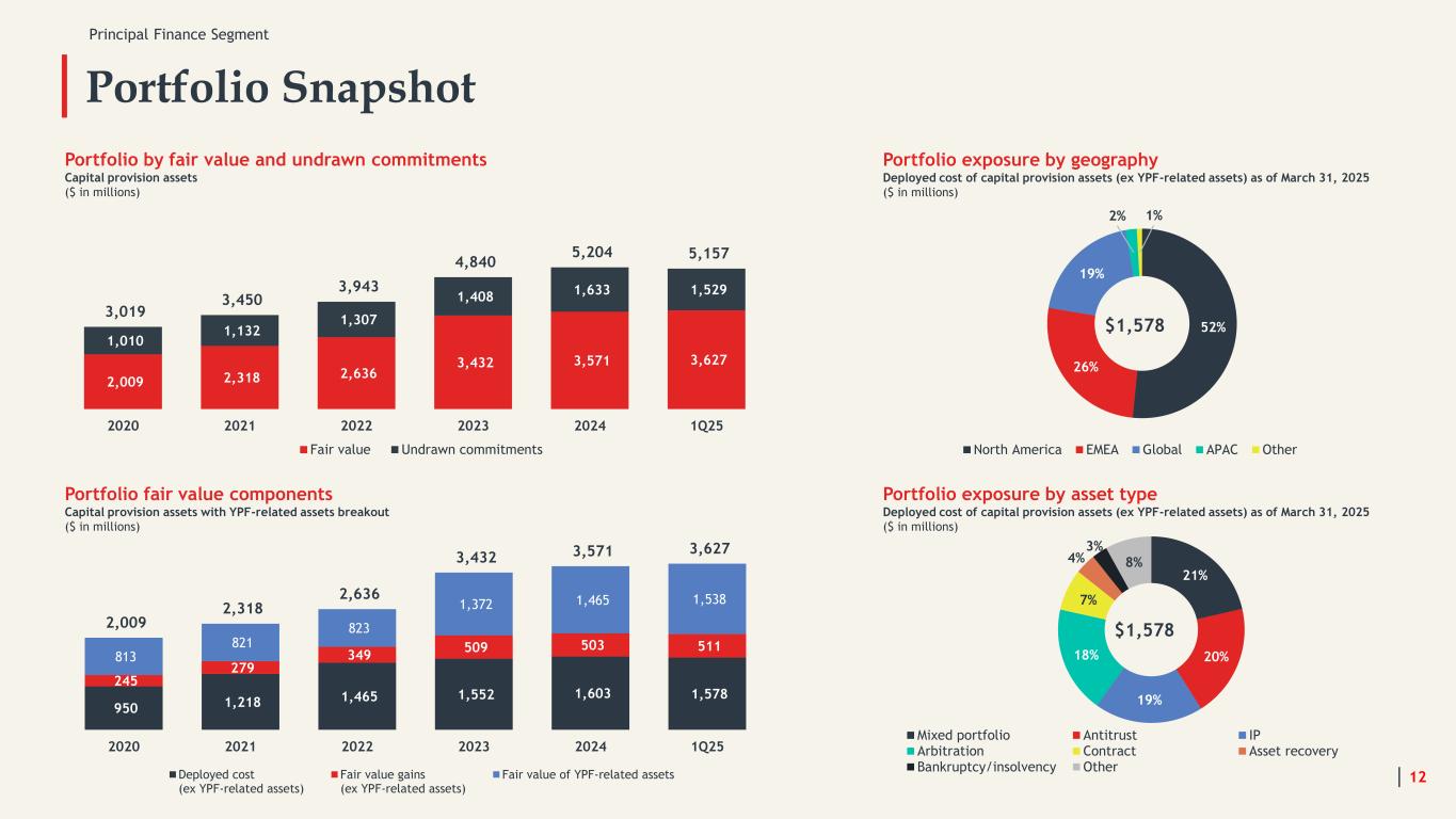 21% 20% 19% 18% 7% 4% 3% 8%混合组合反垄断知识产权仲裁合同资产追回破产/无力偿债其他组合快照122,0092,3182,6363,4323,5713,6271,0 101,1321,3071,4081,6331,5293,0193,4503,9434,8405,2045,15720202021202220232024 1Q25按公允价值划分的公允价值未提取承诺组合和未提取承诺资本拨备资产(百万美元)9501,2181,4651,5521,6031,5782452793495095035118138218231,3721,4651,5382,0092,3182,6363,4323,5713,62720202021202220232024 1Q25部署成本(不含YPF相关资产)公允价值收益(不含YPF相关资产)YPF相关资产公允价值组合公允价值组成部分YPF相关资产分拆的资本拨备资产(百万美元)52% 26% 19% 2% 1%北美EMEA Global APAC Other Portfolio敞口按地域划分截至3月31日已部署资本拨备资产成本(不含YPF相关资产),2025年(百万美元)按资产类型划分的投资组合敞口截至2025年3月31日已部署的资本拨备资产成本(不包括与YPF相关的资产)(百万美元)1,578美元1,578美元本金融资部分