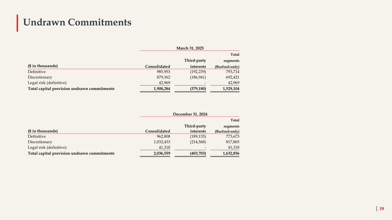 未提取承诺392025年3月31日第三方分部总额(单位:千美元)合并权益(仅伯福德)确定985,953(192,239)793,714可自由支配879,362(186,941)692,421法律风险(确定)42,969-42,969总资本准备未提取承诺1,908,284(379,180)1,529,1042024年12月31日第三方分部总额(仅伯福德)合并权益(仅伯福德)确定962,808(189,135)773,673可自由支配1,032,433(214,568)817,865法律风险(确定)41,318-41,318总资本准备未提取承诺2,036,559(403,703)1,632,856