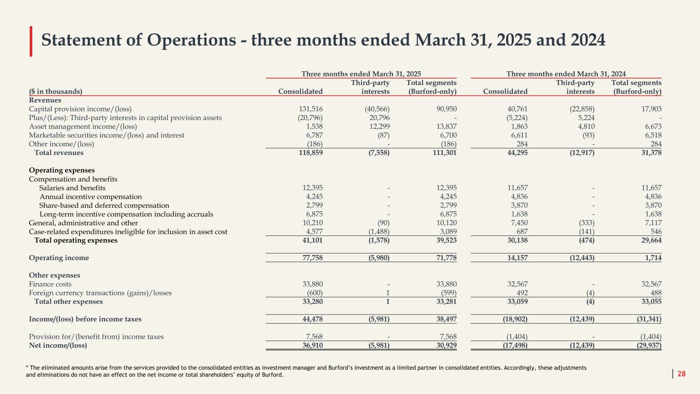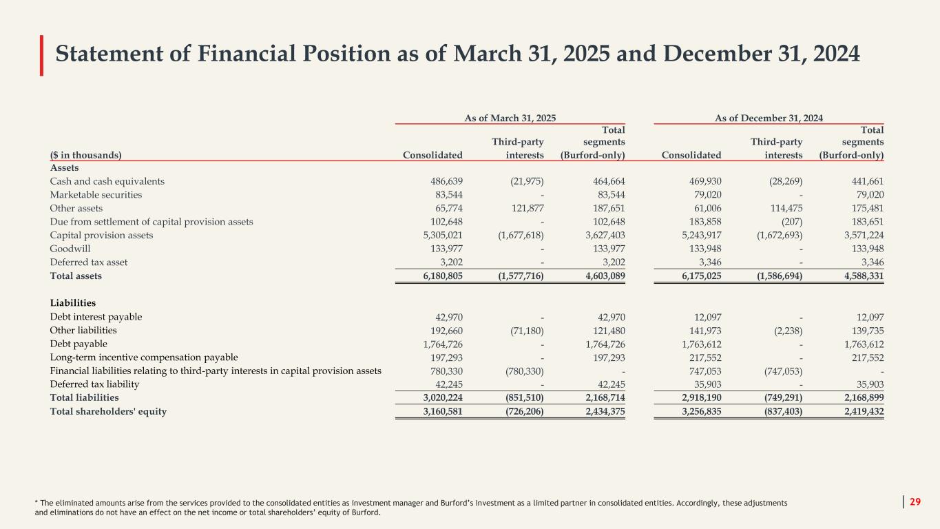 营运报表-截至2025年3月31日及2024年3月31日止三个月28*消除的金额产生于向作为投资管理人的合并实体提供的服务以及Burford作为合并实体的有限合伙人的投资。因此,这些调整和冲销不会对伯福德的净收入或股东权益总额产生影响。截至2025年3月31日止三个月截至3月31日止三个月,2024年第三方总分部第三方总分部(千美元)合并权益(仅伯福德)合并权益(仅伯福德)收入资本拨备收入/(亏损)131,516(40,566)90,95040,761(22,858)17,903加/(减):资本拨备资产中的第三方权益(20,796)20,796-(5,224)5,224-资产管理收入/(亏损)1,53812,29913,8371,8634,8106,673有价证券收入/(亏损)及利息6,787(87)6,7006,611(93)6,518其他收入/(亏损)(186)-(186)284-284总收入118,859(7,558)111,30144,295(12,9和福利12,395-12,39511,657-11,657年度激励薪酬4,245-4,2454,836-4,836股份激励和递延薪酬2,799-2,7993,870-3,870长期激励薪酬含应计6,875-6,8751,638-1,638一般,行政及其他10,210(90)10,1207,450(333)7,117不符合列入资产成本的案件相关支出4,577(1,488)3,089687(141)546营业费用总额41,101(1,578)39,52330,138(474)29,664营业收入77,758(5,980)71,77814,157(12,443)1,714其他费用财务费用33,880-33,88032,567-32,567外币往来(收益)/损失(600)1(599)492(4)488其他费用总额33,280133,28133,059(4)33,055所得税前收入/(损失)44,478(5,981)38,497(18,90