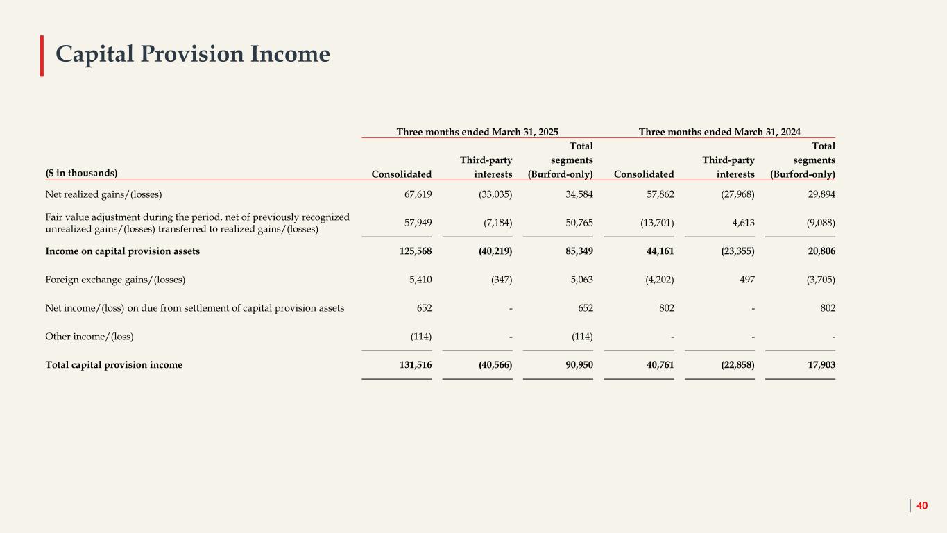 资本拨备收入40截至2025年3月31日止三个月截至2024年3月31日止三个月第三方分部总额第三方分部(千美元)合并权益(仅伯福德)合并权益(仅伯福德)净实现收益/(亏损)67,619(33,035)34,58457,862(27,968)29,894期间公允价值调整,扣除以前确认的未实现收益/(损失)转入已实现收益/(损失)57,949(7,184)50,765(13,701)4,613(9,088)资本拨备资产收益125,568(40,219)85,34944,161(23,355)20,806汇兑收益/(损失)5,410(347)5,063(4,202)497(3,705)结清资本拨备资产应收净收益/(损失)652-652802-802其他收益/(损失)(114)-(114)---资本拨备收入总额131,516(40,566)90,95040,761(22,858)17,903