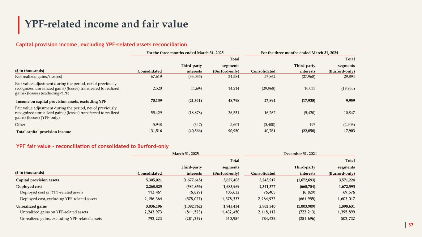 YPF相关收入和公允价值37资本拨备收入,不包括截至2025年3月31日止三个月的YPF相关资产调节截至2024年3月31日止三个月的第三方分部总额(单位:千美元)合并权益(仅Burford)合并权益(仅Burford)净实现收益/(损失)67,619(33,035)34,58457,862(27,968)29,894期间的公允价值调整,扣除先前确认的未实现收益/(损失)转入已实现收益/(损失)(不包括-YPF)2,52011,69414,214(29,968)10,033(19,935)资本拨备资产收益,不包括YPF 70,139(21,341)48,79827,894(17,935)9,959期间公允价值调整扣除先前确认的未实现收益/(损失)转入已实现收益/(损失)(仅YPF)55,429(18,878)36,55116,267(5,420)10,847其他5,948(347)5,601(3,400)497(2,903)资本拨备收入总额131,516(40,566)90,95040,761(22,858)17,903 YPF公允价值-合并到仅Burford的调节2025年3月31日2024年12月31日第三方分部总额第三方分部(千美元)合并权益(仅Burford)合并权益(仅Burford)资本拨备资产5,305,021(1,677,618)3,627,4035,243,917(1,672,693)3,571,224部署成本2不包括YPF相关资产2,156,364(578,027)1,578,3372,264,972(661,955)1,603,017未实现收益3,036,196(1,092,762)1,943,4342,902,540(1,003,909)1,898,631 YPF相关资产未实现收益2,243,973(811,523)1,432,4502,118,112(722,213)1,395,899未实现收益,不包括YPF相关资产792,223(281,239)510,984784,428(281,696)502,732