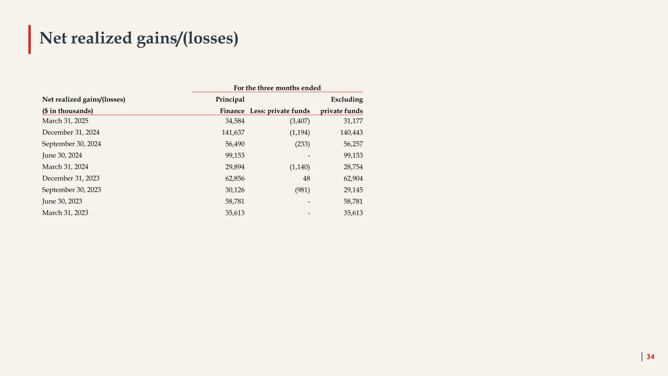 截至3个月已实现净收益/(亏损)34已实现净收益/(亏损)本金不包括(千美元)财务减:私人基金私人基金2025年3月31日34,584(3,407)31,1772024年12月31日141,637(1,194)140,4432024年9月30日56,490(233)56,2572024年6月30日99,153-99,1532024年3月31日29,894(1,140)28,7542023年12月31日62,8564862,9042023年9月30日30,126(981)29,1452023年6月30日58,781-58,7812023年3月31日35,613-35,613