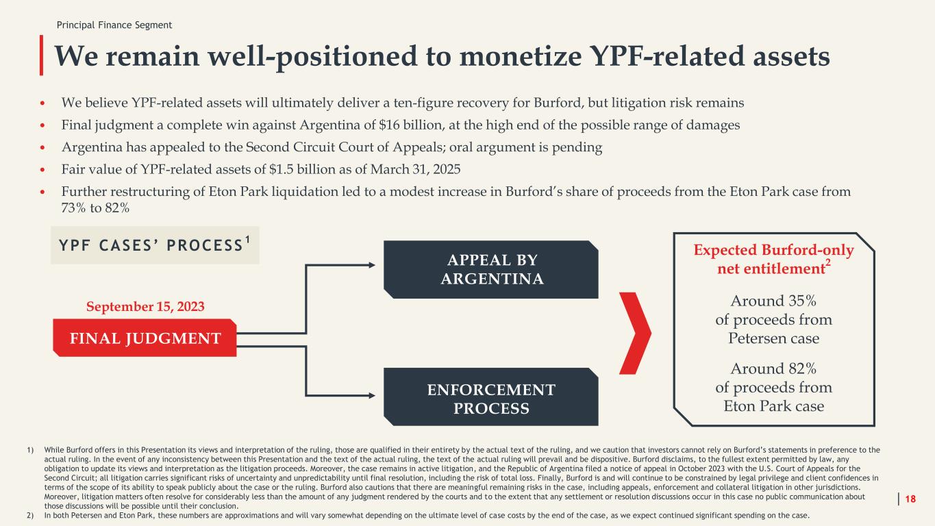 我们仍然处于有利地位,可以将YPF相关资产货币化18 •我们认为YPF相关资产最终将为伯福德带来十位数的赔偿,但诉讼风险仍然存在•最终判决完全赢得阿根廷160亿美元,处于可能的损害赔偿范围的高端•阿根廷已向第二巡回上诉法院提出上诉;口头辩论正在等待中•截至3月31日,YPF相关资产的公允价值为15亿美元,2025 •伊顿公园案清算的进一步重组导致伯福德在伊顿公园案收益中所占份额从73%小幅增加至82% YPF案件的程序1预计仅伯福德的净权利2约为Petersen案收益的35%伊顿公园案执行程序收益的约82% 2023年9月15日阿根廷主要财务部门提出的最终判决上诉1)而伯福德在本演示文稿中提供了其对裁决的观点和解释,这些内容完全以裁决的实际文本为准,我们提醒,投资者不能依赖伯福德的声明而不是实际裁决。如本陈述与实际裁定书文本有任何不一致之处,将以实际裁定书文本为准,具有决定性。在法律允许的最大范围内,Burford不承担在诉讼进行时更新其观点和解释的任何义务。此外,该案件仍在积极诉讼中,阿根廷共和国于2023年10月向美国第二巡回上诉法院提交了上诉通知;所有诉讼在最终解决之前都具有重大的不确定性和不可预测性风险,包括全损风险。最后,就其公开谈论案件或裁决的能力范围而言,伯福德现在并将继续受到法律特权和客户信任的限制。伯福德还警告称,该案存在有意义的剩余风险,包括在其他司法管辖区的上诉、执行和附带诉讼。此外,诉讼事项解决的金额通常远低于法院作出的任何判决的金额,并且在本案中发生任何和解或解决讨论的情况下,在这些讨论结束之前不可能就这些讨论进行公开沟通。2)在Petersen和Eton Park,这些数字都是近似值,将在一定程度上取决于案件结束时案件成本的最终水平,因为我们预计将继续在案件上投入大量支出。