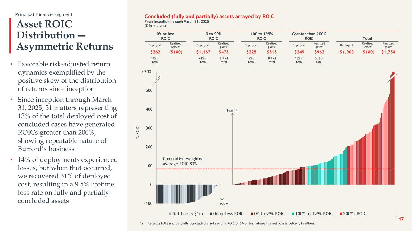 -100 0100200300400500600净亏损< 100万美元0%或更少的ROIC 0%至99% ROIC 100%至199% ROIC 200% + ROIC资产TERM0分布―不对称回报•有利的风险调整后回报动态,例如自启动以来的回报分布呈正偏度•自启动以来至2025年3月31日,占已完成案例总部署成本13%的51个事项已产生超过200%的ROIC,显示出Burford业务的重复性• 14%的部署经历了损失,但在发生这种情况时,我们收回了部署成本的31%,导致完全和部分缔结资产9.5%的终生损失率0%或更少的ROIC 0至99% ROIC 100至199% ROIC大于200% ROIC已部署总额:已实现损失:已部署:已实现收益:已部署:已实现收益:已部署:已实现收益:已实现收益:$ 262($ 180)$ 1,167 $ 478 $ 225 $ 318 $ 249 $ 962 $ 1,903($ 180)$ 1,75814% of total 61% of total 27% of total 12% of total 18% of total 13% of total 55% of total ended(完全和部分)assets arranged by ROIC from inception to March 31,2025年(百万美元)累计加权平均ROIC 83%收益亏损> 700% R O IC 17本金财务部分1)反映净亏损在100万美元以下的全部和部分已结算的ROIC为0%或更低的资产。1