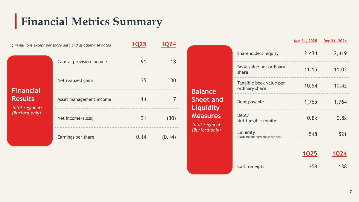 财务指标摘要百万美元,除每股数据外,另有说明1Q25 1Q24资本拨备收入9118净实现收益3530资产管理收入147净收益/(亏损)31(30)每股收益0.14(0.14)2025年3月31日12月31日,2024年股东权益2,4342,419每股普通股账面价值11.15 11.03每股普通股有形账面价值10.54 10.42应付债务1,7651,764债务/净有形权益0.8x 0.8x流动性(现金和有价证券)548521 1Q25 1Q24现金收入258138财务业绩总分部(仅伯福德)资产负债表和流动性计量总分部(仅伯福德)7