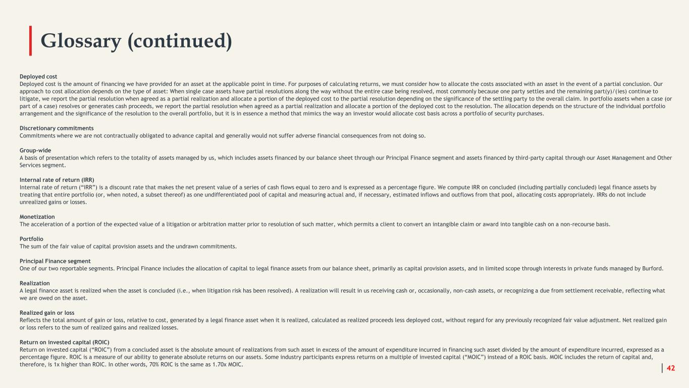 部署成本部署成本是我们在适用的时间点为一项资产提供的融资金额。为了计算收益,我们必须考虑在部分结论的情况下如何分配与资产相关的成本。我们的费用分摊方法取决于资产的类型:当单个案件资产在整个案件未解决的情况下一路出现部分解决,最常见的是因为一方和解而剩余部分(y)/(ies)继续诉讼,我们将约定时的部分解决报告为部分实现,并视和解方对整体索赔的重要性将部署成本的一部分分配给部分解决。在投资组合资产中,当一个案例(或案例的一部分)解决或产生现金收益时,我们将约定时的部分解决报告为部分实现,并将部署成本的一部分分配给解决。分配取决于单个投资组合安排的结构以及解决方案对整体投资组合的重要性,但它本质上是一种模拟投资者在证券购买的投资组合中分配成本基础的方式的方法。全权承诺承诺,其中我们没有合同义务垫资,并且通常不会因不这样做而遭受不利的财务后果。集团范围内的列报基础,指我们管理的资产总额,其中包括通过我们的本金融资部门由我们的资产负债表融资的资产和通过我们的资产管理和其他服务部门由第三方资本融资的资产。内部收益率(IRR)内部收益率(IRR)是一种贴现率,它使一系列现金流的净现值等于零,并以百分比数字表示。我们通过将整个投资组合(或者,如果注意到,其中的一个子集)视为一个无差别的资本池,并衡量该资金池的实际和(如有必要)估计流入和流出,适当分配成本,来计算已完成(包括部分完成)的法定金融资产的IRR。内部收益率不包括未实现的收益或损失。货币化诉讼或仲裁事项的预期价值的一部分在此类事项解决之前的加速,这允许客户在无追索权的基础上将无形债权或裁决转换为有形现金。组合资本拨备资产公允价值与未提取承诺之和。信安财务分部我们的两个可报告分部之一。Principal Finance包括从我们的资产负债表中将资本分配给合法金融资产,主要作为资本提供资产,并在有限的范围内通过Burford管理的私人基金的权益。变现一笔合法的金融资产是在资产了结时变现的(即诉讼风险已化解时)。变现将导致我们收到现金,或偶尔收到非现金资产,或确认应收结算款项的欠款,这反映了我们对该资产的欠款。已实现收益或损失反映法定金融资产在实现时相对于成本产生的收益或损失总额,计算方式为已实现收益减去已部署成本,不考虑任何先前确认的公允价值调整。已实现净损益是指已实现的收益和已实现的损失之和。投资资本报酬率(ROIC)缔结资产的投资资本报酬率(“ROIC”)是指从该资产实现的超过为该资产融资发生的支出金额的绝对金额除以发生的支出金额,以百分比数字表示。ROIC是衡量我们资产产生绝对收益能力的一个尺度。一些行业参与者以投入资本的倍数(“MOIC”)来表示回报,而不是以ROIC为基础。MOIC包含资本回报,因此比ROIC高1倍。也就是说,70%的ROIC相当于1.70x MOIC。词汇表(续)42