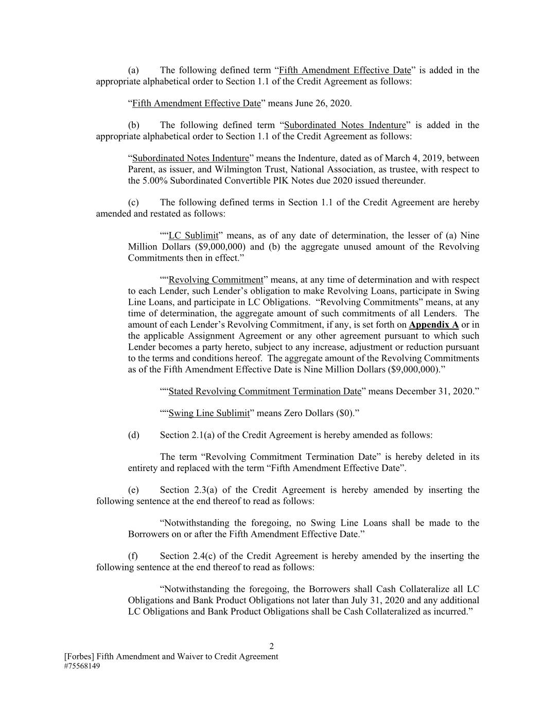 (a)以下定义的术语“第五次修订生效日期”按适当的字母顺序添加到信用协议第1.1节中,如下所示:“第五次修订生效日期”是指2020年6月26日。(b)以下定义的术语“次级票据义齿”按适当的字母顺序添加到信用协议的第1.1节中,如下所示:“次级票据义齿”是指截至2019年3月4日,母公司之间的义齿,作为发行人和威尔明顿信托,全国协会,作为受托人,关于根据该协议发行的2020年到期的5.00%次级可转换PIK票据。(c)信用协议第1.1节中定义的以下术语特此修订并重述如下:““LC Sublimit”是指,截至任何确定日期,(a)九百万美元(9,000,000美元)和(b)当时有效的循环承诺的未使用总额。”““循环承诺”是指,在任何时候确定并与 对于每个贷方,该贷方有义务提供循环贷款、参与周转线贷款和参与信用证义务。“循环承诺”是指在任何确定的时间,所有贷款人的此类承诺的总额。每个贷方的循环承诺的金额(如有)载于附录A或适用的转让协议或该贷方成为本协议一方的任何其他协议,但可根据条款和条件进行任何增加、调整或减少。条件。截至第五次修订生效日期,循环承诺的总额为900万美元(9,000,000美元)。”““规定的循环承诺终止日期”是指2020年12月31日。”““Swing Line Sublimit”是指零美元($0)。”(d)信用协议第2.1(a)条特此修改如下:“循环承诺终止日”一词在此全部删除并替换为 “第五修正案生效日期”。(e)信贷协议第2.3(a)条特此修订,在其末尾插入以下句子如下:“尽管有上述规定,在第五次修订时或之后不得向借款人提供周转线贷款生效日期。”(f)信用协议第2.4(c)条特此修改,在其末尾插入以下句子如下:“尽管有上述规定,借款人应不迟于7月31日,2020年以及任何额外的信用证债务和银行产品债务应在发生时以现金抵押。”2[福布斯]信用协议第五修正案和豁免# 75568149