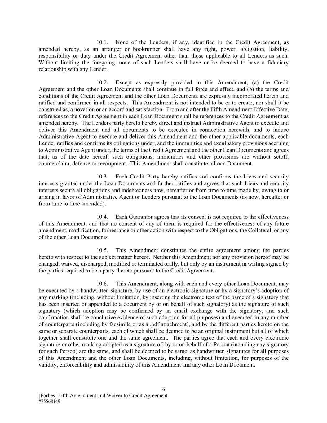 10.1.除适用于所有贷款人的权利、权力、义务、责任、责任或义务外,在经修订的信贷协议中确定为安排人或账簿管理人的任何贷款人(如有)均不享有信贷协议项下的任何权利、权力、义务、责任、责任或义务。在不限制上述规定的情况下,此类贷款人不得与任何贷款人具有或被视为具有信托关系。10.2.除本修正案明确规定外,(a)信贷协议和其他贷款文件应继续完全有效,并且(b)信贷协议和其他贷款文件的条款和条件明确纳入本修正案并获得批准并在各方面得到确认。本修正案无意成为或创造,也不应被解释为更新或协议和满足。自第五次修订生效日期起及之后,每份贷款文件中对信贷协议的引用应指经修订的信贷协议 特此。贷款方特此指示和指示行政代理人签署和交付本修正案以及与本修正案有关的所有文件,并促使行政代理人签署和交付本修正案和其他适用文件,每个贷款人批准并确认其义务在下面,以及行政代理人根据信贷协议和其他贷款文件的条款产生的豁免和免责条款,并同意,截至本协议之日,此类义务、豁免和其他条款不得抵消、反索赔、抗辩或补偿。本修正案应构成贷款文件。10.3.每一信用方特此批准并确认根据贷款文件授予的留置权和担保权益,并进一步批准并同意此类留置权和担保权益保证现在、以后或不时由、由于或产生的所有义务和债务的 行政代理人或贷款人根据贷款文件(如现在、以后或不时修订)。10.4.每个担保人同意,本修正案的有效性不需要其同意,并且任何未来的修订、修改、宽容或其他与义务、抵押品、或任何其他贷款文件。10.5.本修正案构成双方就本协议标的达成的完整协议。本修正案或其任何条款均不得口头更改、放弃、解除、修改或终止,而只能通过根据信用协议要求成为其中一方的各方签署的书面文书。10.6.本修正案以及每一份其他贷款文件都可以通过手写签名、使用电子签名或通过签字人采用任何标记(包括, 不限于,通过插入由该签字人或代表该签字人插入或附加到文件中的签字人姓名的电子文本作为该签字人的签名(可以通过与签字人的电子邮件交换来确认采用,并且此类确认应是出于所有目的采用此类确认的最终证据)并在任何数量的副本(包括通过传真或作为.pdf附件)中执行,并且由本协议的不同方在相同或单独的副本上执行,每一份均应被视为原始文书,但所有这些共同构成一份相同的协议。双方同意,由某人(包括该人的任何签字人)或代表某人(包括该人的任何签字人)作为签名采用的每一个电子签名或其他标记都是相同的,并应被视为相同,作为本修正案和其他贷款文件的所有目的的手写签名,包括但不限于, 为本修正案和任何其他贷款文件的有效性、可执行性和可接受性的目的。6[福布斯]信用协议第五修正案和豁免# 75568149