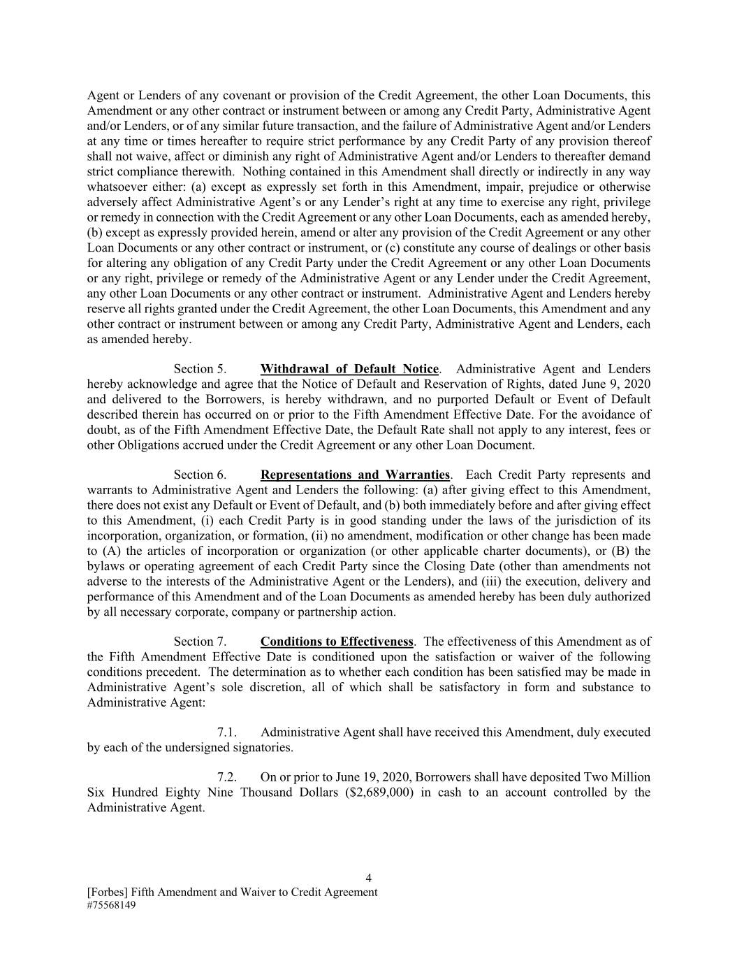 信贷协议、其他贷款文件、本修正案或任何信贷方、行政代理人和/或贷款人之间或之间的任何其他合同或文书的任何契约或规定的代理人或贷款人,或任何类似的未来交易,行政代理人和/或贷款人在此后的任何时间或时间未能要求任何信贷方严格履行其任何规定,不应放弃、影响或减少行政代理人和/或贷款人此后要求严格遵守的任何权利。本修正案中的任何内容均不得以任何方式直接或间接地:(a)除本修正案明确规定外,损害、损害或以其他方式对行政代理人或任何贷款人在任何时候行使任何权利的权利产生不利影响,与信用协议或任何其他贷款文件有关的特权或补救措施,均在此修订,(b)除非在此明确规定,否则修改或更改 信用协议或任何其他贷款文件或任何其他合同或文书的任何规定,或(c)构成改变任何信用方在信用协议或任何其他贷款文件项下的任何义务或任何权利的任何交易过程或其他基础,行政代理人或任何贷款人根据信贷协议、任何其他贷款文件或任何其他合同或文书享有的特权或补救措施。行政代理人和贷款人特此保留根据信贷协议、其他贷款文件、本修正案以及任何信贷方、行政代理人和贷款人之间的任何其他合同或文书授予的所有权利,每一项均经特此修订。第5节。撤回违约通知。行政代理人和贷款人特此承认并同意,特此撤回日期为2020年6月9日并交付给借款人的违约和保留权利通知,并且其中描述的所谓违约或违约事件没有发生 在第五次修订生效日期或之前。为免生疑问,自第五次修订生效日期起,违约率不适用于根据信贷协议或任何其他贷款文件产生的任何利息、费用或其他义务。第6节。陈述和保证。每个信用方向行政代理人和贷款人陈述并保证以下内容:(a)在本修正案生效后,不存在任何违约或违约事件,以及(b)在本修正案生效之前和之后,(i)每个信用方在其成立、组织或组建的司法管辖区的法律下信誉良好,未对(A)公司章程或组织章程(或其他适用的章程文件),(b)自截止日期起每个信用方的章程或经营协议(不损害信用方利益的修订除外) 行政代理人或贷款人),以及本修正案和经修订的贷款文件的签署、交付和履行已获得所有必要的公司、公司或合伙行动的正式授权。第7节。有效性的条件。本修正案自第五次修订生效日期起生效的条件是满足或放弃以下先决条件。行政代理人可自行决定是否满足每项条件,所有这些条件在形式和实质方面均应令行政代理人满意:7.1。行政代理人应已收到本修正案,并由每个签署人正式签署。7.2.在2020年6月19日或之前,借款人应将268.9万美元(2,689,000美元)现金存入行政代理人控制的账户。4[福布斯]第五修正案和信用豁免 协议# 75568149