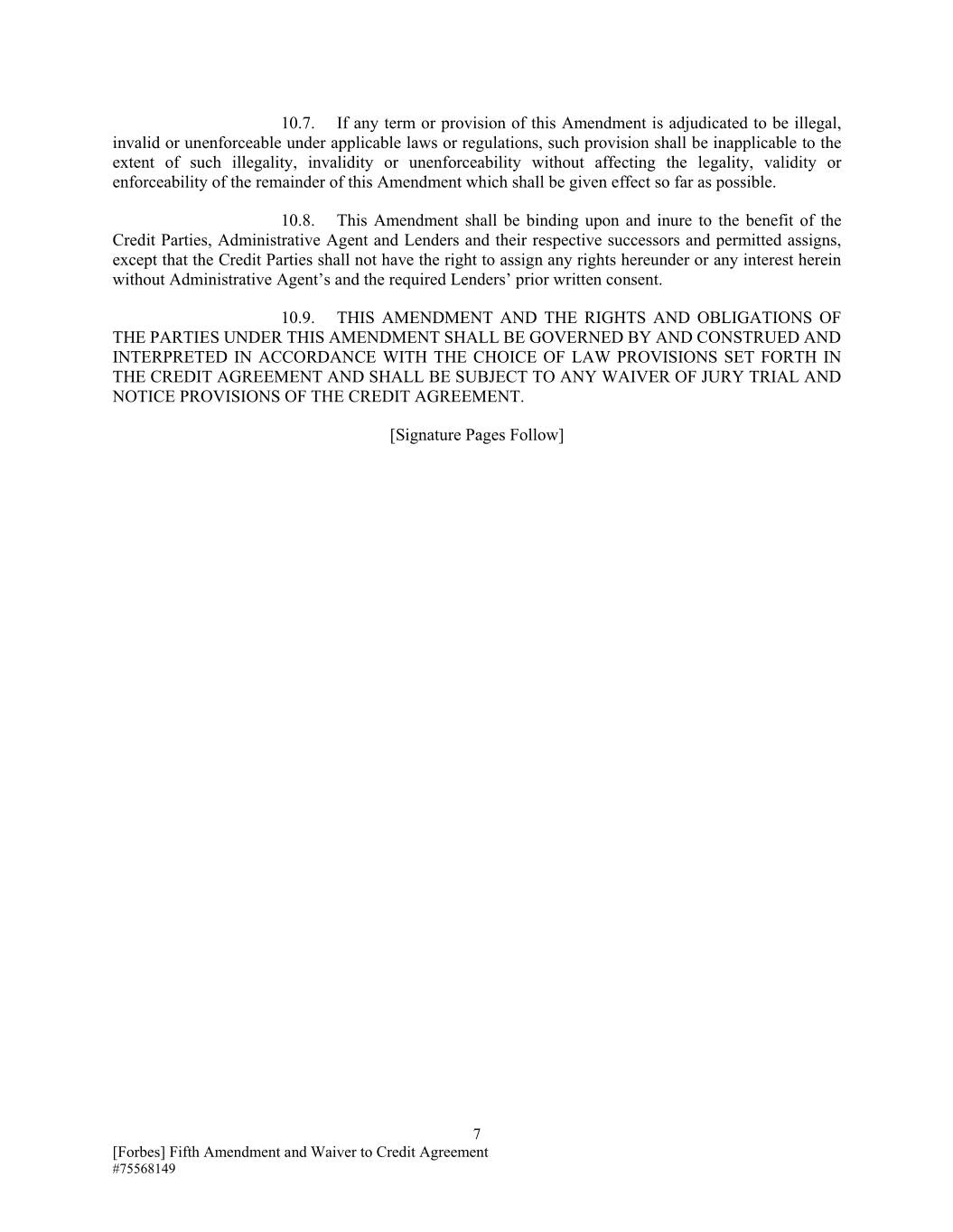 10.7.如果本修正案的任何条款或规定根据适用的法律或法规被裁定为非法、无效或不可执行,则该规定在不影响合法性的情况下,在此类非法、无效或不可执行的范围内不适用,本修正案其余部分的有效性或可执行性应尽可能生效。10.8.本修正案对信贷方、行政代理人和贷方及其各自的继承人和允许的受让人具有约束力并符合其利益,除非未经行政代理人和所需贷款人事先书面同意,信贷方无权转让本协议项下的任何权利或任何利益。10.9.本修正案以及各方在本修正案项下的权利和义务应受信用协议中规定的法律选择条款管辖,并根据其解释和解释,并应受 任何放弃陪审团审判和信用协议的通知条款。[签名页跟随]7[福布斯]第五修正案和信用协议豁免# 75568149