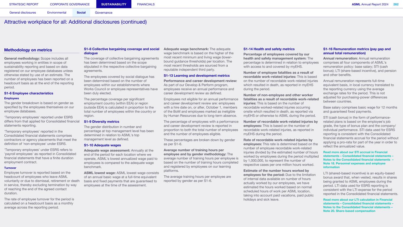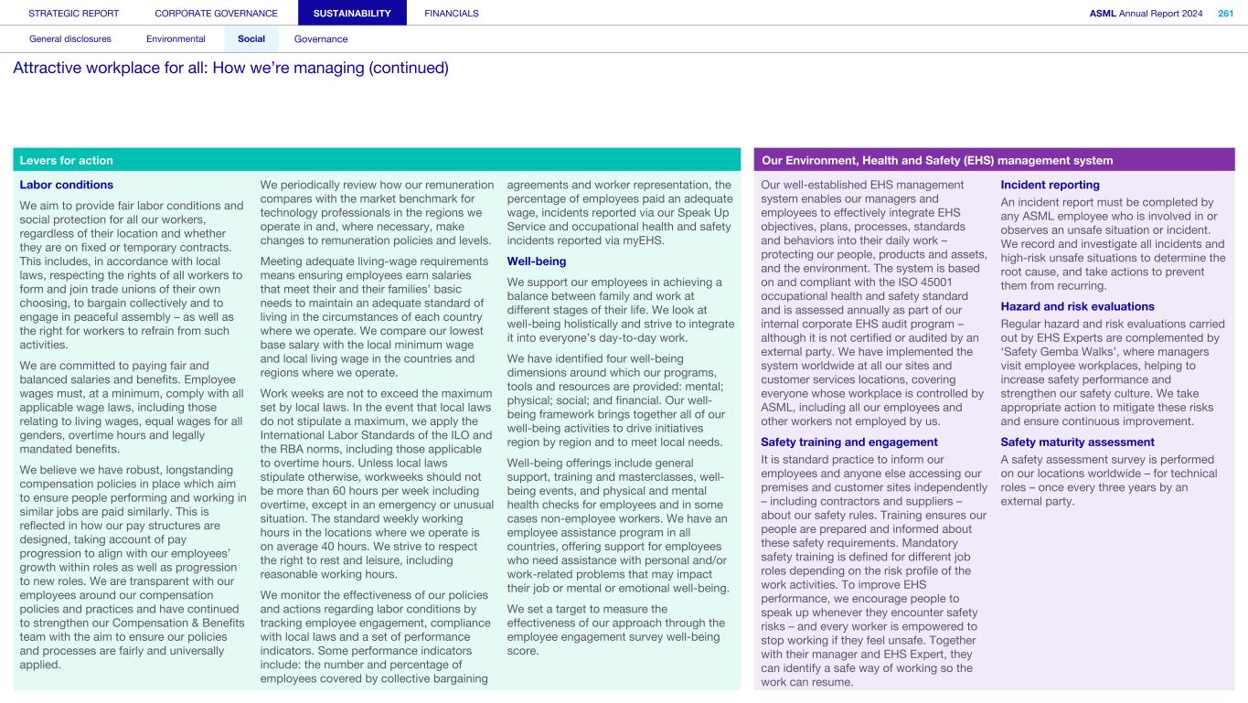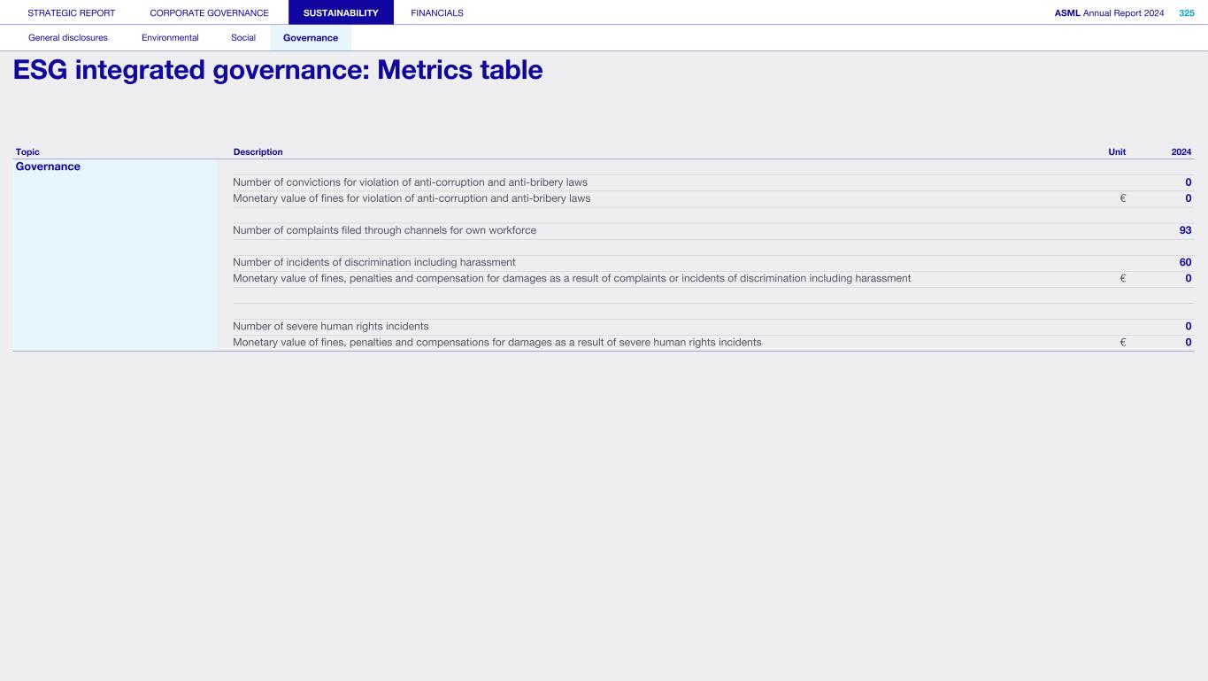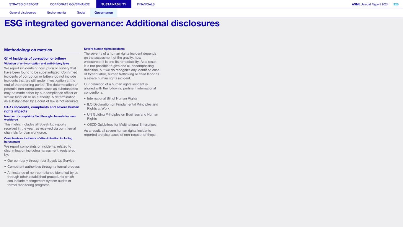 关于衡量标准的方法论G1-4腐败或贿赂事件违反反腐败和反贿赂法律我们报告的腐败或贿赂事件已被发现有证据。已确认的贪污受贿事件不包括报告期末仍在调查的事件。经证实的潜在不合规案件的确定可能由我们的合规官员或类似职能或权威机构作出。不需要法院证实的裁定。S1-17事件、投诉和严重的人权影响通过渠道为自己的员工提出的投诉数量该指标包括当年收到的所有Speak Up报告,如通过我们的内部渠道为自己的员工收到的。投诉或包括骚扰在内的歧视事件我们报告投诉或事件,与包括骚扰在内的歧视有关,由:•我们的公司通过我们的Speak Up Service •主管当局通过正式程序•我们通过其他既定程序(可能包括管理系统审计或正式监测计划)确定的不遵守情况实例严重人权事件人权事件的严重性取决于对严重性、其传播范围及其补救能力的评估。因此,不可能给出一个包罗万象的定义,但我们确实承认任何已确定的强迫劳动、人口贩运或童工案件都是严重的人权事件。我们对人权事件的定义与以下相关国际公约保持一致:•国际人权法案•国际劳工组织关于工作中的基本原则和权利的宣言•联合国商业和人权指导原则•经合组织关于跨国企业的指导方针因此,报告的所有严重人权事件也都是不尊重这些的案例。战略报告公司治理可持续发展金融ASML年度报告2024326一般披露环境社会治理ESG一体化治理:补充披露