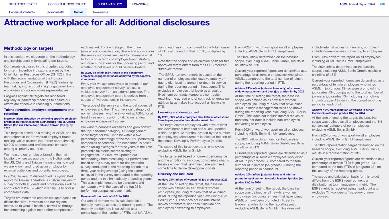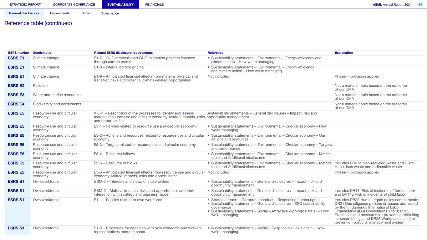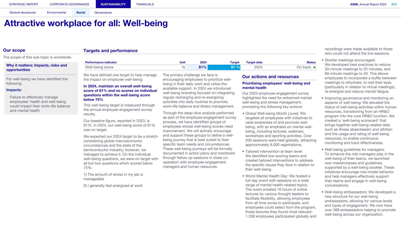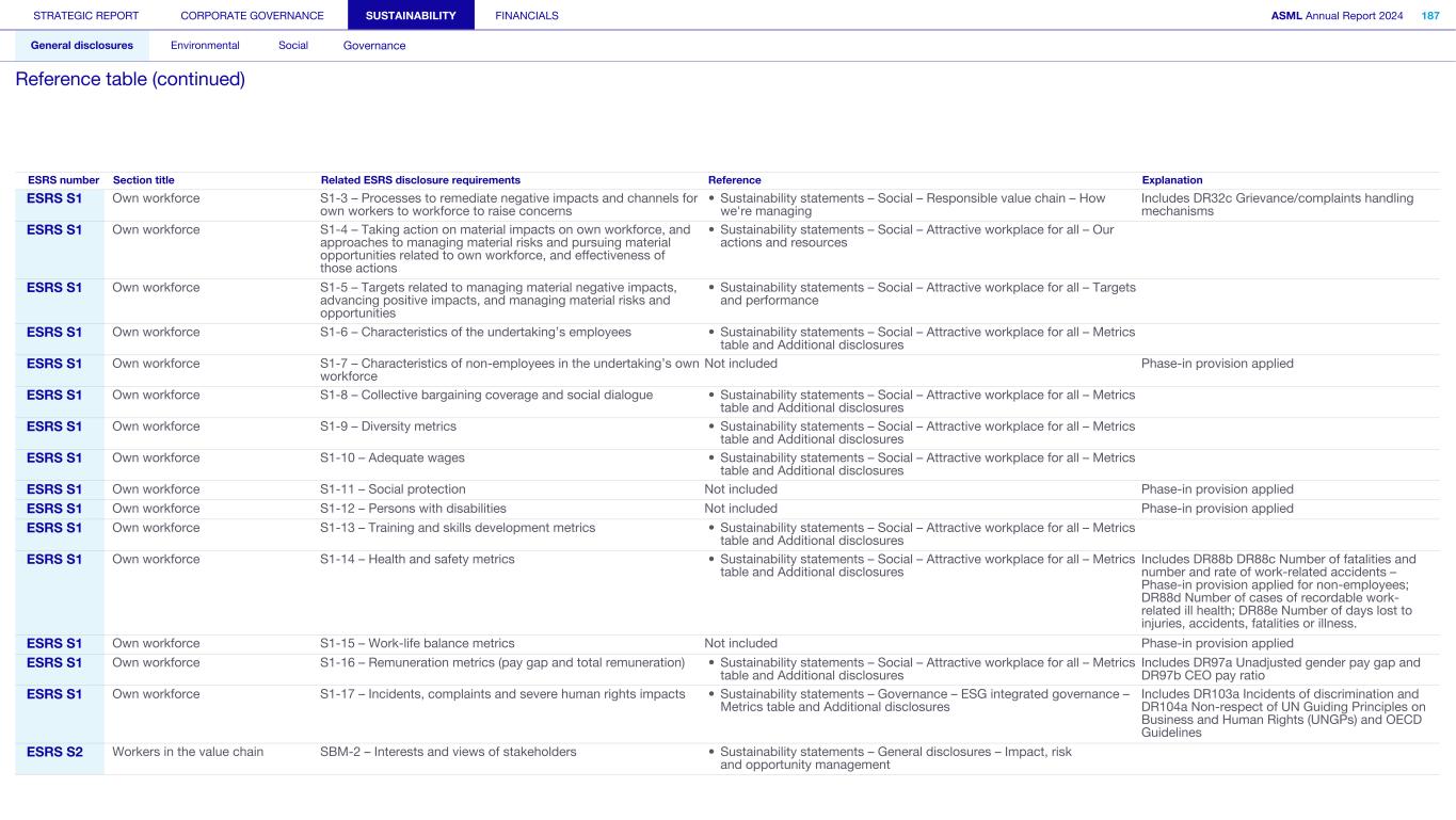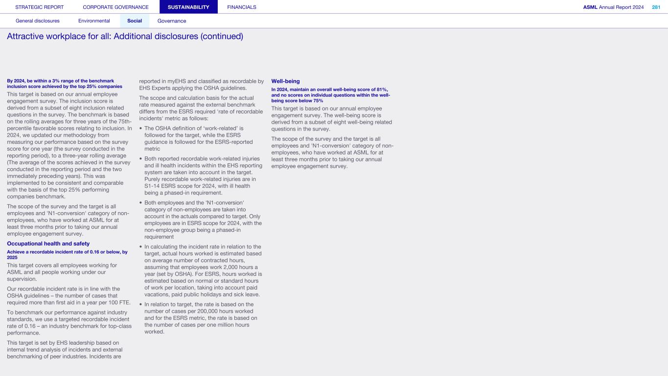 关于衡量标准的方法论G1-4腐败或贿赂事件违反反腐败和反贿赂法律我们报告的腐败或贿赂事件已被发现有证据。已确认的贪污受贿事件不包括报告期末仍在调查的事件。经证实的潜在不合规案件的确定可能由我们的合规官员或类似职能或权威机构作出。不需要法院证实的裁定。S1-17事件、投诉和严重的人权影响通过渠道为自己的员工提出的投诉数量该指标包括当年收到的所有Speak Up报告,如通过我们的内部渠道为自己的员工收到的。投诉或包括骚扰在内的歧视事件我们报告投诉或事件,与包括骚扰在内的歧视有关,由:•我们的公司通过我们的Speak Up Service •主管当局通过正式程序•我们通过其他既定程序(可能包括管理系统审计或正式监测计划)确定的不遵守情况实例严重人权事件人权事件的严重性取决于对严重性、其传播范围及其补救能力的评估。因此,不可能给出一个包罗万象的定义,但我们确实承认任何已确定的强迫劳动、人口贩运或童工案件都是严重的人权事件。我们对人权事件的定义与以下相关国际公约保持一致:•国际人权法案•国际劳工组织关于工作中的基本原则和权利的宣言•联合国商业和人权指导原则•经合组织关于跨国企业的指导方针因此,报告的所有严重人权事件也都是不尊重这些的案例。战略报告公司治理可持续发展金融ASML年度报告2024326一般披露环境社会治理ESG一体化治理:补充披露