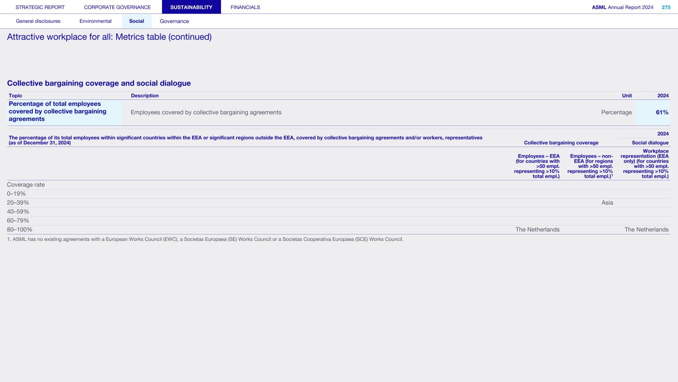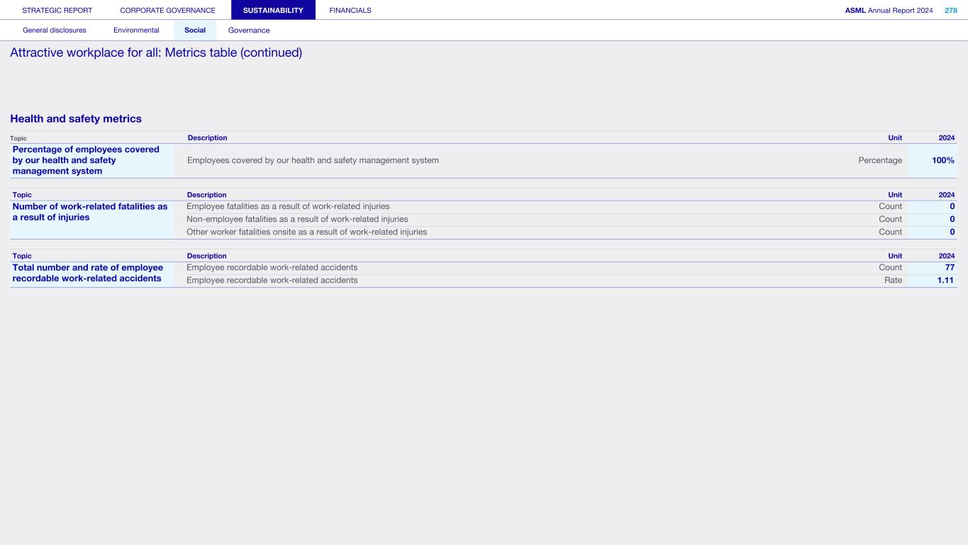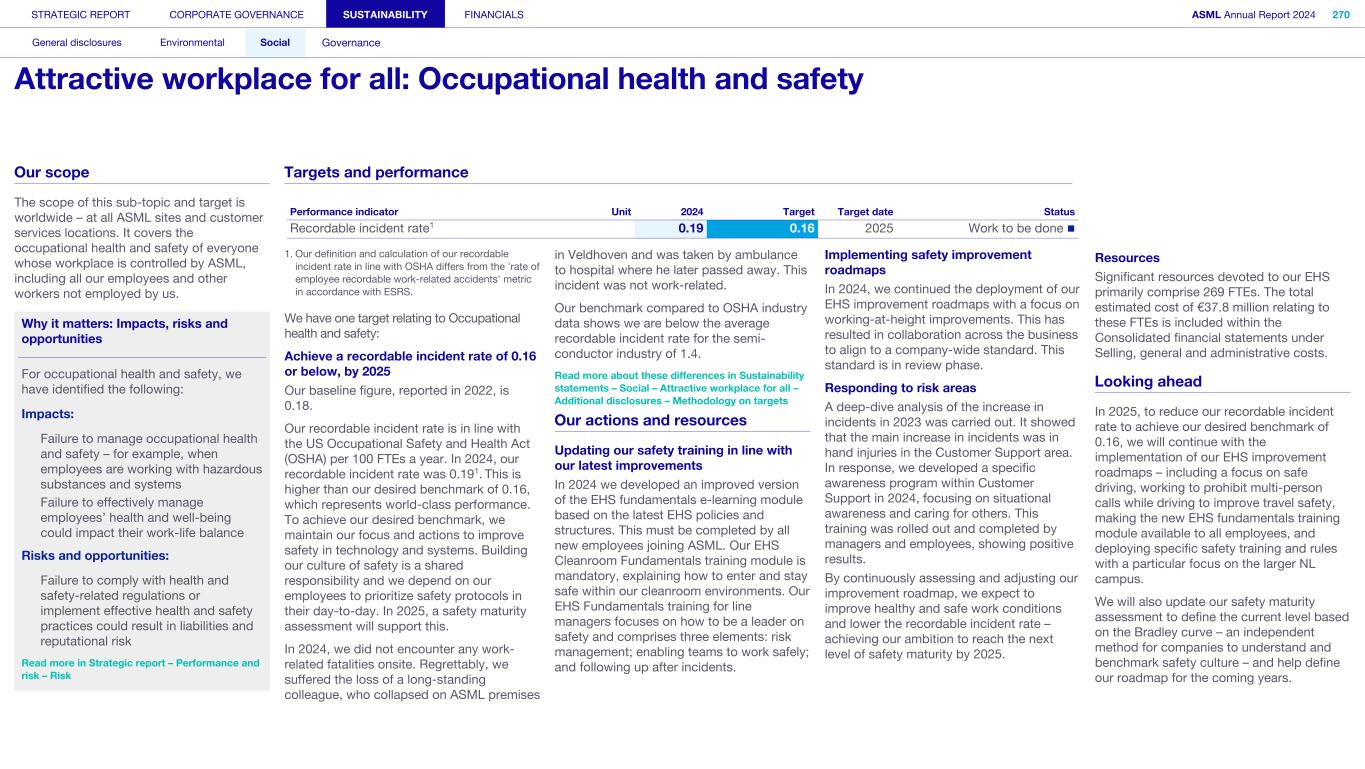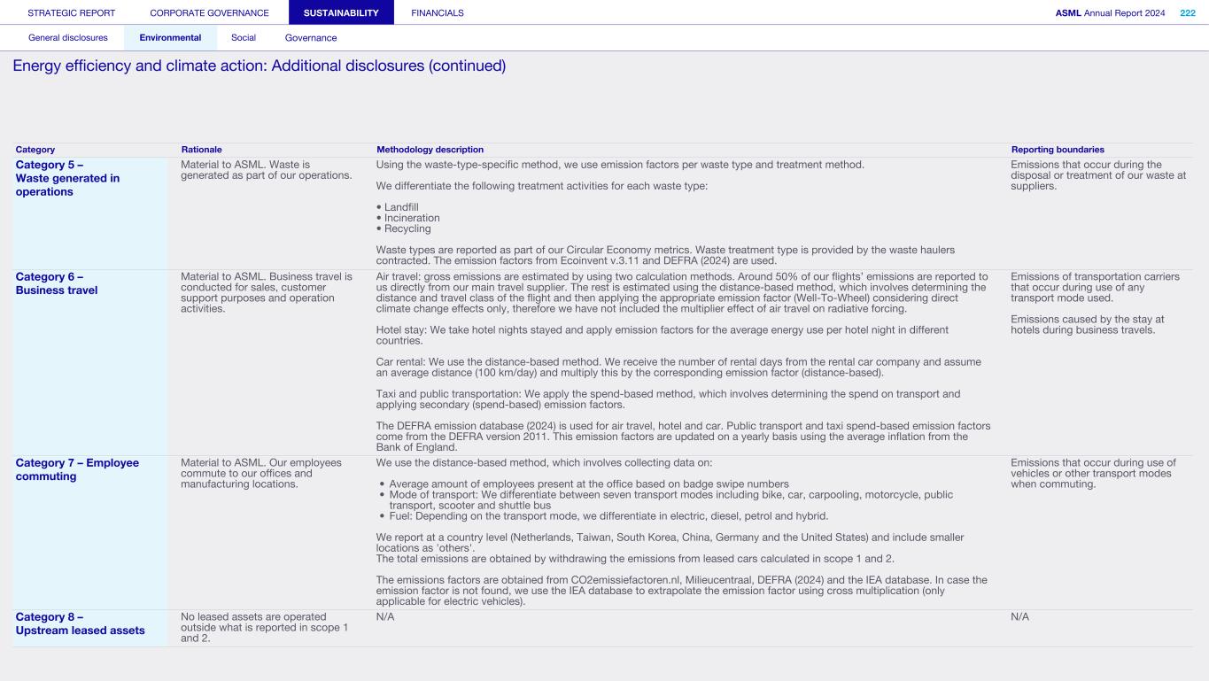 关于衡量标准的方法论G1-4腐败或贿赂事件违反反腐败和反贿赂法律我们报告的腐败或贿赂事件已被发现有证据。已确认的贪污受贿事件不包括报告期末仍在调查的事件。经证实的潜在不合规案件的确定可能由我们的合规官员或类似职能或权威机构作出。不需要法院证实的裁定。S1-17事件、投诉和严重的人权影响通过渠道为自己的员工提出的投诉数量该指标包括当年收到的所有Speak Up报告,如通过我们的内部渠道为自己的员工收到的。投诉或包括骚扰在内的歧视事件我们报告投诉或事件,与包括骚扰在内的歧视有关,由:•我们的公司通过我们的Speak Up Service •主管当局通过正式程序•我们通过其他既定程序(可能包括管理系统审计或正式监测计划)确定的不遵守情况实例严重人权事件人权事件的严重性取决于对严重性、其传播范围及其补救能力的评估。因此,不可能给出一个包罗万象的定义,但我们确实承认任何已确定的强迫劳动、人口贩运或童工案件都是严重的人权事件。我们对人权事件的定义与以下相关国际公约保持一致:•国际人权法案•国际劳工组织关于工作中的基本原则和权利的宣言•联合国商业和人权指导原则•经合组织关于跨国企业的指导方针因此,报告的所有严重人权事件也都是不尊重这些的案例。战略报告公司治理可持续发展金融ASML年度报告2024326一般披露环境社会治理ESG一体化治理:补充披露
