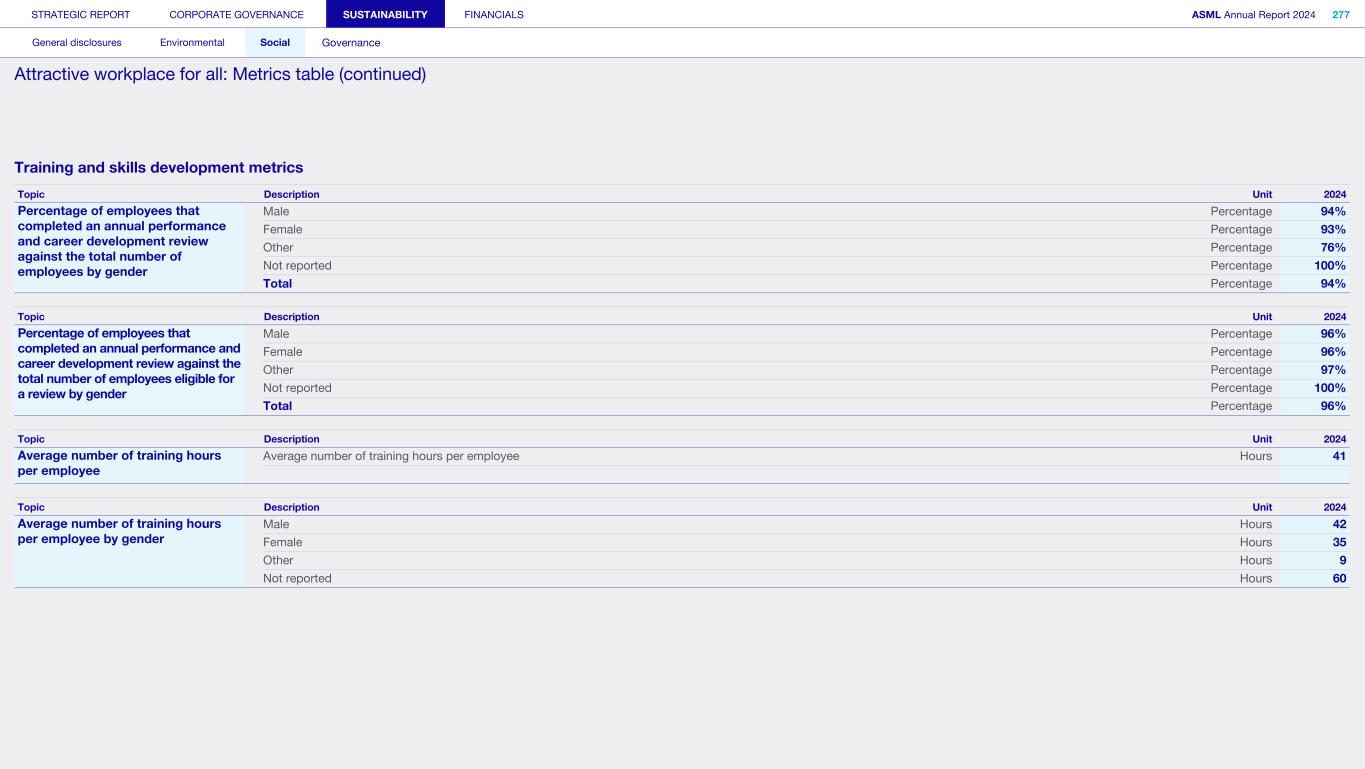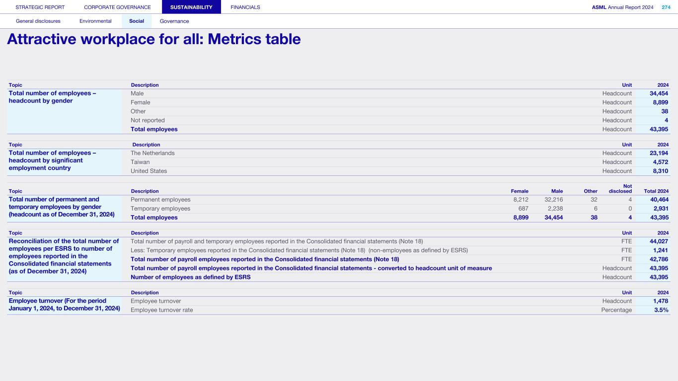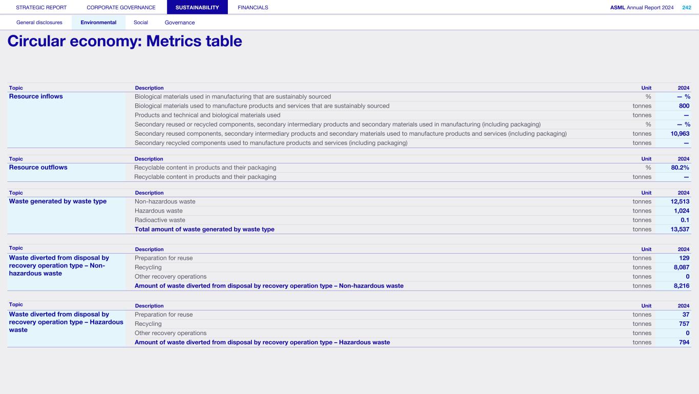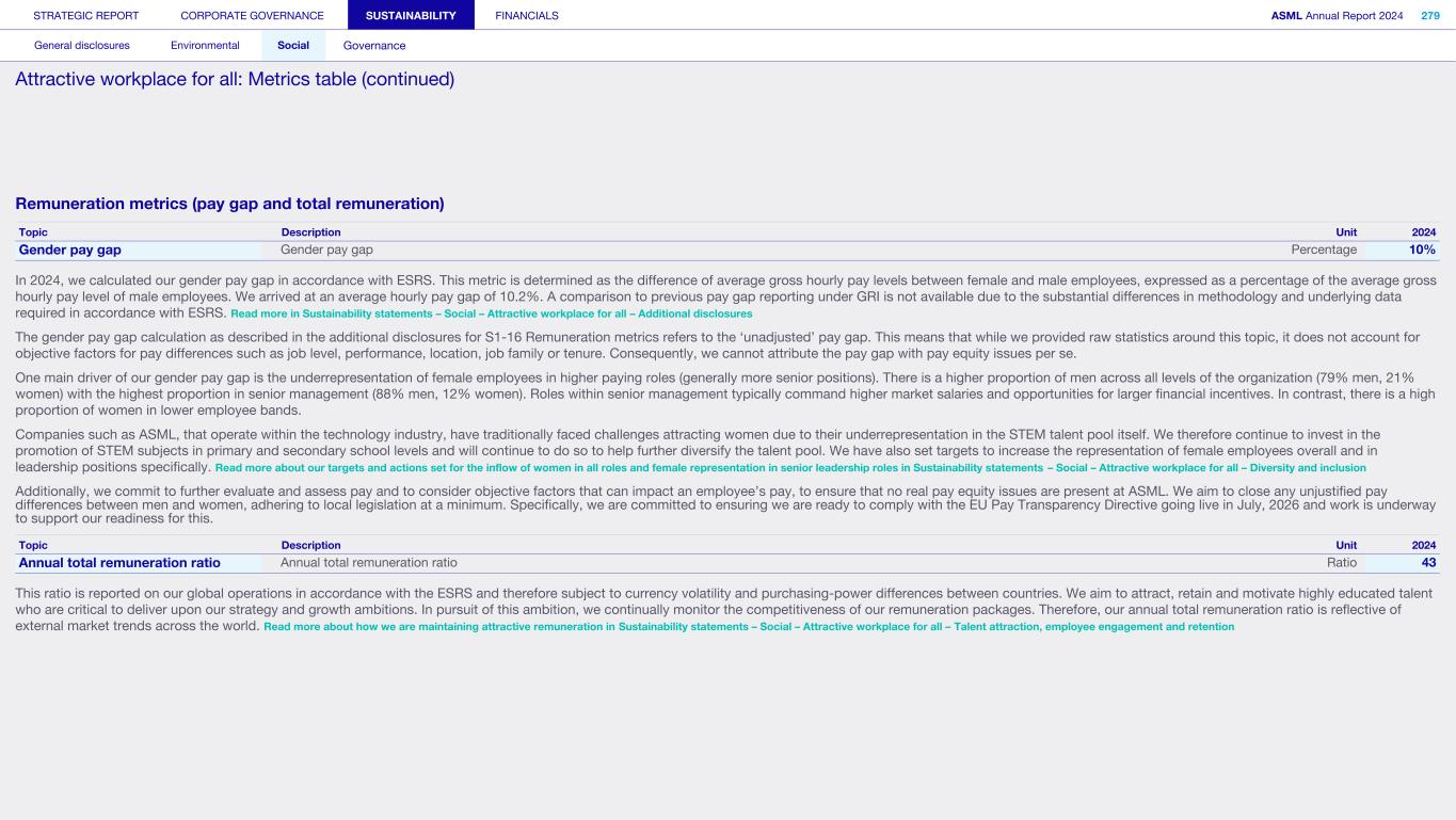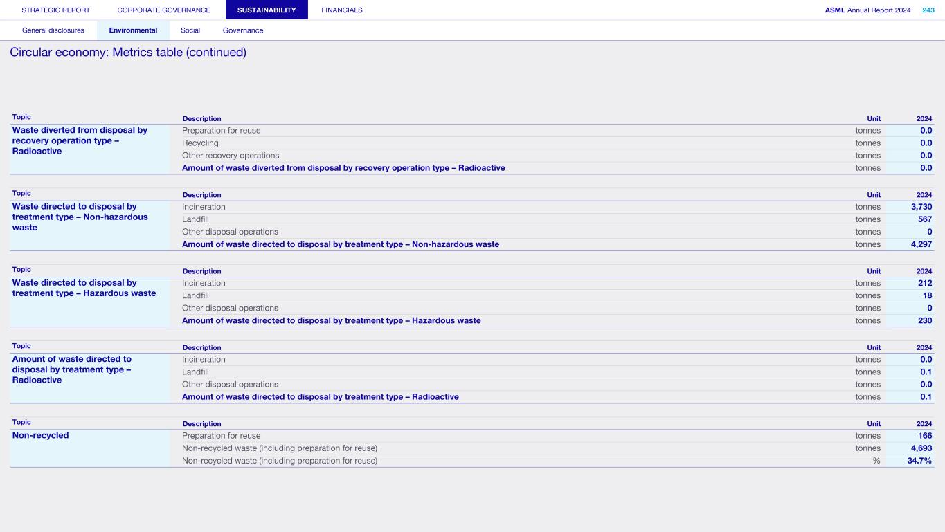 关于衡量标准的方法论G1-4腐败或贿赂事件违反反腐败和反贿赂法律我们报告的腐败或贿赂事件已被发现有证据。已确认的贪污受贿事件不包括报告期末仍在调查的事件。经证实的潜在不合规案件的确定可能由我们的合规官员或类似职能或权威机构作出。不需要法院证实的裁定。S1-17事件、投诉和严重的人权影响通过渠道为自己的员工提出的投诉数量该指标包括当年收到的所有Speak Up报告,如通过我们的内部渠道为自己的员工收到的。投诉或包括骚扰在内的歧视事件我们报告投诉或事件,与包括骚扰在内的歧视有关,由:•我们的公司通过我们的Speak Up Service •主管当局通过正式程序•我们通过其他既定程序(可能包括管理系统审计或正式监测计划)确定的不遵守情况实例严重人权事件人权事件的严重性取决于对严重性、其传播范围及其补救能力的评估。因此,不可能给出一个包罗万象的定义,但我们确实承认任何已确定的强迫劳动、人口贩运或童工案件都是严重的人权事件。我们对人权事件的定义与以下相关国际公约保持一致:•国际人权法案•国际劳工组织关于工作中的基本原则和权利的宣言•联合国商业和人权指导原则•经合组织关于跨国企业的指导方针因此,报告的所有严重人权事件也都是不尊重这些的案例。战略报告公司治理可持续发展金融ASML年度报告2024326一般披露环境社会治理ESG一体化治理:补充披露