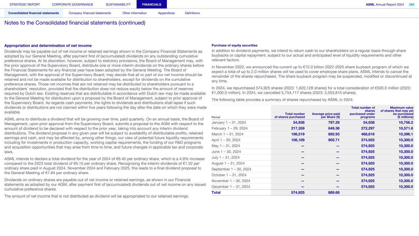 在支付任何已发行的累积优先股的(累计)股息之后,可从我们股东大会通过的公司财务报表中显示的净收入或留存收益中拨付和确定股息。然而,在符合法定条文的规定下,管理委员会可酌情在任何财政年度的财务报表获股东大会通过前,经监事会事先批准,派发普通股的一次或多次中期股息。经监事会批准,管理委员会可决定保留我们的全部或部分净收入,不向股东分配,但累积优先股的股息除外。那些未被保留的净收入可以根据股东决议分配给股东,前提是分配不会使权益低于荷兰法律要求的储备金金额。根据荷兰法律可分配的现有储备可根据管理委员会的提议提供给股东大会进行分配,但须事先获得监事会的批准。关于现金支付,股息和分配的权利,如果在提供之日的次日后五年内未主张该等股息或分配,则该权利失效。ASML的目标是分配随时间推移而增长的股息,每季度支付一次。按年度计算,管理委员会在获得监事会事先批准后,就上一年度的股息宣布金额向股东周年大会提出建议,同时考虑到任何中期股息分配。任何一年的股息提议将取决于可分配利润、留存收益和现金的可用性,并可能受到(其中包括)我们对未来潜在流动性需求的看法的影响,这些需求包括对产能的投资、营运资金需求、我们研发计划的资金以及可能不时出现的收购机会,以及适用的税收和公司法的未来变化。ASML拟宣布2024年的股息总额为每股普通股6.40欧元,与2023年的股息总额每股普通股6.10欧元相比,增长4.9%。确认在2024年8月、2024年11月和2025年2月支付的每股普通股1.52欧元的中期股息,这导致向股东大会提出每股普通股1.84欧元的末期股息提案。普通股股息应从净收入或留存收益中支付,如我们的年度股东大会通过的财务报表所示,在任何已发行的累积优先股的净收入中首先支付(累积)股息之后。未作为股息分配的净收益金额将拨入我们的留存收益。购买股本证券除了支付股息外,我们打算通过股票回购或资本偿还定期向我们的股东返还现金,这取决于我们实际和预期的流动性需求水平以及其他相关因素。2022年11月,我们宣布了目前高达120亿欧元的2022-2025年股票回购计划,我们预计该计划将总共高达200万股用于支付员工股票计划。ASML拟注销剩余回购股份。股份回购计划可随时暂停、修改或终止。2024年,我们回购了574,925股(2023年:1,620,128股),总对价为5亿欧元(2023年:10亿欧元)。2024年注销5,754,117股(2023年:3,553,815股)。下表汇总了2024年ASML回购的股份:期间购买的股份总数每股支付的平均价格(欧元)根据计划购买的股份总数可能尚未购买的股份的最大价值(欧元百万)2024年1月1日– 31日54,938797.2954,93810,756.2 2月1日– 29日2024年217,359849.36 272,29710,571.6 3月1日– 31日,2024年196,519892.93 468,81610,396.1 4月1日– 30日,2024年106,109905.7 1574,92510,300.0 2024年5月1日– 31日—— 574,92510,300.0 6月1日– 30日,2024 —— 574,92510,300.02024年7月1日– 31日—— 574,92510,300.02024年8月1日– 31日—— 574,92510,300.02024年9月1日– 30日—— 574,92510,300.02024年10月1日– 31日—— 574,92510,300.02024年11月1日– 30日—— 574,92510,300.02024年12月1日– 31日—— 574,92510,300.0合计574,925869.68战略报告公司治理可持续财务ASML年度报告2024368合并财务报表公司财务报表其他信息附录定义合并财务报表附注(续)
