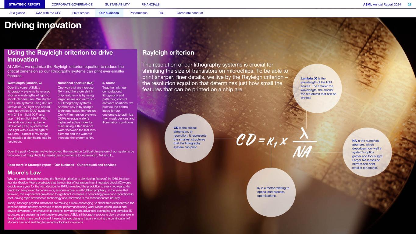 在ASML使用瑞利准则驱动创新,我们优化了瑞利准则方程以降低临界尺寸,这样我们的光刻系统就可以打印出越来越小的特征。波长(lambda,λ)数值孔径(NA)k1因数多年来,ASML的光刻系统已经使用更短波长的光来缩小芯片特征。我们从使用365nm紫外(UV)光的i-line系统开始,加入了248nm光(KRF)和后来的193nm光(ARF)的深紫外(DUV)系统。随着我们的极紫外(EUV)系统的加入,该系统使用波长为13.5 nm的光——几乎是X射线范围——我们实现了分辨率的重大飞跃。我们增加NA ——从而缩小芯片特性——的一种方法是在我们的光刻系统中使用更大的镜头和镜子。另一种方式是使用一种叫做沉浸式的技术。我们的ArF浸没式系统(DUV)通过在最后一个透镜元件和晶片之间保持一层薄薄的水来提高系统的NA,从而利用水的更高折射率。连同我们的计算光刻和图案化控制软件解决方案,我们为客户提供控制回路,以优化他们的掩模设计和照明条件。在过去的40年里,我们通过对波长NA和k1进行改进,将系统的分辨率(临界尺寸)提高了两个数量级。在战略报告中阅读更多内容–我们的业务–我们的产品和服务摩尔定律为什么我们如此专注于使用瑞利准则来缩小芯片特性?1965年,英特尔的联合创始人Gordon Moore预测,在接下来的十年里,集成电路(IC)中的晶体管数量将每年翻一番。1975年,他将预测修改为每两年一次。事实证明,他的预言是正确的——或者,正如一些人所说,这是一个自我实现的预言。在随后的几年里,这种指数级的增长导致计算能力的显着提高和成本的降低,推动了半导体行业技术和创新的快速进步。如今,尽管物理限制使晶体管进一步缩小变得更具挑战性,但半导体行业继续利用摩尔所说的‘电路和设备的灵巧性’来提升性能。创新的芯片设计、新材料、先进封装和复杂的3D结构正支撑着行业的进步。ASML的光刻产品在这些先进设计以负担得起的价格大规模生产中发挥着至关重要的作用,这些设计确保了摩尔定律的延续并支持未来的技术创新。战略报告公司治理可持续性财务ASML年度报告202428一览与CEO的问答2024故事我们的业务绩效风险企业行为推动创新瑞利准则我们光刻系统的分辨率对于缩小微芯片上晶体管的尺寸至关重要。为了能够打印出更清晰、更精细的细节,我们遵循瑞利标准——分辨率方程,它决定了可以打印在芯片上的特征有多小。CD是关键维度,或者说分辨率。它代表了光刻系统可以打印的最小结构。Lambda(λ)是光源的波长。波长越小,可以打印的结构就越小。k1是一个与光学和工艺优化有关的因素。NA是数值孔径,它描述了一个系统的光学器件如何很好地收集和聚焦光。更大的NA镜头或镜子可以打印更小的结构。