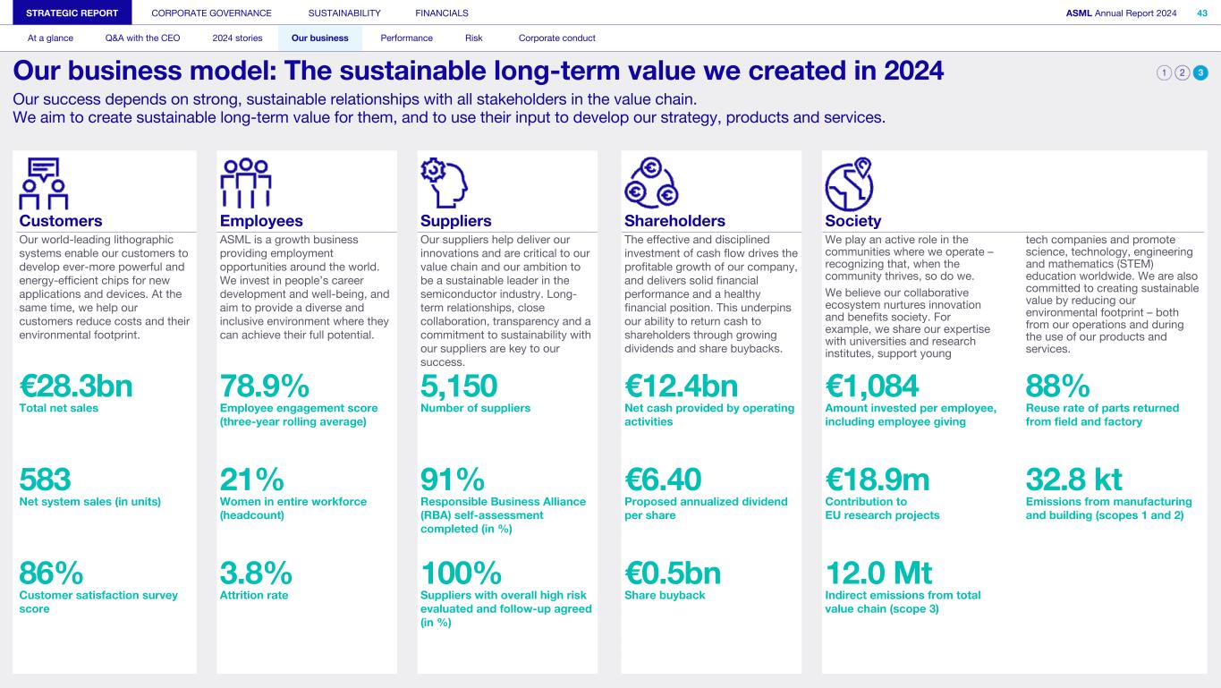 客户员工供应商股东社会我们世界领先的光刻系统使我们的客户能够为新的应用和设备开发越来越强大和节能的芯片。同时,我们帮助我们的客户降低成本和他们的环境足迹。ASML是一家成长型企业,为世界各地提供就业机会。我们投资于人们的职业发展和福祉,旨在提供一个多元化和包容性的环境,让他们能够充分发挥潜力。我们的供应商帮助交付我们的创新,对于我们的价值链和我们成为半导体行业可持续领导者的雄心至关重要。与供应商的长期关系、密切协作、透明度以及对可持续发展的承诺是我们成功的关键。现金流的有效和有纪律的投资推动了我们公司的盈利增长,并提供了稳健的财务业绩和健康的财务状况。这巩固了我们通过不断增加的股息和股票回购向股东返还现金的能力。我们在我们经营所在的社区中发挥着积极作用——认识到,当社区蓬勃发展时,我们也是如此。我们相信,我们的协作生态系统孕育着创新,造福于社会。例如,我们与大学和研究机构分享我们的专业知识,支持年轻的科技公司,并在全球范围内推广科学、技术、工程和数学(STEM)教育。我们还致力于通过减少我们的环境足迹——无论是从我们的运营还是在使用我们的产品和服务期间——来创造可持续的价值。283亿欧元78.9% 5,150欧元124亿欧元1,08488%净销售总额员工敬业度评分(三年滚动平均)供应商数量经营活动提供的净现金每位员工投入的金额,包括员工给予从现场和工厂返回的零件的重复使用率58321% 91%欧元6.40欧元1890万欧元系统净销售额(单位)女性在整个劳动力(人数)负责任的商业联盟(RBA)自我评估完成(%)提议的年度每股股息对欧盟研究项目的贡献制造和建筑的排放(范围1和2)86% 3.8% 100% 5亿欧元12.0公吨客户满意度调查得分流失率总体高风险评估的供应商和后续商定(%)股份回购总价值链的间接排放(范围3)战略报告企业治理可持续财务ASML年度报告2024 43与首席执行官的问答一目了然2024故事我们的业务绩效风险企业行为我们的商业模式:我们在2024年创造的可持续的长期价值我们的成功取决于与价值链中所有利益相关者的牢固、可持续的关系。我们的目标是为他们创造可持续的长期价值,并利用他们的投入来发展我们的战略、产品和服务。