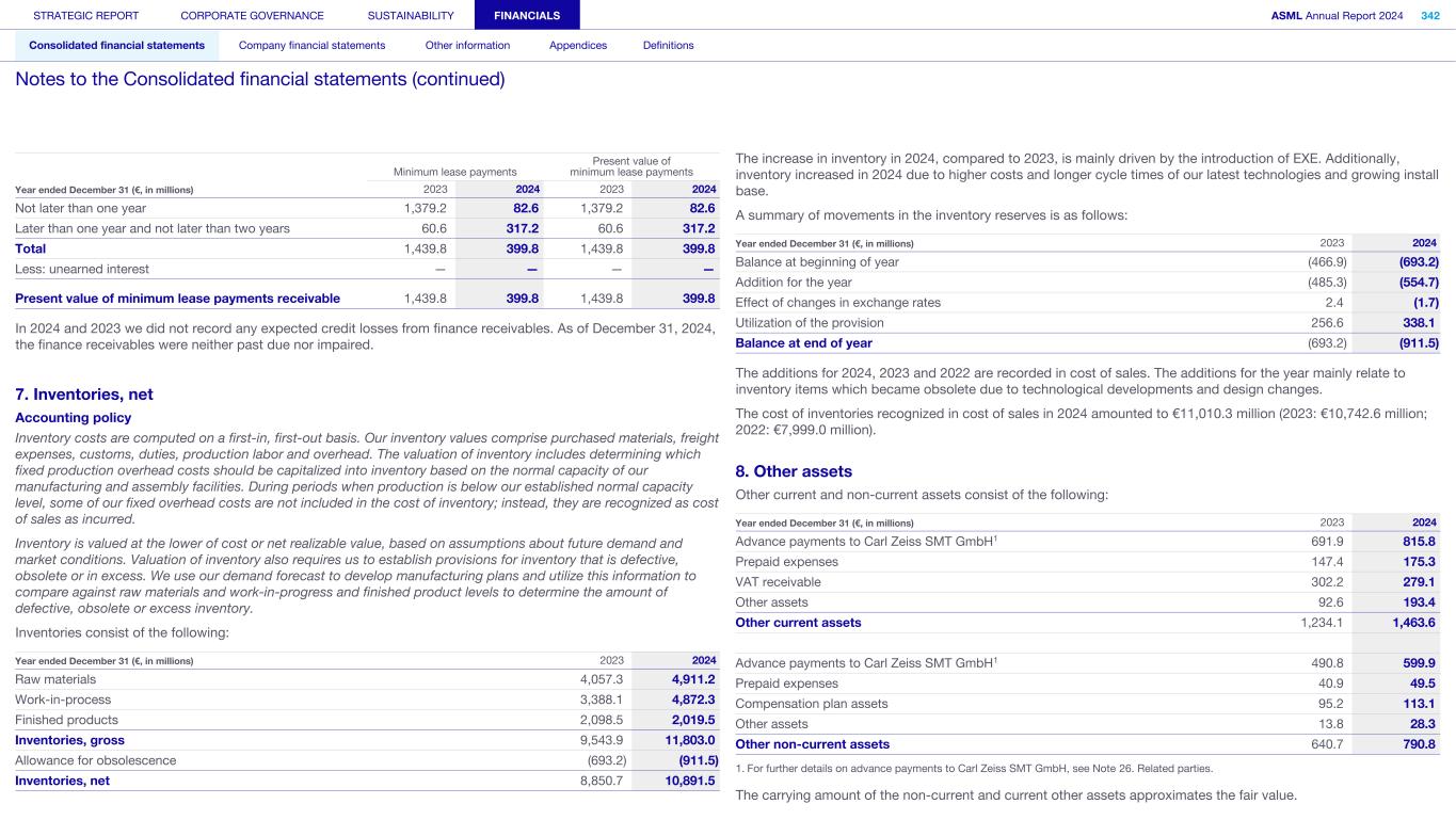 最低租赁付款额截至12月31日的年度最低租赁付款额现值(欧元,百万)2023202420232024不迟于一年1,379.28 2.61,379.28 2.6晚于一年且不迟于两年60.63 17.26 0.63 17.2合计1,439.8 399.81,439.8 399.8减:未实现利息———— 2024年和2023年最低应收租赁付款额现值1,439.8 399.81,439.8 399.8我们没有记录任何应收融资款的预期信用损失。截至2024年12月31日,应收融资款既没有逾期也没有减值。7.存货、净会计政策存货成本按先进先出的原则计算。我们的库存价值包括采购材料、运费、关税、关税、生产人工和间接费用。存货的估值包括根据我们的制造和组装设施的正常产能确定哪些固定生产间接费用应资本化为存货。在生产低于我们既定的正常产能水平期间,我们的一些固定间接费用不包括在库存成本中;相反,它们在发生时被确认为销售成本。存货按照成本与可变现净值孰低估值,基于对未来需求和市场情况的假设。存货估值还要求我们为有缺陷、过时或过剩的存货建立备抵。我们使用我们的需求预测来制定制造计划,并利用这些信息与原材料、在产品和成品水平进行比较,以确定有缺陷、过时或过剩库存的数量。存货包括:截至12月31日止年度(欧元,单位:百万)20232024原材料4,057.34,911.2在制品3,388.14,872.3制成品2,098.52,0 19.5存货,毛额9,543.911,803.0过时备抵(693.2)(911.5)存货,净额8,850.7 10,891.5与2023年相比,2024年存货增加主要是由于引入了EXE。此外,由于成本更高、我们最新技术的周期更长以及安装基数不断增长,2024年的库存有所增加。存货准备金变动汇总如下:截至12月31日止年度(欧元,百万元)20232024年年初余额(466.9)(693.2)当年新增(485.3)(554.7)汇率变动影响2.4(1.7)使用拨备256.63 38.1年末余额(693.2)(911.5)2024年、2023年和2022年新增计入销售成本。本年度的增加主要涉及因技术发展和设计变更而过时的库存项目。2024年在销售成本中确认的存货成本为110.103亿欧元(2023年:10.7426亿欧元;2022年:79.990亿欧元)。8.其他资产其他流动和非流动资产包括:截至12月31日止年度(欧元,单位:百万)20232024预付给Carl Zeiss SMT GmbH1的款项691.98 15.8预付费用147.41 75.3应收增值税302.22 79.1其他资产92.6 193.4其他流动资产1,234.11,463.6预付给Carl Zeiss SMT GmbH1的款项490.85 99.9预付费用40.94 9.5补偿计划资产95.21 13.1其他资产13.8 28.3其他非流动资产640.77 90.81。有关向Carl Zeiss SMT GmbH预付款项的进一步详情,见附注26。关联方。非流动及流动其他资产的账面值与公允价值相近。战略报告公司治理可持续发展金融公司ASML年度报告2024342合并财务报表公司财务报表其他信息附录定义合并财务报表附注(续)