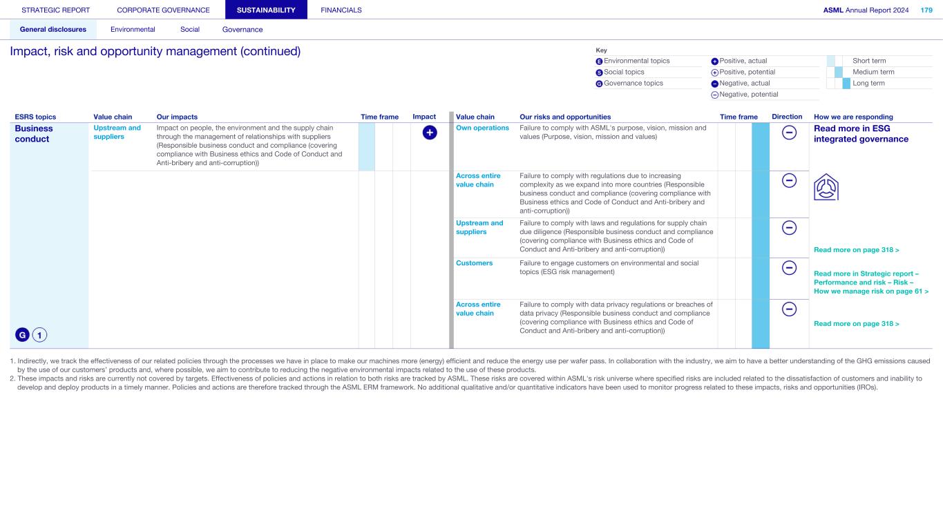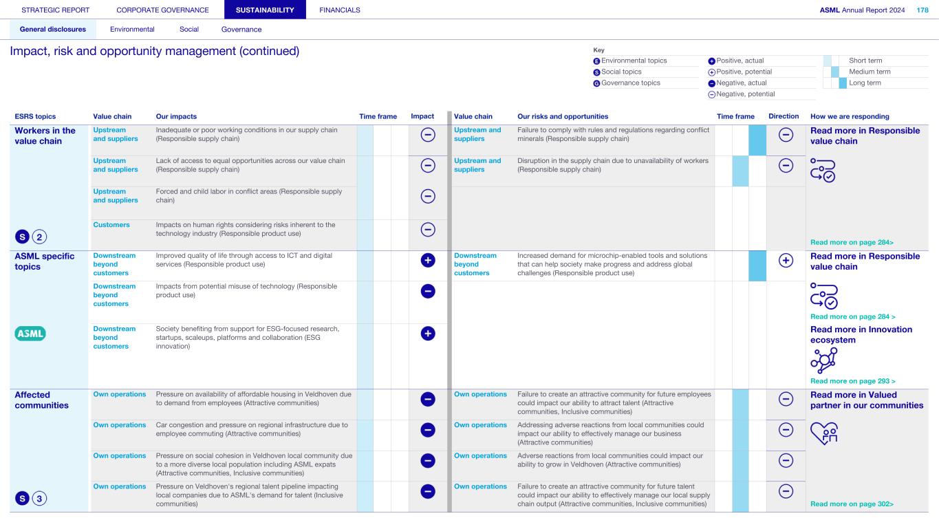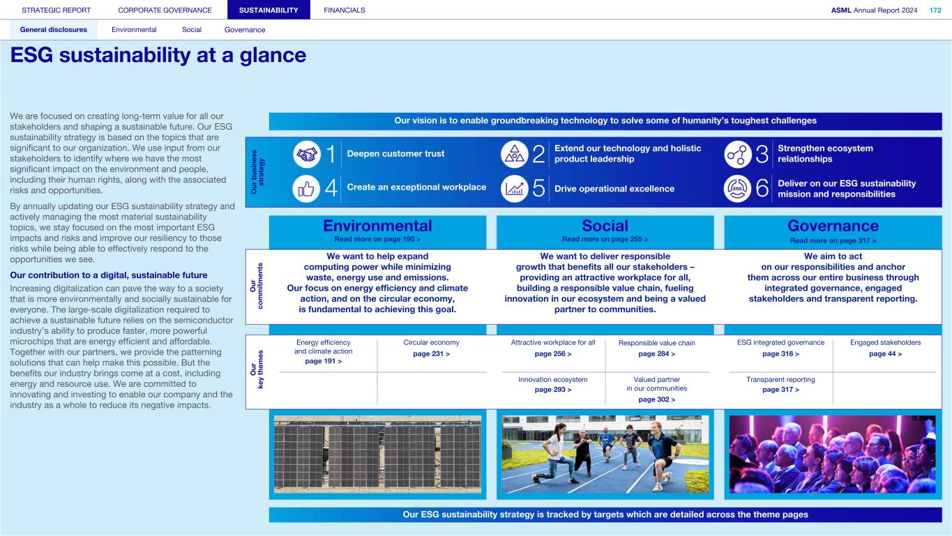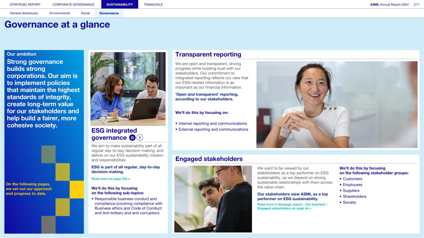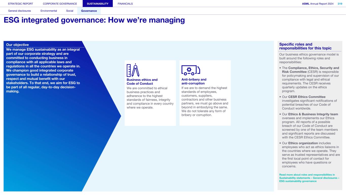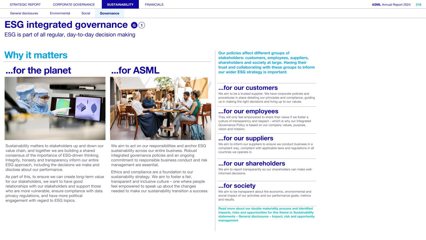战略报告公司治理可持续发展金融学ASML年度报告2024318一般披露环境社会治理ESG综合治理ESG是所有常规、日常决策的一部分,为什么它很重要......对地球来说......对于ASML可持续发展对我们价值链上下的利益相关者都很重要,我们正在一起就ESG驱动思维的重要性建立共同共识。诚信、诚实和透明为我们的整个ESG方法提供了信息,包括我们就业绩做出和披露的决定。作为其中的一部分,为了确保我们能够为我们的利益相关者创造长期价值,我们希望与我们的利益相关者建立良好的关系,支持那些更脆弱的人,确保遵守数据隐私法规,并在ESG主题方面有更多的政治参与。我们的目标是履行我们的责任,并在我们的整个业务中锚定ESG可持续性。稳健的综合治理政策以及对负责任的商业行为和风险管理的持续承诺至关重要。道德和合规是我们可持续发展战略的基础。我们的目标是培养一种公平、透明和包容的文化——在这种文化中,人们感到有能力就使我们的可持续发展转型取得成功所需的变革发表意见。我们的政策影响到不同的利益相关者群体:客户、员工、供应商、股东和整个社会。让他们信任并与这些团体合作,为我们更广泛的ESG战略提供信息很重要:...对于我们的客户,我们的目标是成为值得信赖的供应商。我们制定了公司政策和程序,详细说明了我们的原则和遵守情况,指导我们做出正确的决定并不辜负我们的价值观。...对于我们的员工来说,只有我们培养一种透明和尊重的文化,他们才会感到有能力分享他们的观点——这就是为什么我们的综合治理政策基于我们的公司价值观、宗旨、愿景和使命。...对于我们的供应商我们的目标是告知我们的供应商,以确保我们以合规的方式开展业务,遵守我们经营所在的所有国家的适用法律法规。...对于我们的股东我们的目标是透明地报告,以便我们的股东能够做出明智的决定。...为社会我们的目标是对我们的活动的经济、环境和社会影响以及我们的绩效目标、衡量标准和结果保持透明。阅读更多关于我们的双重重要性流程以及在可持续发展声明中确定的该主题的影响、风险和机会–一般披露–影响、风险和机会管理