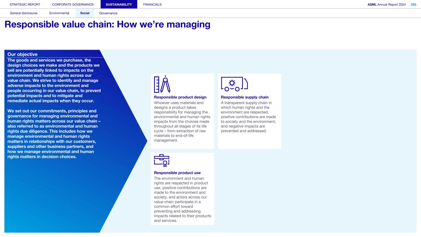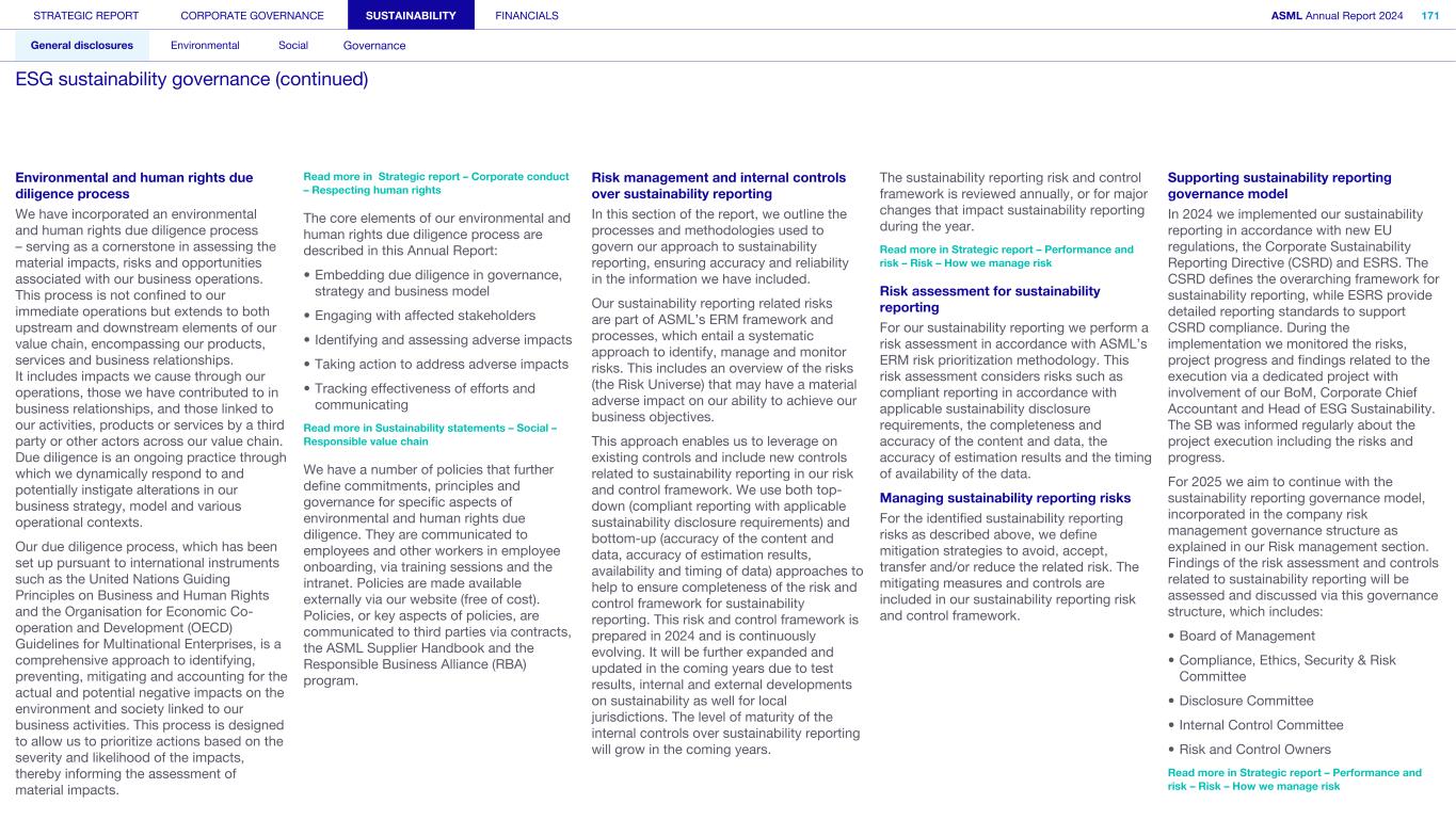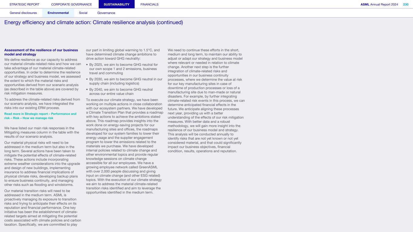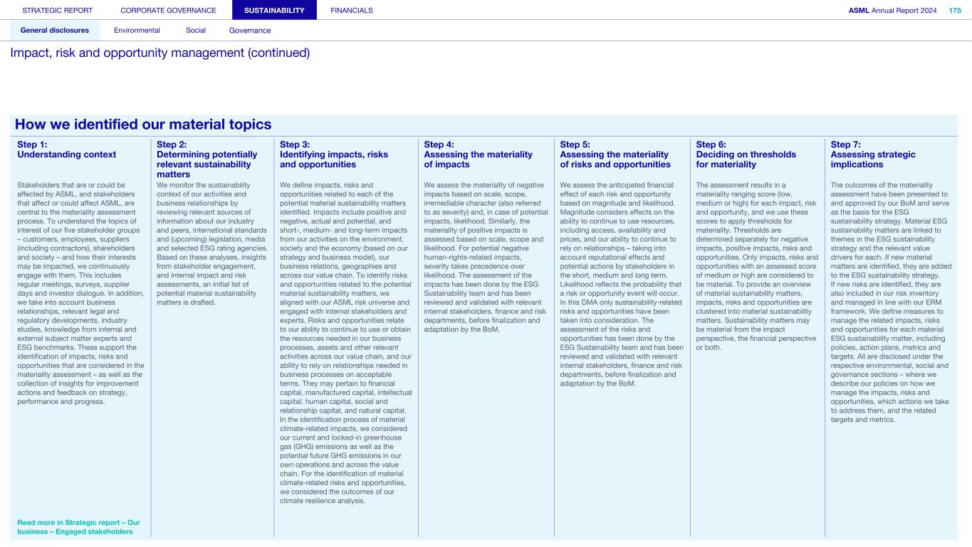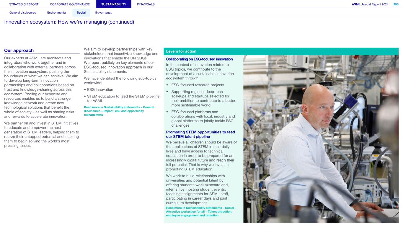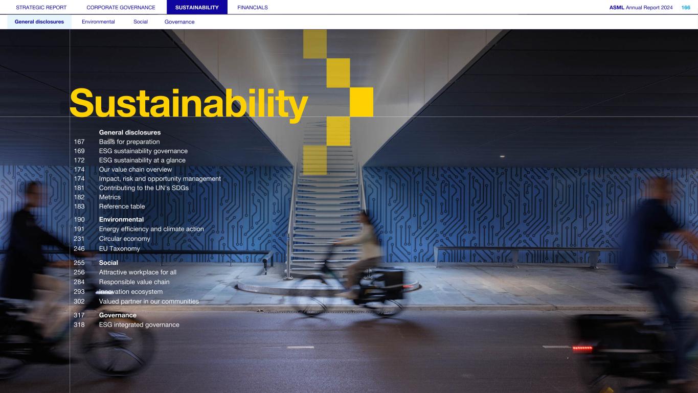 战略报告公司治理可持续发展金融学ASML年度报告2024318一般披露环境社会治理ESG综合治理ESG是所有常规、日常决策的一部分,为什么它很重要......对地球来说......对于ASML可持续发展对我们价值链上下的利益相关者都很重要,我们正在一起就ESG驱动思维的重要性建立共同共识。诚信、诚实和透明为我们的整个ESG方法提供了信息,包括我们就业绩做出和披露的决定。作为其中的一部分,为了确保我们能够为我们的利益相关者创造长期价值,我们希望与我们的利益相关者建立良好的关系,支持那些更脆弱的人,确保遵守数据隐私法规,并在ESG主题方面有更多的政治参与。我们的目标是履行我们的责任,并在我们的整个业务中锚定ESG可持续性。稳健的综合治理政策以及对负责任的商业行为和风险管理的持续承诺至关重要。道德和合规是我们可持续发展战略的基础。我们的目标是培养一种公平、透明和包容的文化——在这种文化中,人们感到有能力就使我们的可持续发展转型取得成功所需的变革发表意见。我们的政策影响到不同的利益相关者群体:客户、员工、供应商、股东和整个社会。让他们信任并与这些团体合作,为我们更广泛的ESG战略提供信息很重要:...对于我们的客户,我们的目标是成为值得信赖的供应商。我们制定了公司政策和程序,详细说明了我们的原则和遵守情况,指导我们做出正确的决定并不辜负我们的价值观。...对于我们的员工来说,只有我们培养一种透明和尊重的文化,他们才会感到有能力分享他们的观点——这就是为什么我们的综合治理政策基于我们的公司价值观、宗旨、愿景和使命。...对于我们的供应商我们的目标是告知我们的供应商,以确保我们以合规的方式开展业务,遵守我们经营所在的所有国家的适用法律法规。...对于我们的股东我们的目标是透明地报告,以便我们的股东能够做出明智的决定。...为社会我们的目标是对我们的活动的经济、环境和社会影响以及我们的绩效目标、衡量标准和结果保持透明。阅读更多关于我们的双重重要性流程以及在可持续发展声明中确定的该主题的影响、风险和机会–一般披露–影响、风险和机会管理