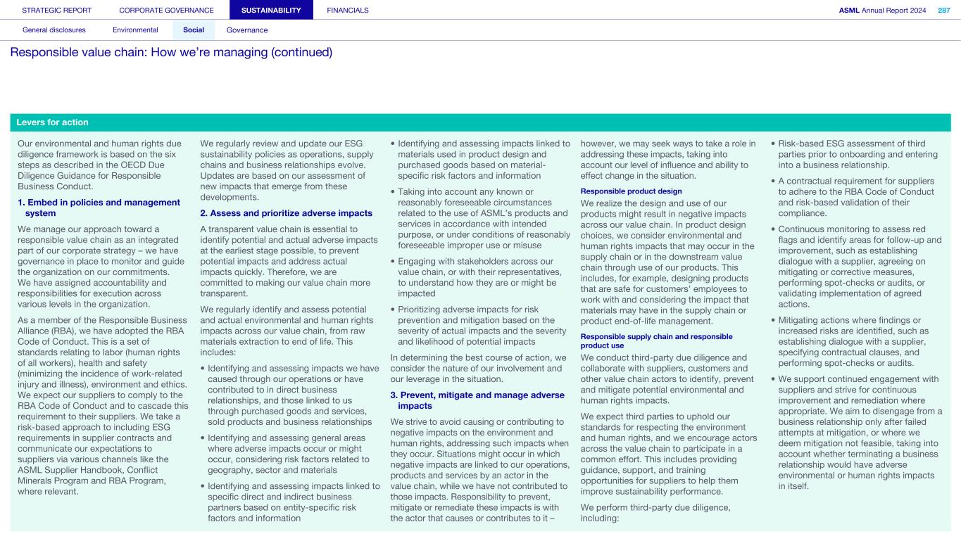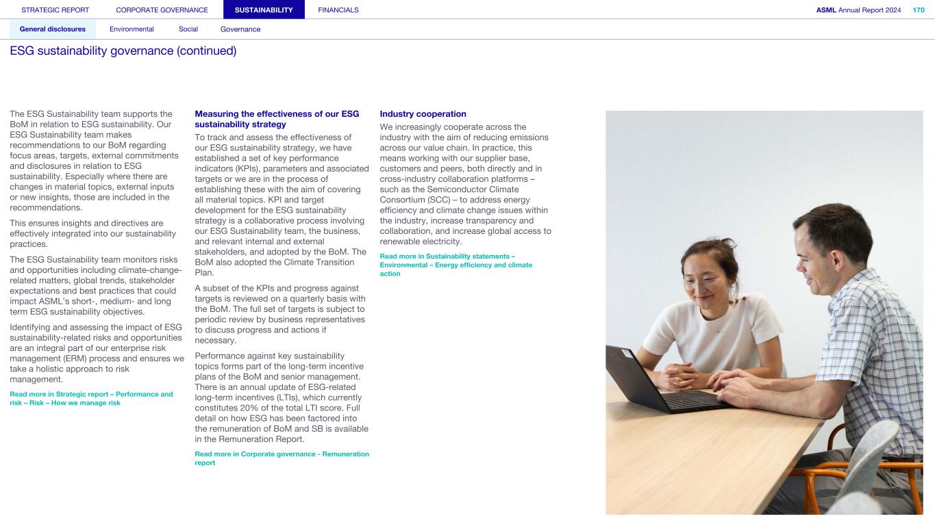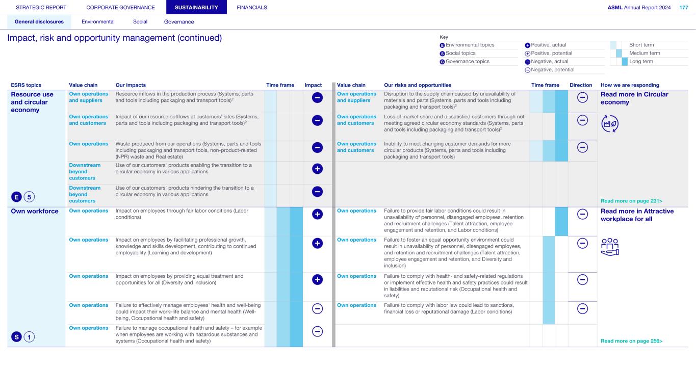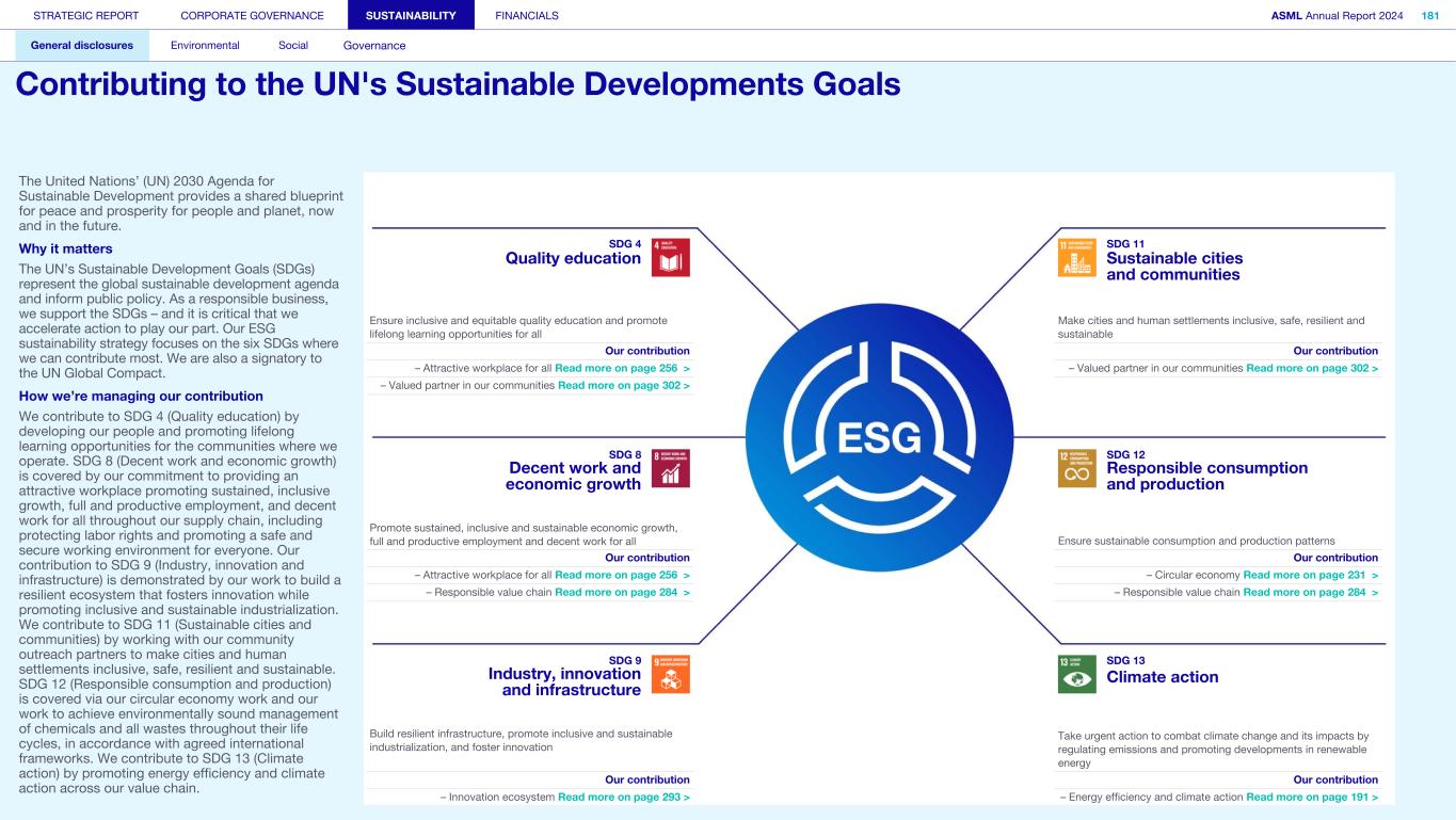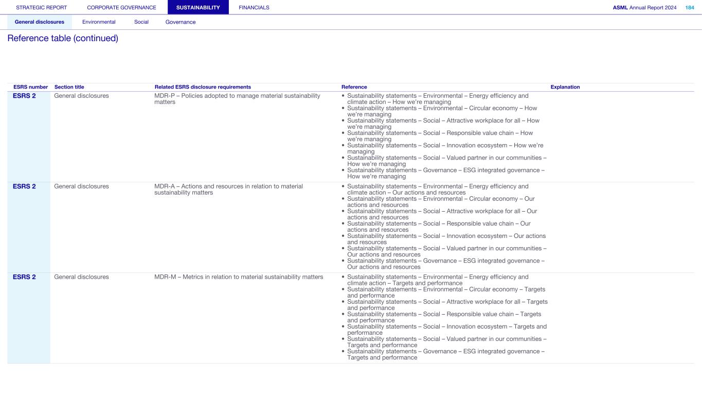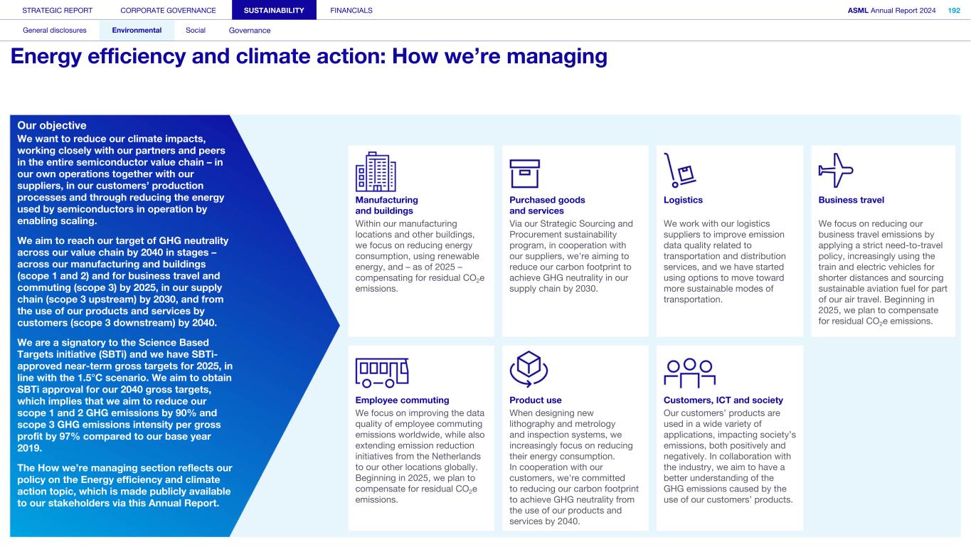 战略报告公司治理可持续发展金融学ASML年度报告2024318一般披露环境社会治理ESG综合治理ESG是所有常规、日常决策的一部分,为什么它很重要......对地球来说......对于ASML可持续发展对我们价值链上下的利益相关者都很重要,我们正在一起就ESG驱动思维的重要性建立共同共识。诚信、诚实和透明为我们的整个ESG方法提供了信息,包括我们就业绩做出和披露的决定。作为其中的一部分,为了确保我们能够为我们的利益相关者创造长期价值,我们希望与我们的利益相关者建立良好的关系,支持那些更脆弱的人,确保遵守数据隐私法规,并在ESG主题方面有更多的政治参与。我们的目标是履行我们的责任,并在我们的整个业务中锚定ESG可持续性。稳健的综合治理政策以及对负责任的商业行为和风险管理的持续承诺至关重要。道德和合规是我们可持续发展战略的基础。我们的目标是培养一种公平、透明和包容的文化——在这种文化中,人们感到有能力就使我们的可持续发展转型取得成功所需的变革发表意见。我们的政策影响到不同的利益相关者群体:客户、员工、供应商、股东和整个社会。让他们信任并与这些团体合作,为我们更广泛的ESG战略提供信息很重要:...对于我们的客户,我们的目标是成为值得信赖的供应商。我们制定了公司政策和程序,详细说明了我们的原则和遵守情况,指导我们做出正确的决定并不辜负我们的价值观。...对于我们的员工来说,只有我们培养一种透明和尊重的文化,他们才会感到有能力分享他们的观点——这就是为什么我们的综合治理政策基于我们的公司价值观、宗旨、愿景和使命。...对于我们的供应商我们的目标是告知我们的供应商,以确保我们以合规的方式开展业务,遵守我们经营所在的所有国家的适用法律法规。...对于我们的股东我们的目标是透明地报告,以便我们的股东能够做出明智的决定。...为社会我们的目标是对我们的活动的经济、环境和社会影响以及我们的绩效目标、衡量标准和结果保持透明。阅读更多关于我们的双重重要性流程以及在可持续发展声明中确定的该主题的影响、风险和机会–一般披露–影响、风险和机会管理