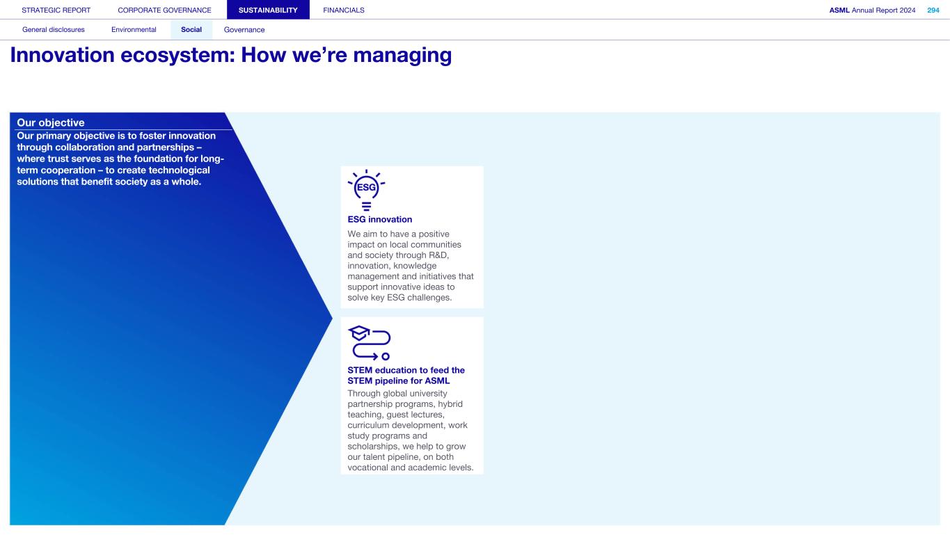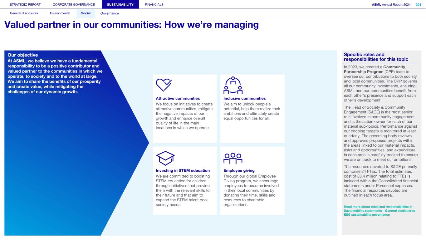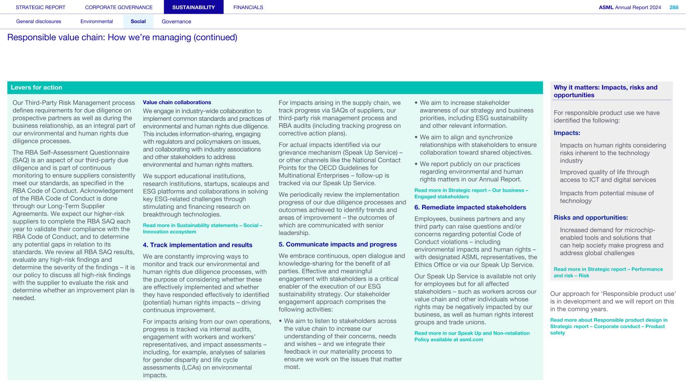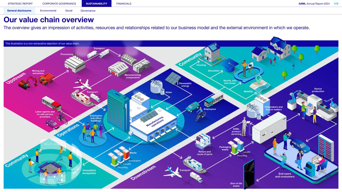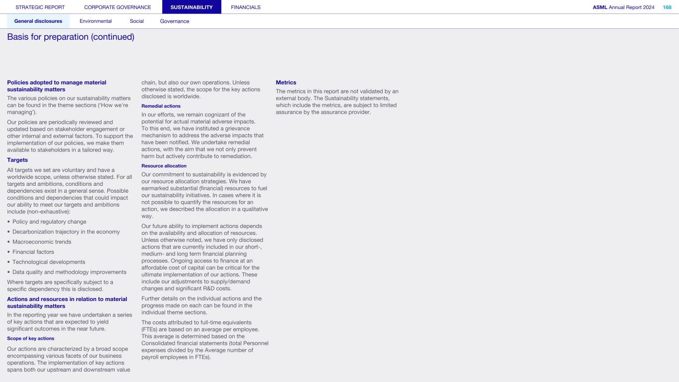 战略报告公司治理可持续发展金融学ASML年度报告2024318一般披露环境社会治理ESG综合治理ESG是所有常规、日常决策的一部分,为什么它很重要......对地球来说......对于ASML可持续发展对我们价值链上下的利益相关者都很重要,我们正在一起就ESG驱动思维的重要性建立共同共识。诚信、诚实和透明为我们的整个ESG方法提供了信息,包括我们就业绩做出和披露的决定。作为其中的一部分,为了确保我们能够为我们的利益相关者创造长期价值,我们希望与我们的利益相关者建立良好的关系,支持那些更脆弱的人,确保遵守数据隐私法规,并在ESG主题方面有更多的政治参与。我们的目标是履行我们的责任,并在我们的整个业务中锚定ESG可持续性。稳健的综合治理政策以及对负责任的商业行为和风险管理的持续承诺至关重要。道德和合规是我们可持续发展战略的基础。我们的目标是培养一种公平、透明和包容的文化——在这种文化中,人们感到有能力就使我们的可持续发展转型取得成功所需的变革发表意见。我们的政策影响到不同的利益相关者群体:客户、员工、供应商、股东和整个社会。让他们信任并与这些团体合作,为我们更广泛的ESG战略提供信息很重要:...对于我们的客户,我们的目标是成为值得信赖的供应商。我们制定了公司政策和程序,详细说明了我们的原则和遵守情况,指导我们做出正确的决定并不辜负我们的价值观。...对于我们的员工来说,只有我们培养一种透明和尊重的文化,他们才会感到有能力分享他们的观点——这就是为什么我们的综合治理政策基于我们的公司价值观、宗旨、愿景和使命。...对于我们的供应商我们的目标是告知我们的供应商,以确保我们以合规的方式开展业务,遵守我们经营所在的所有国家的适用法律法规。...对于我们的股东我们的目标是透明地报告,以便我们的股东能够做出明智的决定。...为社会我们的目标是对我们的活动的经济、环境和社会影响以及我们的绩效目标、衡量标准和结果保持透明。阅读更多关于我们的双重重要性流程以及在可持续发展声明中确定的该主题的影响、风险和机会–一般披露–影响、风险和机会管理