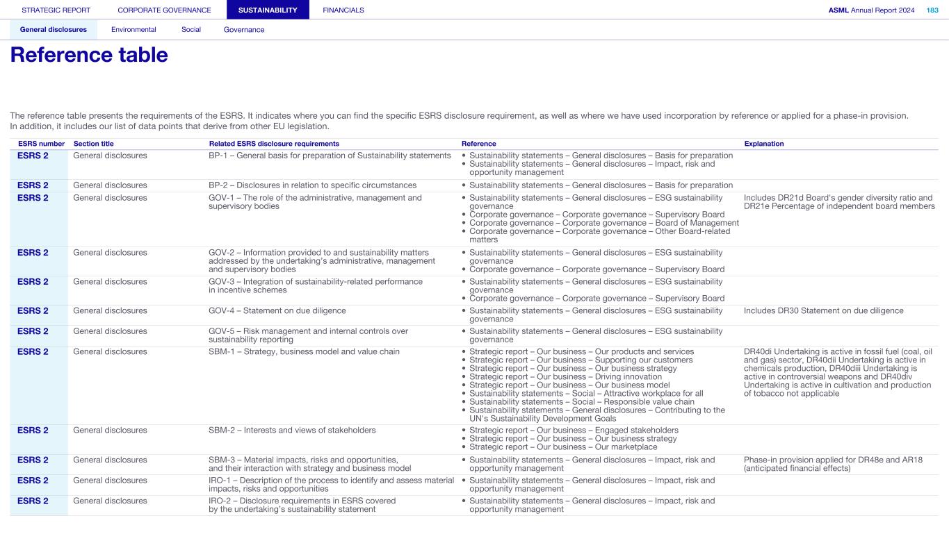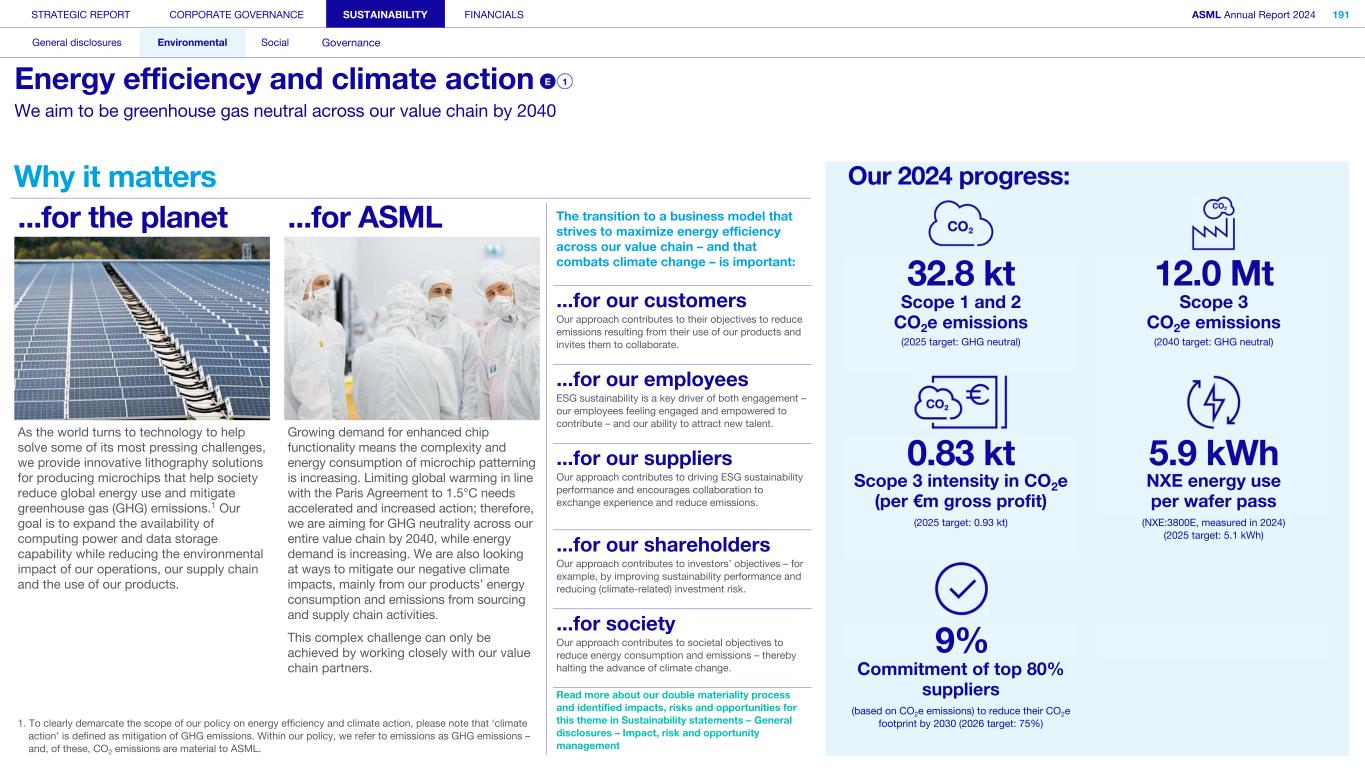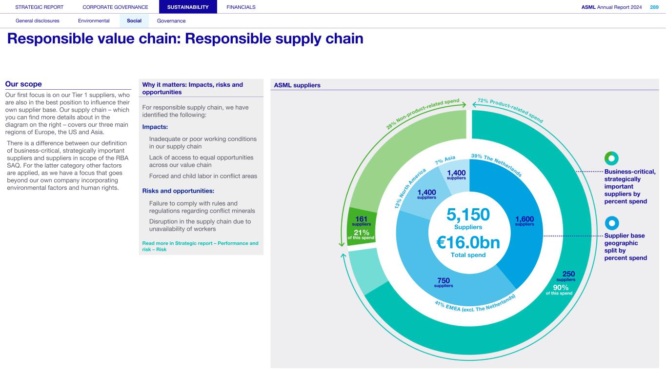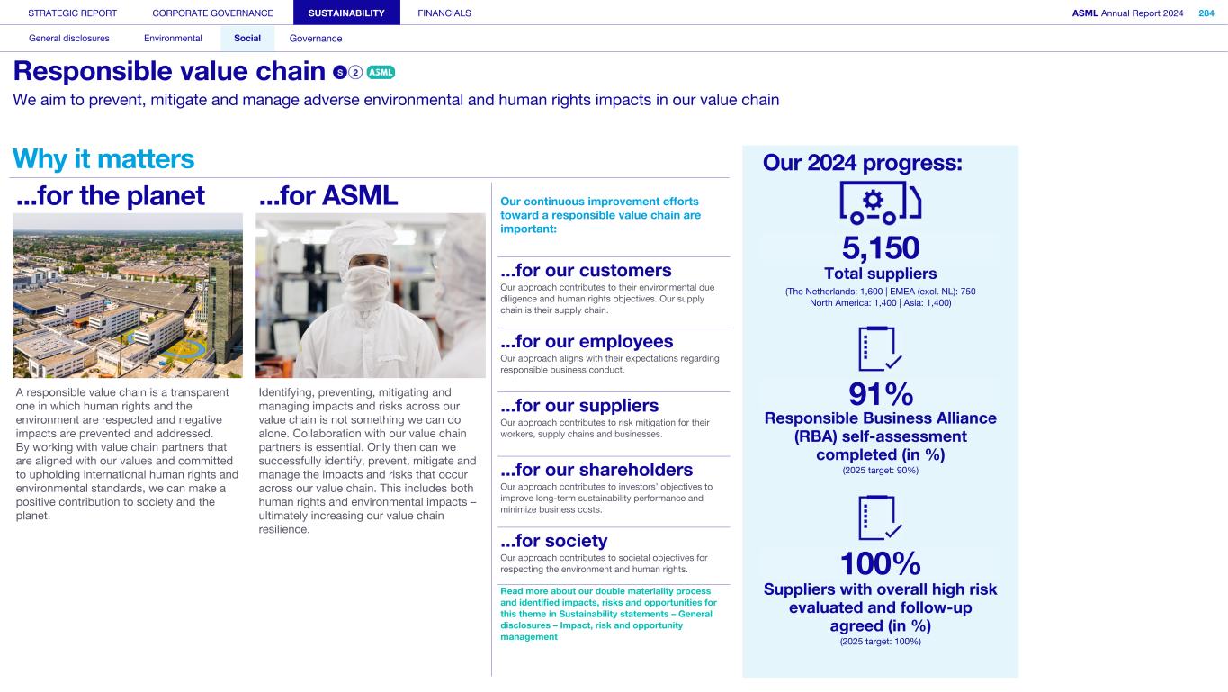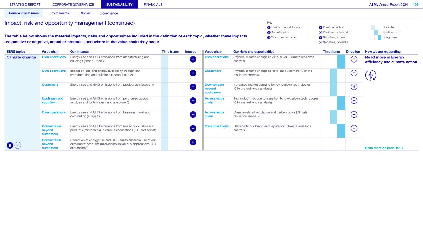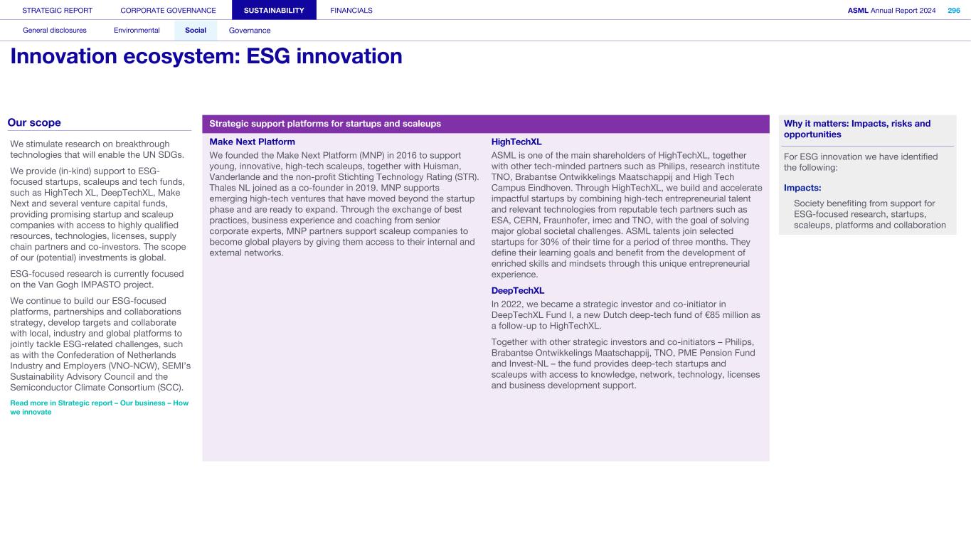 战略报告公司治理可持续发展金融学ASML年度报告2024318一般披露环境社会治理ESG综合治理ESG是所有常规、日常决策的一部分,为什么它很重要......对地球来说......对于ASML可持续发展对我们价值链上下的利益相关者都很重要,我们正在一起就ESG驱动思维的重要性建立共同共识。诚信、诚实和透明为我们的整个ESG方法提供了信息,包括我们就业绩做出和披露的决定。作为其中的一部分,为了确保我们能够为我们的利益相关者创造长期价值,我们希望与我们的利益相关者建立良好的关系,支持那些更脆弱的人,确保遵守数据隐私法规,并在ESG主题方面有更多的政治参与。我们的目标是履行我们的责任,并在我们的整个业务中锚定ESG可持续性。稳健的综合治理政策以及对负责任的商业行为和风险管理的持续承诺至关重要。道德和合规是我们可持续发展战略的基础。我们的目标是培养一种公平、透明和包容的文化——在这种文化中,人们感到有能力就使我们的可持续发展转型取得成功所需的变革发表意见。我们的政策影响到不同的利益相关者群体:客户、员工、供应商、股东和整个社会。让他们信任并与这些团体合作,为我们更广泛的ESG战略提供信息很重要:...对于我们的客户,我们的目标是成为值得信赖的供应商。我们制定了公司政策和程序,详细说明了我们的原则和遵守情况,指导我们做出正确的决定并不辜负我们的价值观。...对于我们的员工来说,只有我们培养一种透明和尊重的文化,他们才会感到有能力分享他们的观点——这就是为什么我们的综合治理政策基于我们的公司价值观、宗旨、愿景和使命。...对于我们的供应商我们的目标是告知我们的供应商,以确保我们以合规的方式开展业务,遵守我们经营所在的所有国家的适用法律法规。...对于我们的股东我们的目标是透明地报告,以便我们的股东能够做出明智的决定。...为社会我们的目标是对我们的活动的经济、环境和社会影响以及我们的绩效目标、衡量标准和结果保持透明。阅读更多关于我们的双重重要性流程以及在可持续发展声明中确定的该主题的影响、风险和机会–一般披露–影响、风险和机会管理