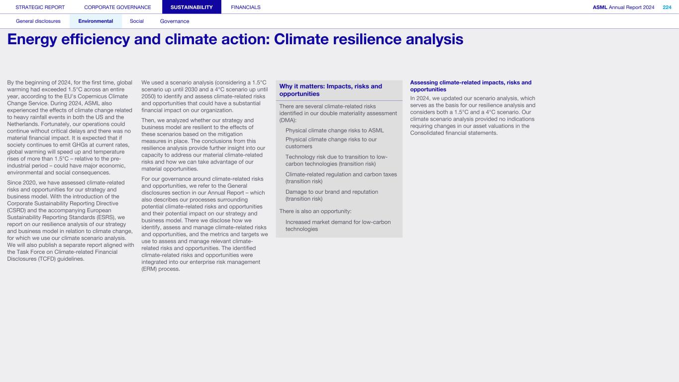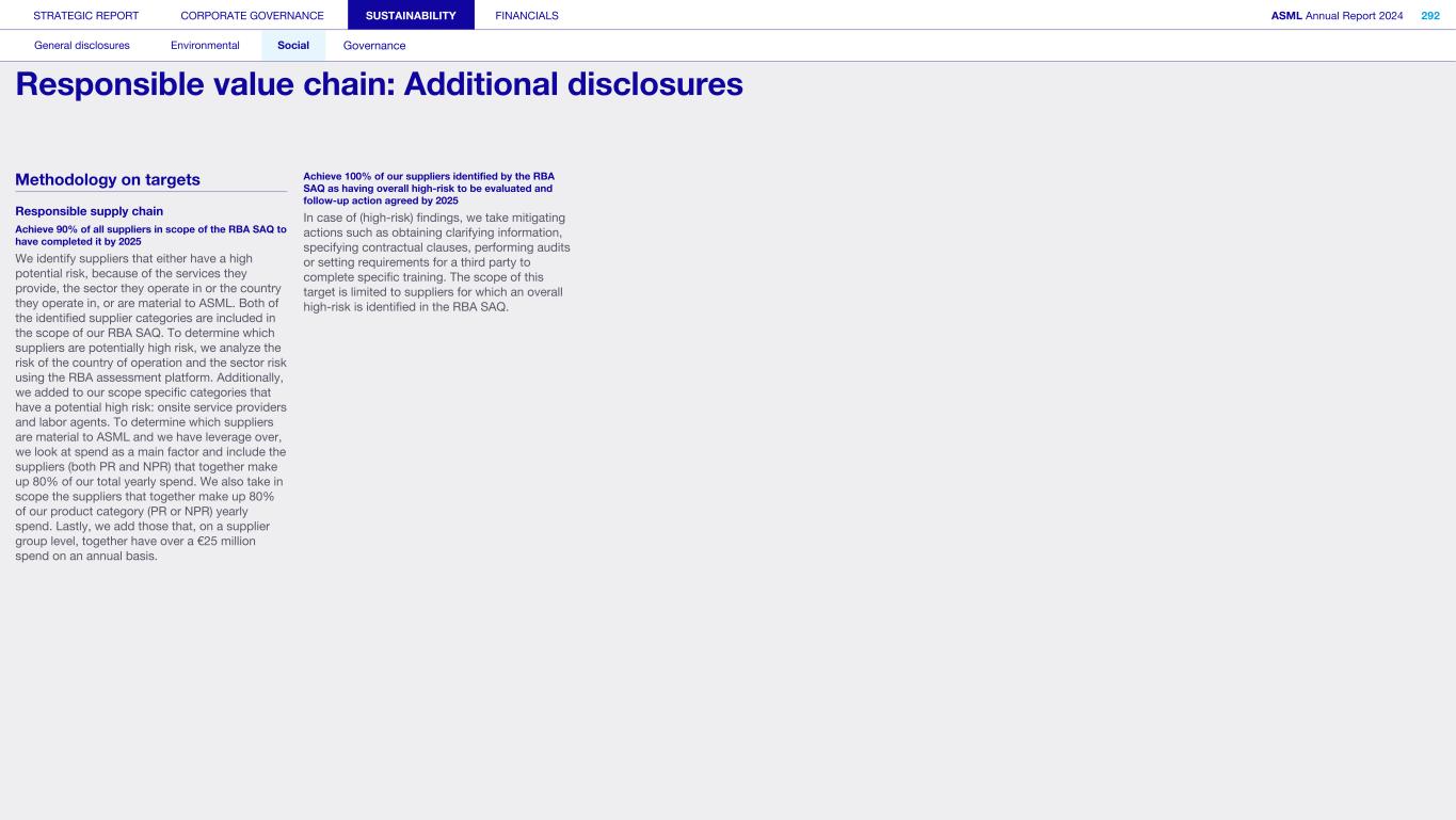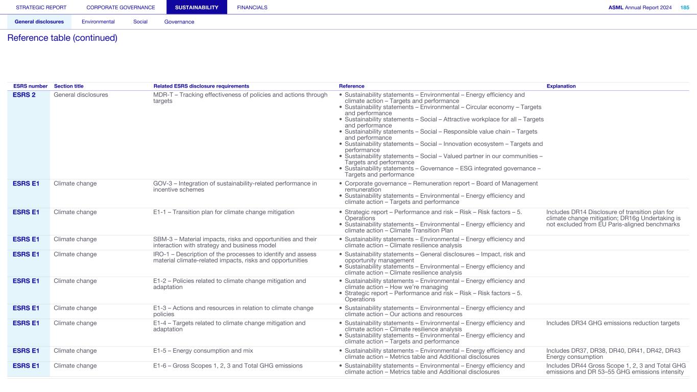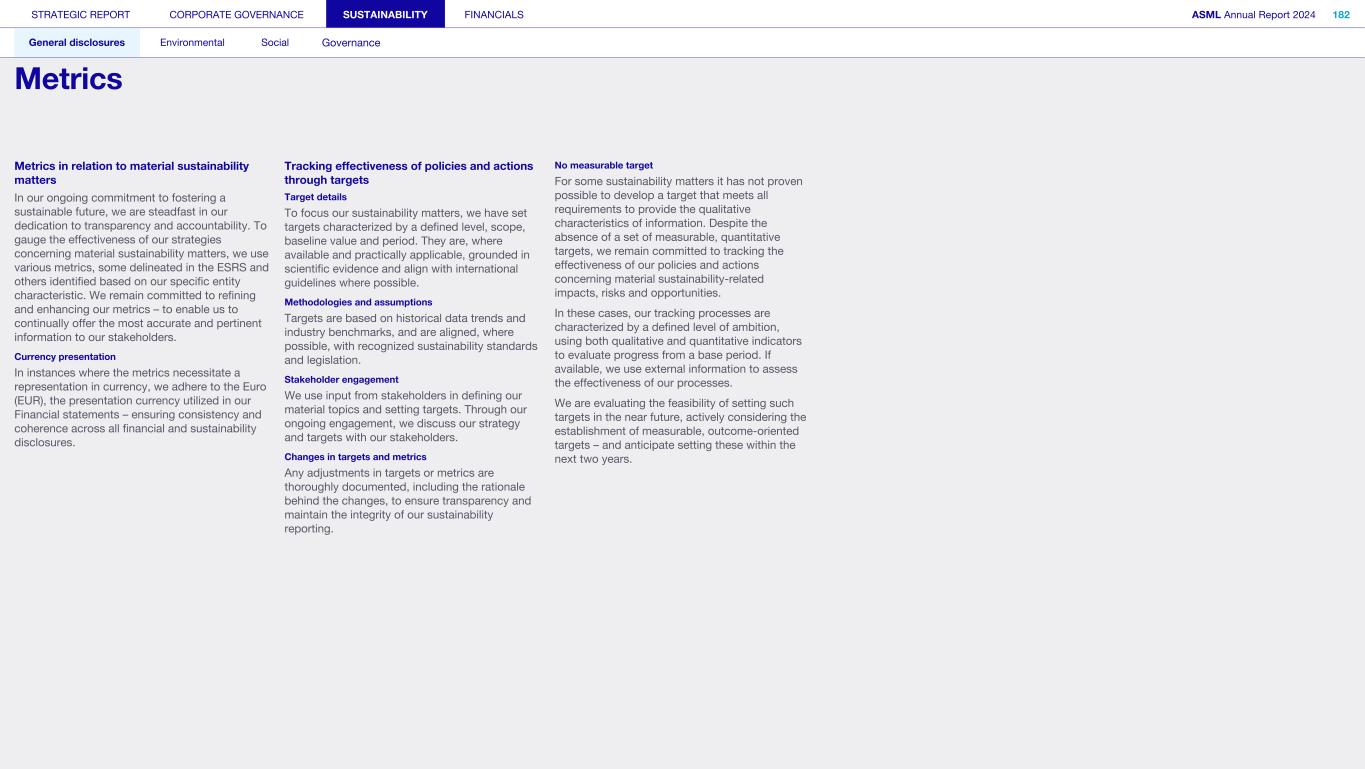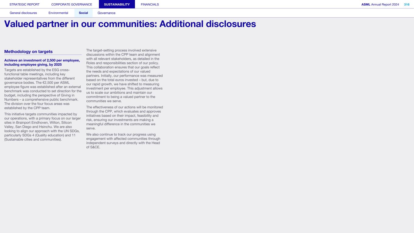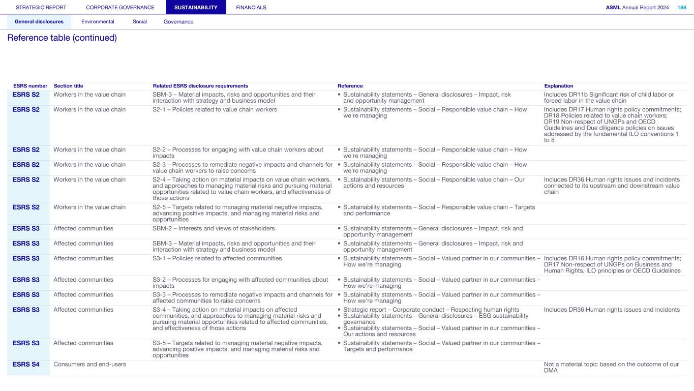 战略报告公司治理可持续发展金融学ASML年度报告2024318一般披露环境社会治理ESG综合治理ESG是所有常规、日常决策的一部分,为什么它很重要......对地球来说......对于ASML可持续发展对我们价值链上下的利益相关者都很重要,我们正在一起就ESG驱动思维的重要性建立共同共识。诚信、诚实和透明为我们的整个ESG方法提供了信息,包括我们就业绩做出和披露的决定。作为其中的一部分,为了确保我们能够为我们的利益相关者创造长期价值,我们希望与我们的利益相关者建立良好的关系,支持那些更脆弱的人,确保遵守数据隐私法规,并在ESG主题方面有更多的政治参与。我们的目标是履行我们的责任,并在我们的整个业务中锚定ESG可持续性。稳健的综合治理政策以及对负责任的商业行为和风险管理的持续承诺至关重要。道德和合规是我们可持续发展战略的基础。我们的目标是培养一种公平、透明和包容的文化——在这种文化中,人们感到有能力就使我们的可持续发展转型取得成功所需的变革发表意见。我们的政策影响到不同的利益相关者群体:客户、员工、供应商、股东和整个社会。让他们信任并与这些团体合作,为我们更广泛的ESG战略提供信息很重要:...对于我们的客户,我们的目标是成为值得信赖的供应商。我们制定了公司政策和程序,详细说明了我们的原则和遵守情况,指导我们做出正确的决定并不辜负我们的价值观。...对于我们的员工来说,只有我们培养一种透明和尊重的文化,他们才会感到有能力分享他们的观点——这就是为什么我们的综合治理政策基于我们的公司价值观、宗旨、愿景和使命。...对于我们的供应商我们的目标是告知我们的供应商,以确保我们以合规的方式开展业务,遵守我们经营所在的所有国家的适用法律法规。...对于我们的股东我们的目标是透明地报告,以便我们的股东能够做出明智的决定。...为社会我们的目标是对我们的活动的经济、环境和社会影响以及我们的绩效目标、衡量标准和结果保持透明。阅读更多关于我们的双重重要性流程以及在可持续发展声明中确定的该主题的影响、风险和机会–一般披露–影响、风险和机会管理