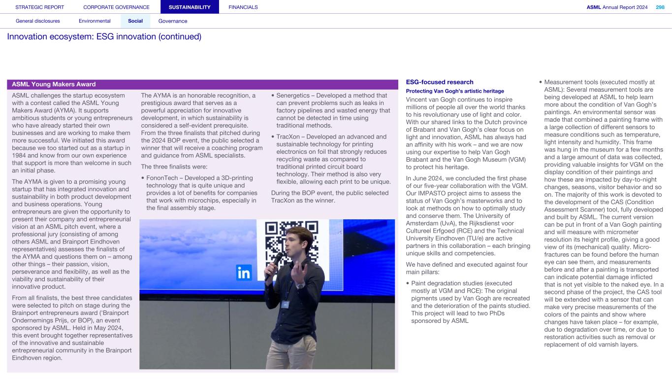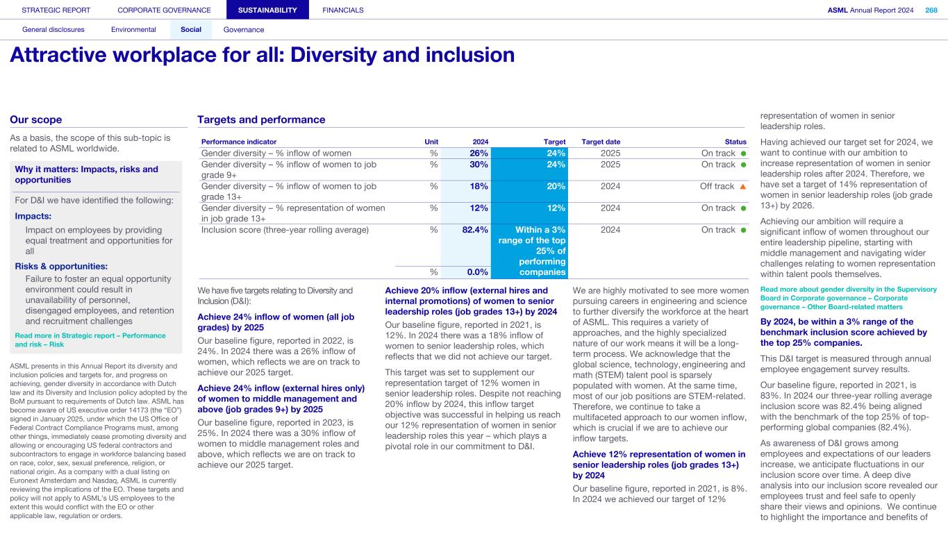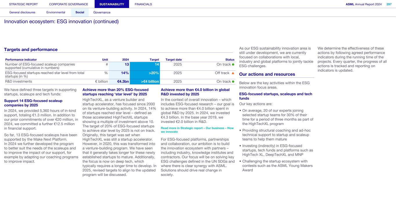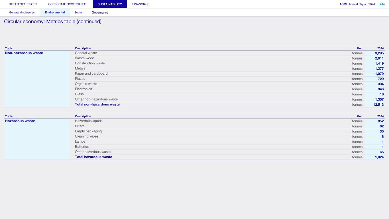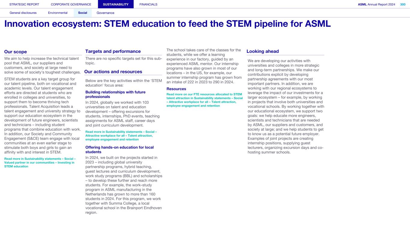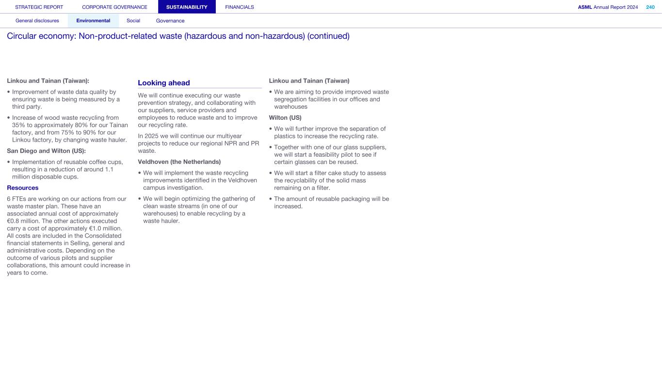 战略报告公司治理可持续发展金融学ASML年度报告2024318一般披露环境社会治理ESG综合治理ESG是所有常规、日常决策的一部分,为什么它很重要......对地球来说......对于ASML可持续发展对我们价值链上下的利益相关者都很重要,我们正在一起就ESG驱动思维的重要性建立共同共识。诚信、诚实和透明为我们的整个ESG方法提供了信息,包括我们就业绩做出和披露的决定。作为其中的一部分,为了确保我们能够为我们的利益相关者创造长期价值,我们希望与我们的利益相关者建立良好的关系,支持那些更脆弱的人,确保遵守数据隐私法规,并在ESG主题方面有更多的政治参与。我们的目标是履行我们的责任,并在我们的整个业务中锚定ESG可持续性。稳健的综合治理政策以及对负责任的商业行为和风险管理的持续承诺至关重要。道德和合规是我们可持续发展战略的基础。我们的目标是培养一种公平、透明和包容的文化——在这种文化中,人们感到有能力就使我们的可持续发展转型取得成功所需的变革发表意见。我们的政策影响到不同的利益相关者群体:客户、员工、供应商、股东和整个社会。让他们信任并与这些团体合作,为我们更广泛的ESG战略提供信息很重要:...对于我们的客户,我们的目标是成为值得信赖的供应商。我们制定了公司政策和程序,详细说明了我们的原则和遵守情况,指导我们做出正确的决定并不辜负我们的价值观。...对于我们的员工来说,只有我们培养一种透明和尊重的文化,他们才会感到有能力分享他们的观点——这就是为什么我们的综合治理政策基于我们的公司价值观、宗旨、愿景和使命。...对于我们的供应商我们的目标是告知我们的供应商,以确保我们以合规的方式开展业务,遵守我们经营所在的所有国家的适用法律法规。...对于我们的股东我们的目标是透明地报告,以便我们的股东能够做出明智的决定。...为社会我们的目标是对我们的活动的经济、环境和社会影响以及我们的绩效目标、衡量标准和结果保持透明。阅读更多关于我们的双重重要性流程以及在可持续发展声明中确定的该主题的影响、风险和机会–一般披露–影响、风险和机会管理