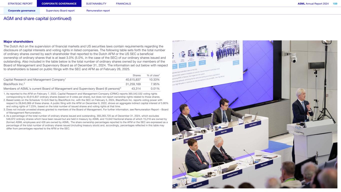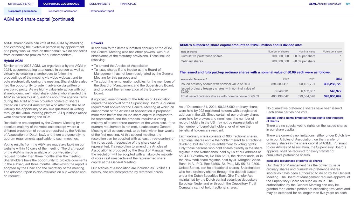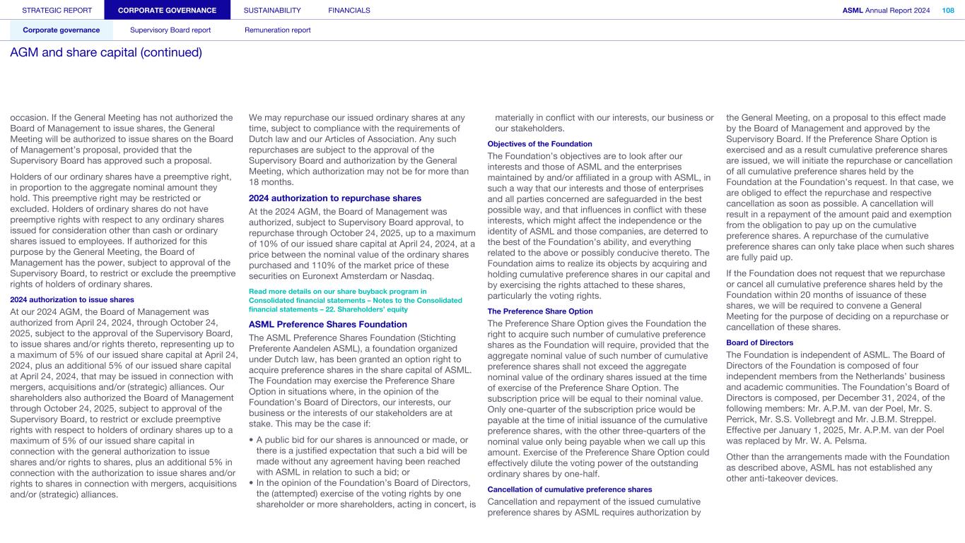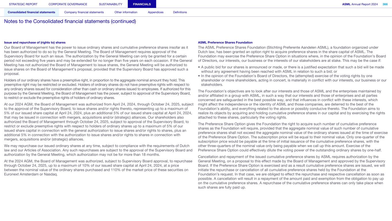 发行和回购(权利)股份我们的管理委员会有权发行普通股和累积优先股,只要它已获股东大会授权这样做。管理委员会要求监事会批准此类问题。股东大会的授权只可授予不超过五年的特定期限,每次可延长不超过五年。如果股东大会未授权管理委员会发行股票,则股东大会将被授权根据管理委员会的提议发行股票,前提是监事会已批准该提议。我们普通股的持有人拥有优先购买权,与他们持有的名义总额成比例。这一优先购买权可能会受到限制或排除。普通股股东对除现金或向员工发行的普通股以外的任何为对价而发行的普通股不享有优先购买权。如果股东大会为此目的授权,管理委员会有权在监事会批准的情况下限制或排除普通股股东的优先购买权。在我们的2024年股东周年大会上,管理委员会获授权在2024年4月24日至2025年10月24日期间,在获得监事会批准的情况下,发行股份和/或权利,最多相当于我们在2024年4月24日已发行股本的5%,加上我们在2024年4月24日已发行股本的额外5%,这可能与合并、收购和/或(战略)联盟有关。我们的股东还授权管理委员会在2025年10月24日之前,在获得监事会批准的情况下,就发行股份和/或股份权利的一般授权限制或排除普通股持有人的优先购买权,最高不超过我们已发行股本的5%,加上与发行股份和/或与合并、收购和/或(战略)联盟有关的股份和/或股份权利的授权有关的额外5%。我们可以随时回购我们已发行的普通股,但须遵守荷兰法律和我们的公司章程的要求。任何此类回购须经监事会批准和股东大会授权,授权期限不得超过18个月。在2024年年度股东大会上,经监事会批准,管理委员会被授权在2025年10月24日之前回购,最高可达2024年4月24日我们已发行股本的10%,回购价格介于所购买普通股的面值和这些证券在阿姆斯特丹泛欧交易所或纳斯达克市场价格的110%之间。ASML优先股基金会ASML优先股基金会(Stichting Preferente Aandelen ASML)是一家根据荷兰法律组建的基金会,该基金会已被授予收购ASML股本中优先股的选择权。在基金会董事会认为我们的利益、我们的业务或我们的利益相关者的利益受到威胁的情况下,基金会可以行使优先股期权。在以下情况下可能会出现这种情况:•宣布或进行对我们股票的公开投标,或有理由预期将在未与ASML就此类投标达成任何协议的情况下进行此类投标;或•基金会董事会认为,一个股东或多个股东作为一致行动人(试图)行使投票权与我们的利益、我们的业务或我们的利益相关者存在重大冲突。本基金会的目标是照顾我们以及ASML以及由ASML一个集团维持和/或附属于该集团的企业的利益,从而以最佳方式维护我们以及企业和有关各方的利益,并尽本基金会所能阻止与这些利益发生冲突、可能影响ASML和那些公司的独立性或身份的影响,以及与上述有关或可能有利于此的一切事情。基金会旨在通过收购和持有我们资本中的累积优先股以及行使这些股份附带的权利,特别是投票权来实现其目标。优先股期权赋予基金会获得基金会要求的累积优先股数量的权利, 但该等累积优先股数目的总面值不得超过优先股购股权行使时已发行普通股的总面值。认购价格将与其名义价值相等。累计优先股首次发行时仅需支付认购价的四分之一,而仅当我们调出这一金额时才需支付票面价值的其他四分之三。行使优先购股权可有效稀释已发行普通股的投票权的二分之一。根据管理委员会就此提出并经监事会批准的提议,ASML注销和偿还已发行的累计优先股需要获得股东大会的授权。如果优先股期权被行使并因此发行了累积优先股,我们将应基金会的要求启动回购或注销基金会持有的所有累积优先股。在这种情况下,我们有义务尽快实施回购和相应注销。注销将导致偿还已支付的金额,并免除对累计优先股的清偿义务。累计优先股的回购只能在该等股份全部缴足时进行。战略报告公司治理可持续发展财务ASML年度报告2024366合并财务报表公司财务报表其他信息附录定义合并财务报表附注(续)