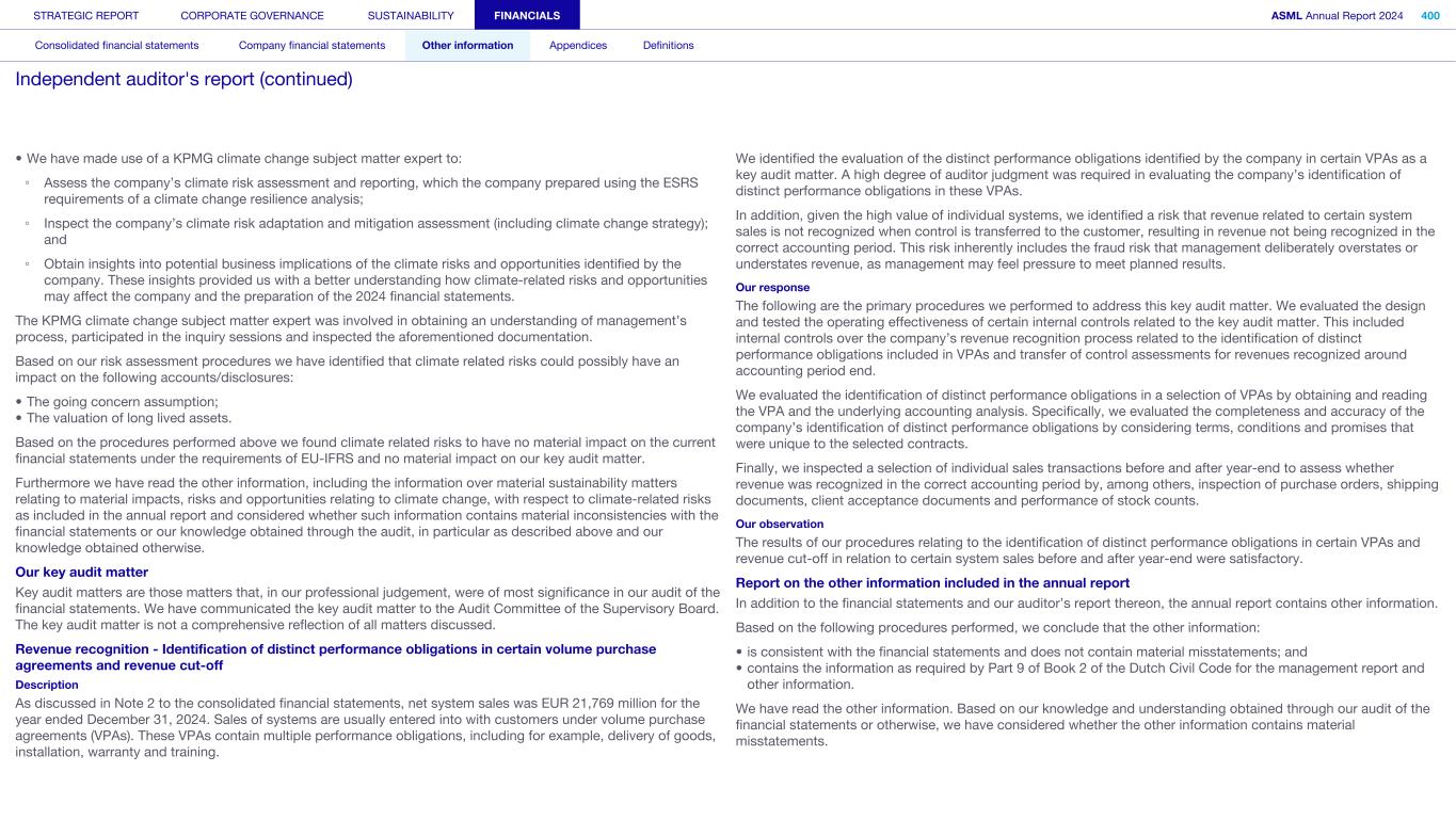 •我们利用毕马威一位气候变化主题专家进行了以下工作:⑤评估公司的气候风险评估和报告,这些评估和报告是公司使用气候变化复原力分析的ESRS要求准备的;⑤检查公司的气候风险适应和缓解评估(包括气候变化战略);⑤深入了解公司确定的气候风险和机遇的潜在业务影响。这些见解使我们更好地了解与气候相关的风险和机遇可能如何影响公司以及2024年财务报表的编制。毕马威气候变化主题专家参与了解管理层的流程,参加了询问会议并检查了上述文件。根据我们的风险评估程序,我们已确定气候相关风险可能对以下账目/披露产生影响:•持续经营假设;•长期资产的估值。根据上述程序,我们发现气候相关风险根据欧盟-国际财务报告准则的要求对当前财务报表没有实质性影响,对我们的关键审计事项也没有实质性影响。此外,我们还阅读了其他信息,包括与气候变化相关的重大影响、风险和机遇相关的重大可持续性事项的信息,这些信息涉及年度报告中包含的与气候相关的风险,并考虑了这些信息是否与财务报表或我们通过审计获得的知识存在重大不一致之处,特别是如上文所述以及我们以其他方式获得的知识。我们的关键审计事项关键审计事项是根据我们的职业判断,在我们对财务报表的审计中最为重要的事项。我们已将关键审计事项传达至监事会审计委员会。关键审计事项并不是所有讨论事项的全面反映。收入确认-确定某些批量采购协议中的不同履约义务和收入截止说明如综合财务报表附注2所述,截至2024年12月31日止年度,系统净销售额为21.769亿欧元。系统的销售通常是根据批量采购协议(VPA)与客户达成的。这些VPA包含多项履约义务,例如,货物交付、安装、保修和培训。我们将公司在某些VPA中确定的不同履约义务的评估确定为关键审计事项。在评估公司在这些VPA中对不同履约义务的识别时,需要有高度的审计师判断。此外,鉴于个别系统的价值较高,我们识别了一种风险,即当控制权转移给客户时,与某些系统销售相关的收入未被确认,从而导致收入未能在正确的会计期间内确认。这种风险本质上包括管理层故意夸大或低估收入的欺诈风险,因为管理层可能会感到满足计划结果的压力。我们的回应以下是我们为处理这一关键审计事项而执行的主要程序。我们对设计进行了评估,并测试了与关键审计事项相关的某些内部控制的运行有效性。这包括对公司收入确认流程的内部控制,这些流程涉及识别VPA中包含的不同履约义务,以及转移对会计期末前后确认的收入的控制评估。我们通过获取和读取VPA和底层会计分析,评估了在选定的VPA中对不同履约义务的识别。具体而言,我们通过考虑所选合同特有的条款、条件和承诺,评估了公司识别不同履约义务的完整性和准确性。最后,我们检查了年终前后的个别销售交易,以评估收入是否在正确的会计期间确认,其中包括检查采购订单、运输文件、客户验收文件和库存盘点的表现。我们的观察我们有关在某些VPA中确定不同履约义务的程序的结果以及与年底前后某些系统销售相关的收入截止结果是令人满意的。关于年度报告中包含的其他信息的报告除了财务报表和我们的审计报告之外,年度报告中还包含其他信息。基于所执行的以下程序, 我们得出结论,其他信息:•与财务报表一致,不存在重大错报;•包含荷兰民法典第2册第9部分要求的信息,用于管理报告和其他信息。我们已经阅读了其他信息。基于我们通过审计财务报表或其他方式获得的知识和理解,我们考虑了其他信息是否存在重大错报。战略报告公司治理可持续发展财务部ASML年度报告2024 400合并财务报表公司财务报表其他信息附录定义独立审计师报告(续)