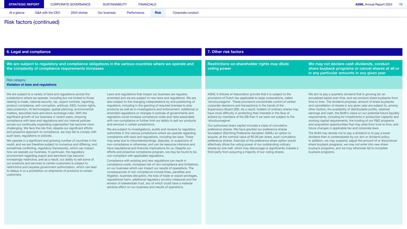 6.合法合规7。其他风险因素我们受制于我们经营所在的各个国家的监管和合规义务,合规要求的复杂性增加对股东权利的限制可能会稀释投票权我们可能不会在任何特定年份宣布现金股息、进行股票回购计划或全部或以任何特定金额注销股票风险类别:违反法律法规我们受制于我们经营所在司法管辖区的各种法律法规,包括但不限于与贸易、国家安全、税务、出口管制、报告、产品合规、反腐败、反垄断、ESG、人权、数据保护、人工智能技术、空间规划、环境事务、证券法和证券交易所规则。随着近年来我们业务的显着增长,在我们不断扩大的组织中确保遵守法律法规和我们的内部政策变得更具挑战性。我们面临的风险是,尽管我们在合规方面做出了重大努力并采取了积极主动的做法,但我们可能无法遵守此类法律、法规或政策。我们在世界上数量众多且不断增加的国家开展业务,因此,我们受到众多且各不相同、有时甚至相互冲突的监管框架的约束,这可能会影响我们的业务运营方式。特别是,有关出口和制裁的监管环境变得越来越严格,因此,我们向某些客户销售我们的某些产品和服务的能力受到限制,需要政府授权,这可能导致延迟或禁止向某些客户运送产品。影响我们业务的法律法规会定期修订,我们将受到新的法律法规的约束。我们还受到监管机构不断变化的解释和定位的影响,包括在为运送产品授予所需的许可证以及在调查和执法方面。额外或修订的法规或政府和监管机构政策的变化可能会增加合规成本和与不合规相关的风险,或进一步限制我们在某些司法管辖区销售我们的产品和服务的能力。我们受到我们经营所在的各个司法管辖区的监管机构关于遵守法律法规(包括税法)的调查、审计和审查。这些可能是由于误解、争议或不遵守或其他方面的怀疑而产生的,并且可能是资源密集型的,并对我们的声誉和财务产生影响。尽管我们做出了努力和积极主动的合规计划,但我们可能会被发现不符合适用的法规。遵守现有法规和新法规可能会导致合规成本、增加不合规风险以及对我们业务的限制,从而影响我们的经营业绩。不遵守规定的后果包括罚款、处罚和诉讼、业务中断、贸易或出口特权的丧失、声誉损害、额外的监管审查措施和利益相关者信任的削弱,其中任何一项都可能对我们的业务和经营业绩产生重大不利影响。ASML的公司章程规定,它受适用于大公司的荷兰法律规定的约束,称为‘structuurregime’。这些规定将某些公司决策和交易的控制权集中在监事会(SB)手中。因此,面对SB成员的行动,普通股持有人可能比我们不受制于‘结构制度’更难保护他们的利益。我们的法定股本包括一类累积优先股。我们已授予我们的优先股基金会(Stichting Preferente Aandelen ASML)一项选择权,以每股面值0.09欧元收购此类累积优先股。行使优先股期权将有效地稀释我们已发行普通股的投票权的二分之一,这可能会阻止或严重阻碍第三方获得我们大多数有投票权的股份。我们的目标是支付随着时间推移(按年计算)不断增长的季度股息,我们不时进行股票回购。任何一年的股息提议、股票回购金额和注销股票取决于(其中包括)可分配利润、留存收益和现金的可获得性、英国央行对我们未来潜在流动性需求的看法,包括对产能和营运资金需求的投资、为我们的研发项目提供资金以及可能不时出现的收购机会, 以及适用的税法和公司法的未来变化。英国央行可能会决定不支付股息或支付低于我们的目标或股息政策预期的股息。此外,我们可能会暂停、调整股票回购计划的金额或终止股票回购计划,我们可能不会进入新的股票回购计划,否则我们可能无法完成回购计划。战略报告公司治理可持续发展财务ASML年度报告202476与CEO的一览问答2024故事我们的业务绩效风险公司行为风险因素(续)