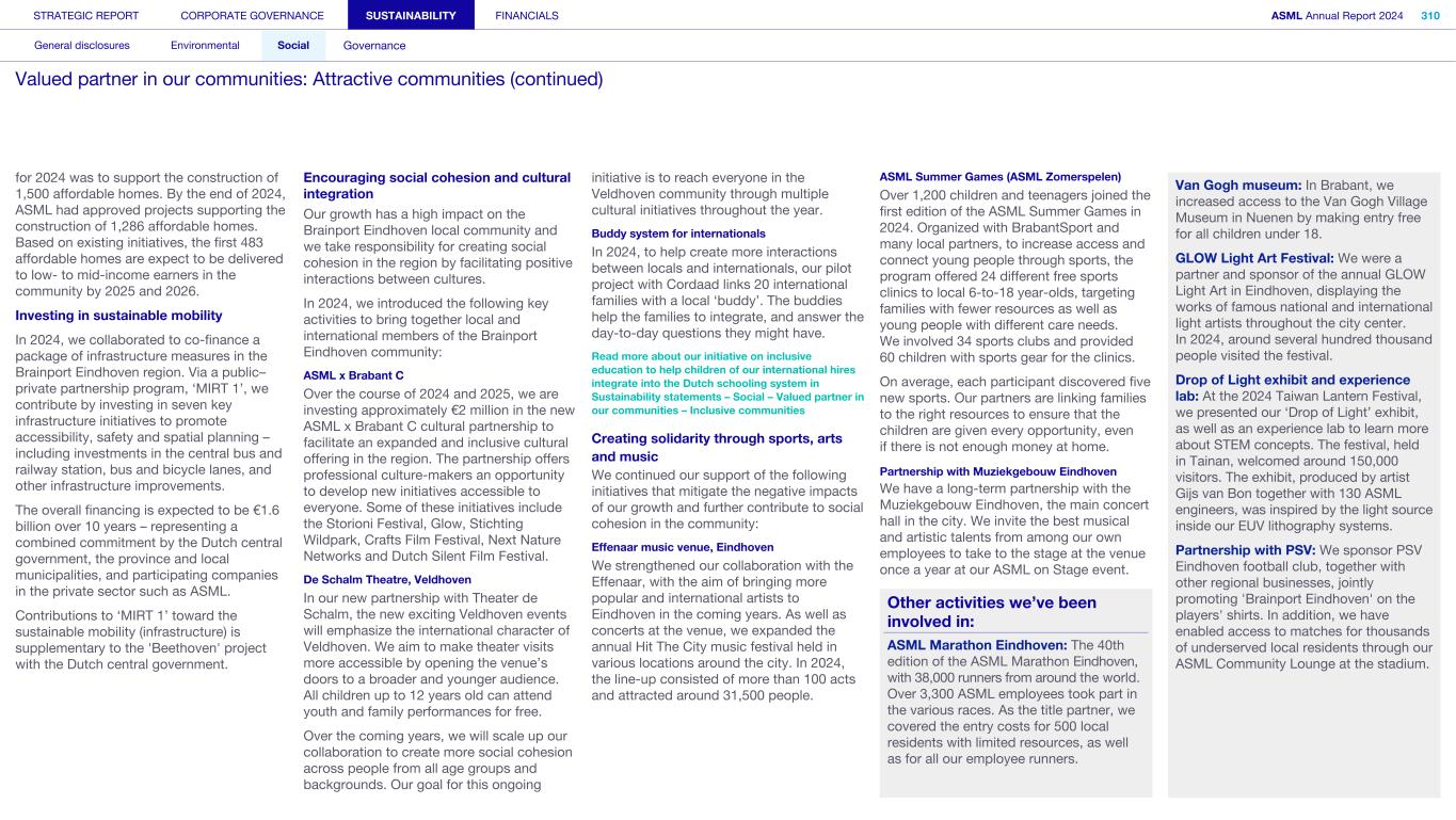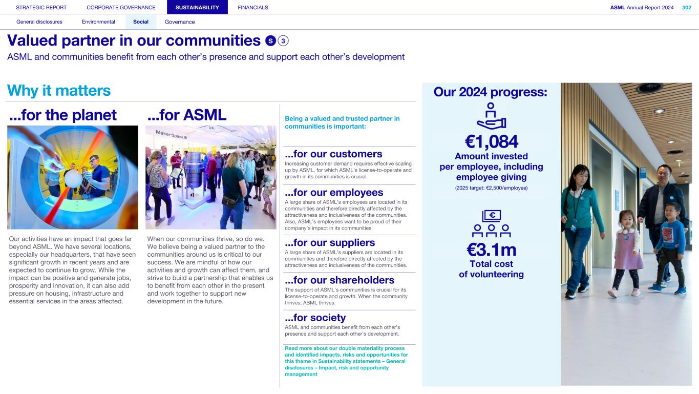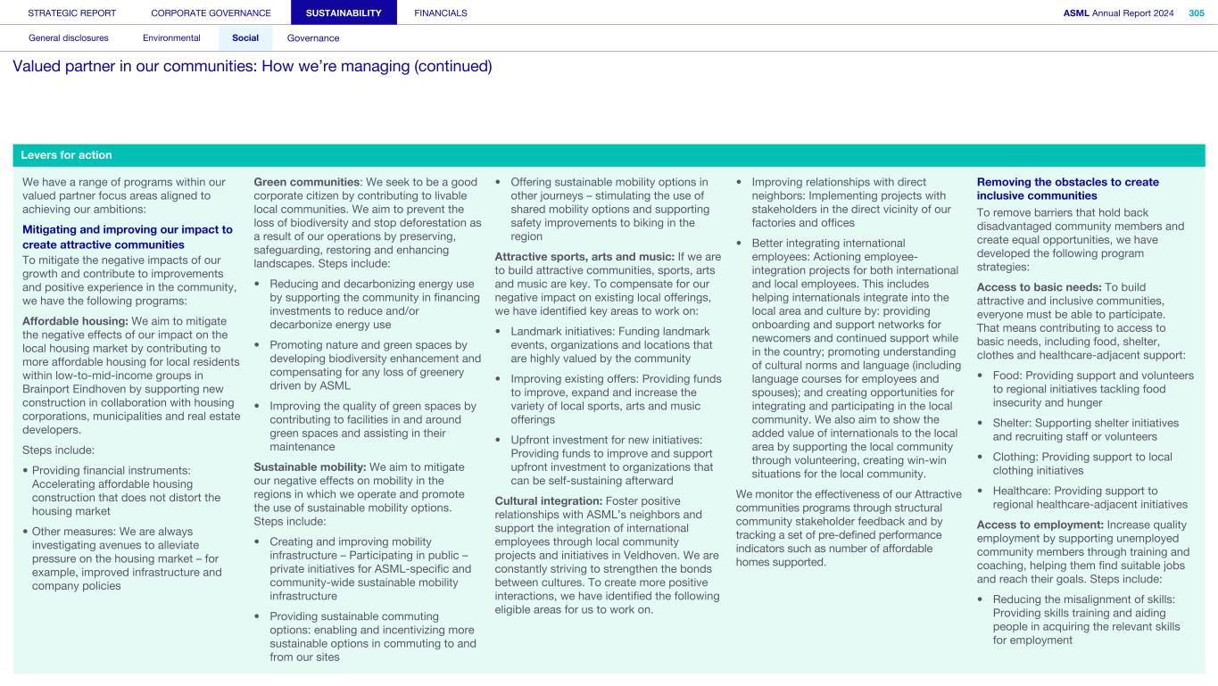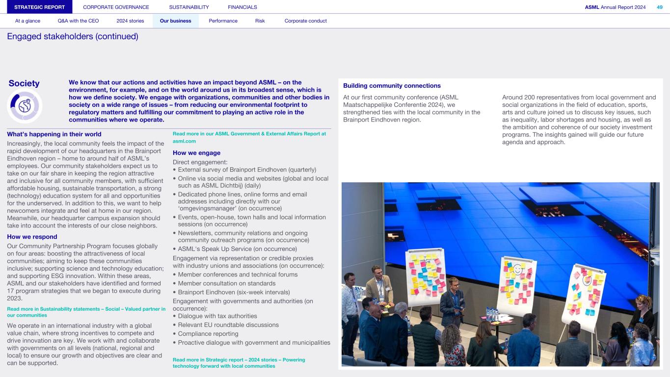 社会我们知道,我们的行为和活动产生的影响超出了ASML ——例如,对环境以及最广泛意义上的我们周围的世界的影响,这就是我们对社会的定义。我们与社会上的组织、社区和其他机构就广泛的问题进行接触——从减少我们的环境足迹到监管事项,以及履行我们在我们经营所在社区发挥积极作用的承诺。在他们的世界中正在发生的事情越来越多地让当地社区感受到我们位于Brainport Eindhoven地区的总部快速发展所带来的影响——这里居住着ASML约一半的员工。我们的社区利益相关者期望我们在保持该地区对所有社区成员的吸引力和包容性方面承担我们的公平份额,提供充足的负担得起的住房、可持续的交通、强大的面向所有人的(技术)教育系统以及服务不足的人的机会。除此之外,我们要帮助新来的人融入我们地区,有宾至如归的感觉。同时,我们的总部校园扩张应该考虑到我们近邻的利益。我们如何应对我们的社区伙伴关系计划在全球范围内重点关注四个领域:提高当地社区的吸引力;旨在保持这些社区的包容性;支持科学技术教育;支持ESG创新。在这些领域内,ASML和我们的利益相关者已经确定并形成了我们在2023年开始执行的17项计划战略。阅读更多可持续发展声明–社会–我们社区中有价值的合作伙伴我们在具有全球价值链的国际行业中运营,在这些行业中,竞争和推动创新的强大激励是关键。我们与各级政府(国家、地区和地方)合作和协作,以确保我们的增长和目标是明确的,并且能够得到支持。更多信息请访问asml.com,了解我们如何参与直接参与的ASML政府和对外事务报告:•对Brainport Eindhoven的外部调查(每季度)•通过社交媒体和网站(全球和本地,如ASML Dichtbij)在线(每天)•专用电话线、在线表格和电子邮件地址,包括直接与我们的‘omgevingsManager’联系(发生时)•活动、开放日、市政厅和当地信息会议(发生时)•时事通讯,社区关系和正在进行的社区外联计划(发生时)• ASML的发声服务(发生时)通过代表或可靠的代理人与行业工会和协会的接触(发生时):•成员会议和技术论坛•成员就标准进行协商• Brainport Eindhoven(每隔六周)与政府和当局的接触(发生时):•与税务当局对话•相关的欧盟圆桌讨论•合规报告•与政府积极对话和市政当局在战略报告中阅读更多– 2024年的故事–与当地社区一起推动技术向前发展战略报告公司治理可持续性财务报告2024年度49与首席执行官的一览问答2024故事我们的业务绩效风险公司行为吸引了利益相关者(续)建立社区联系在我们的第一次社区会议(2024)上,我们加强了与Brainport Eindhoven地区当地社区的联系。来自教育、体育、艺术和文化领域的地方政府和社会组织的约200名代表与我们一起讨论了关键问题,例如不平等、劳动力短缺和住房,以及我们社会投资计划的雄心和连贯性。所获得的见解将指导我们未来的议程和方法。
