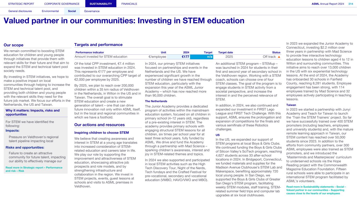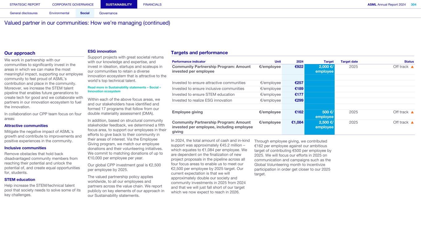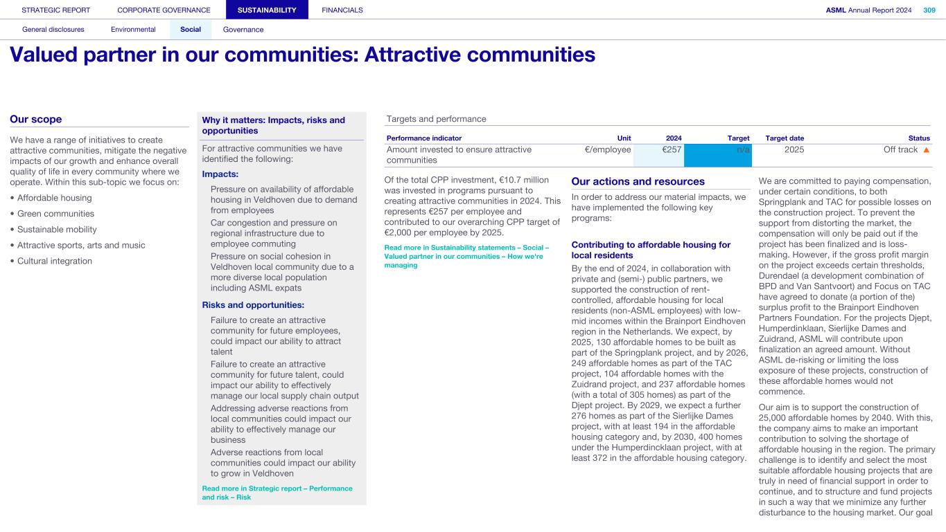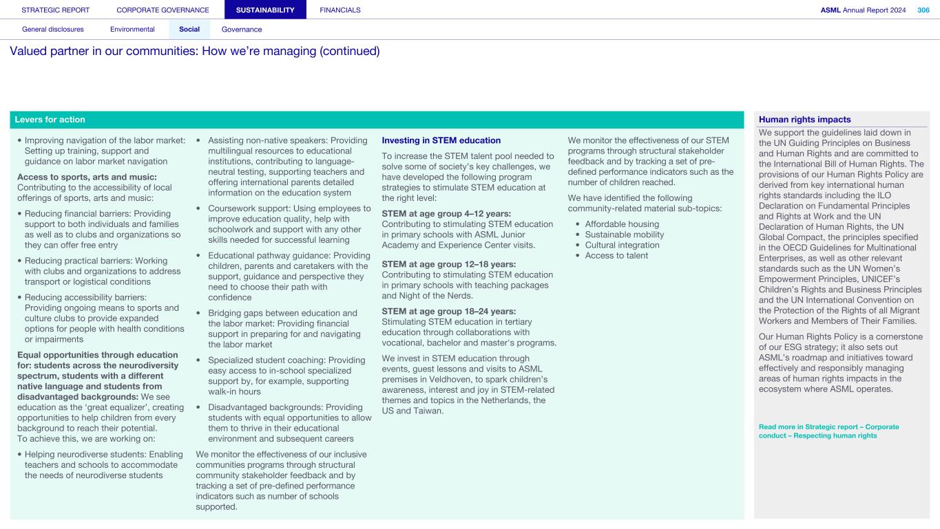 社会我们知道,我们的行为和活动产生的影响超出了ASML ——例如,对环境以及最广泛意义上的我们周围的世界的影响,这就是我们对社会的定义。我们与社会上的组织、社区和其他机构就广泛的问题进行接触——从减少我们的环境足迹到监管事项,以及履行我们在我们经营所在社区发挥积极作用的承诺。在他们的世界中正在发生的事情越来越多地让当地社区感受到我们位于Brainport Eindhoven地区的总部快速发展所带来的影响——这里居住着ASML约一半的员工。我们的社区利益相关者期望我们在保持该地区对所有社区成员的吸引力和包容性方面承担我们的公平份额,提供充足的负担得起的住房、可持续的交通、强大的面向所有人的(技术)教育系统以及服务不足的人的机会。除此之外,我们要帮助新来的人融入我们地区,有宾至如归的感觉。同时,我们的总部校园扩张应该考虑到我们近邻的利益。我们如何应对我们的社区伙伴关系计划在全球范围内重点关注四个领域:提高当地社区的吸引力;旨在保持这些社区的包容性;支持科学技术教育;支持ESG创新。在这些领域内,ASML和我们的利益相关者已经确定并形成了我们在2023年开始执行的17项计划战略。阅读更多可持续发展声明–社会–我们社区中有价值的合作伙伴我们在具有全球价值链的国际行业中运营,在这些行业中,竞争和推动创新的强大激励是关键。我们与各级政府(国家、地区和地方)合作和协作,以确保我们的增长和目标是明确的,并且能够得到支持。更多信息请访问asml.com,了解我们如何参与直接参与的ASML政府和对外事务报告:•对Brainport Eindhoven的外部调查(每季度)•通过社交媒体和网站(全球和本地,如ASML Dichtbij)在线(每天)•专用电话线、在线表格和电子邮件地址,包括直接与我们的‘omgevingsManager’联系(发生时)•活动、开放日、市政厅和当地信息会议(发生时)•时事通讯,社区关系和正在进行的社区外联计划(发生时)• ASML的发声服务(发生时)通过代表或可靠的代理人与行业工会和协会的接触(发生时):•成员会议和技术论坛•成员就标准进行协商• Brainport Eindhoven(每隔六周)与政府和当局的接触(发生时):•与税务当局对话•相关的欧盟圆桌讨论•合规报告•与政府积极对话和市政当局在战略报告中阅读更多– 2024年的故事–与当地社区一起推动技术向前发展战略报告公司治理可持续性财务报告2024年度49与首席执行官的一览问答2024故事我们的业务绩效风险公司行为吸引了利益相关者(续)建立社区联系在我们的第一次社区会议(2024)上,我们加强了与Brainport Eindhoven地区当地社区的联系。来自教育、体育、艺术和文化领域的地方政府和社会组织的约200名代表与我们一起讨论了关键问题,例如不平等、劳动力短缺和住房,以及我们社会投资计划的雄心和连贯性。所获得的见解将指导我们未来的议程和方法。